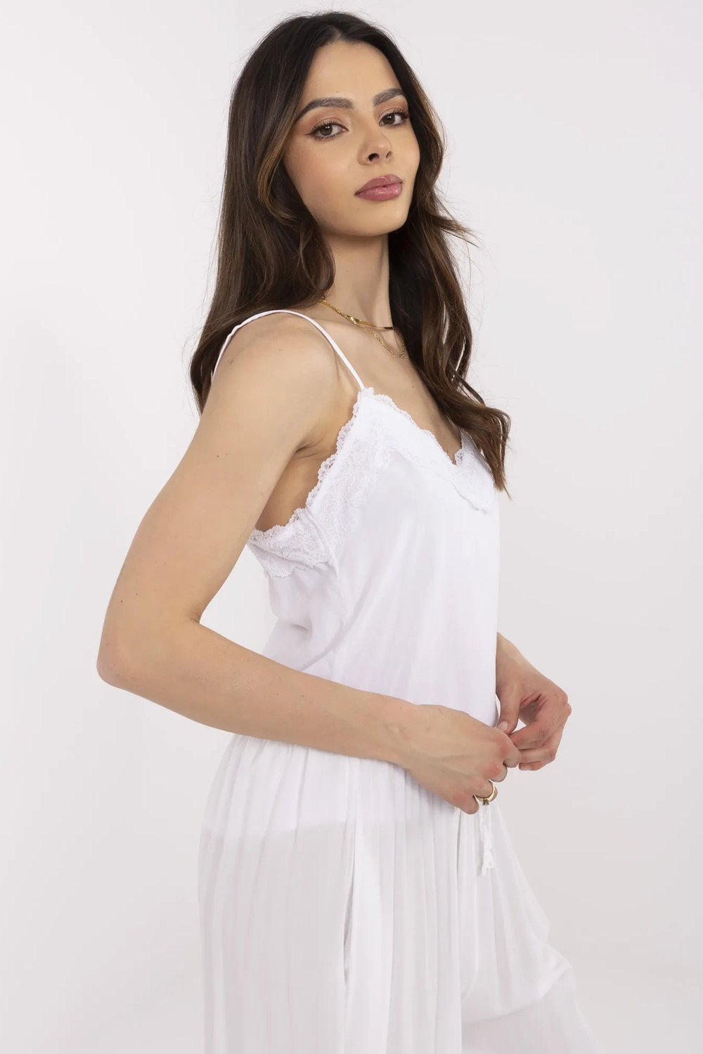 Modele valkā S izmēru. Modeļa izmēri: augums 175 cm, krūtis 90 cm, viduklis 66 cm, gurni 94 cm.
