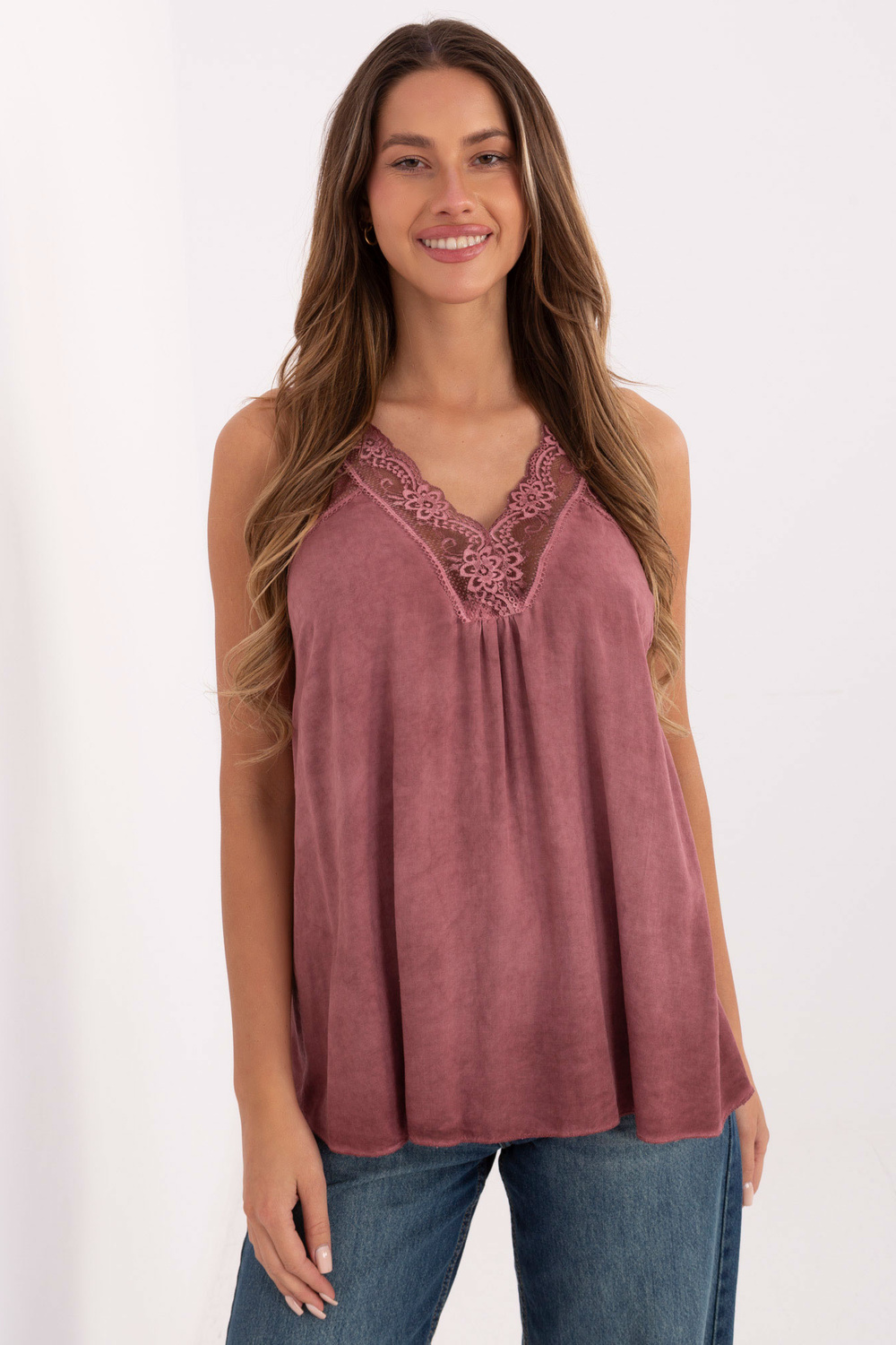 Modelis valkā viena izmēra apģērbu. Modeļa izmēri: augums 176 cm, krūtis 90 cm, viduklis 62 cm, gurni 94 cm.