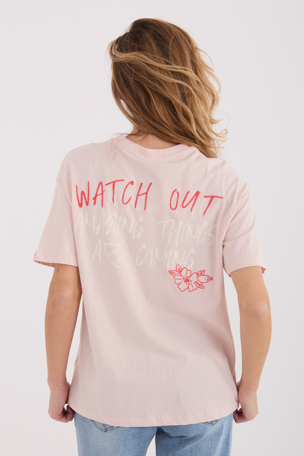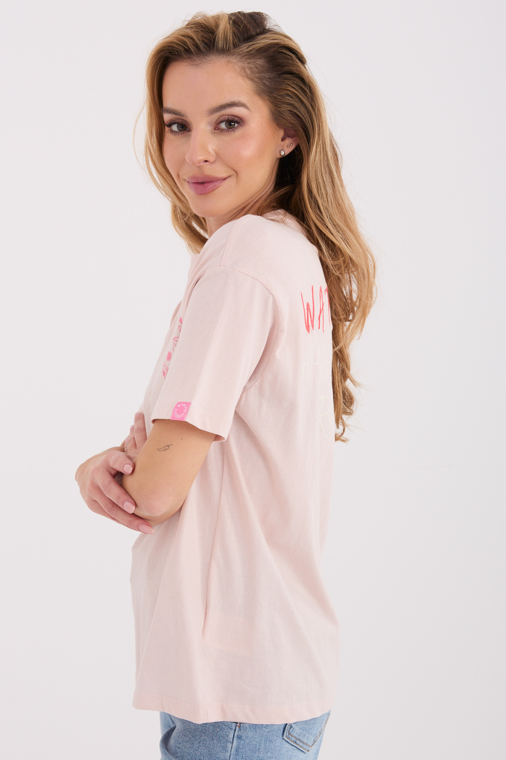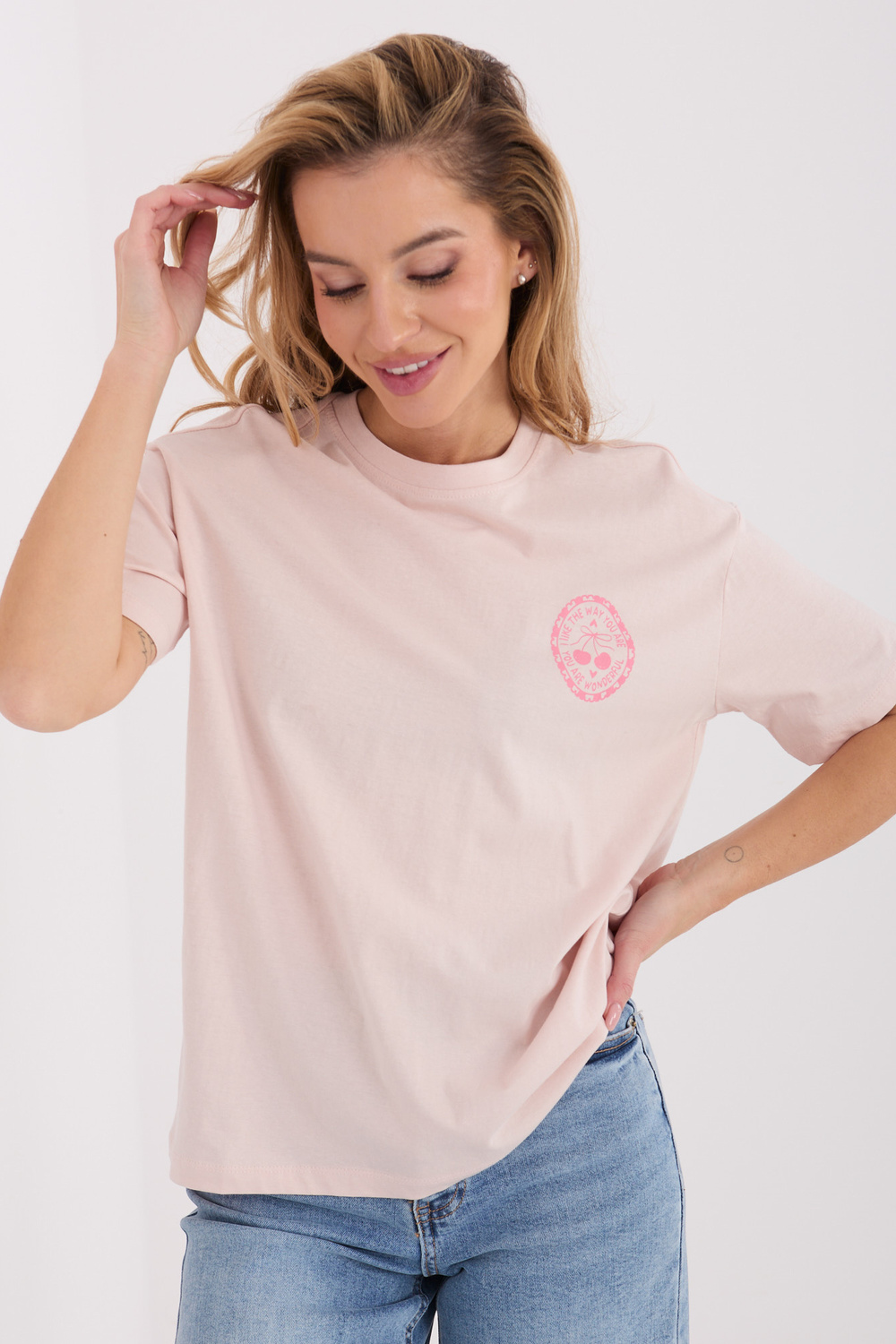 T-krekla izmēri S izmērā, mērīti izgludināti: platums zem padusēm – 53 cm, piedurknes garums – 19 cm (no šuves), platums gurnos – 54 cm, kopējais garums – 63 cm.