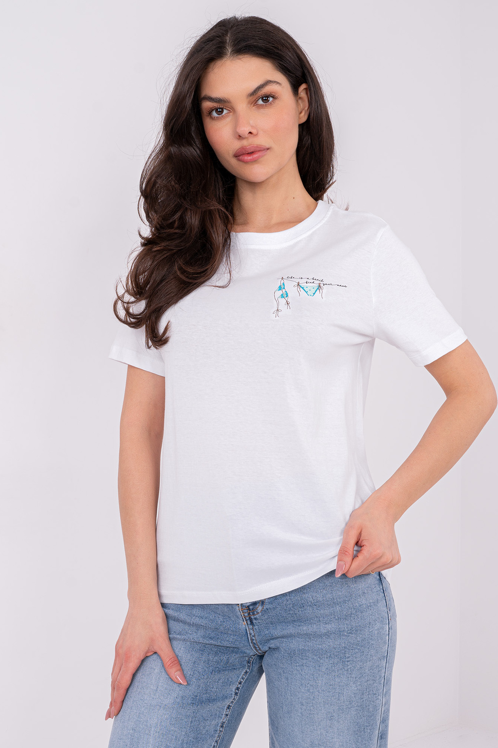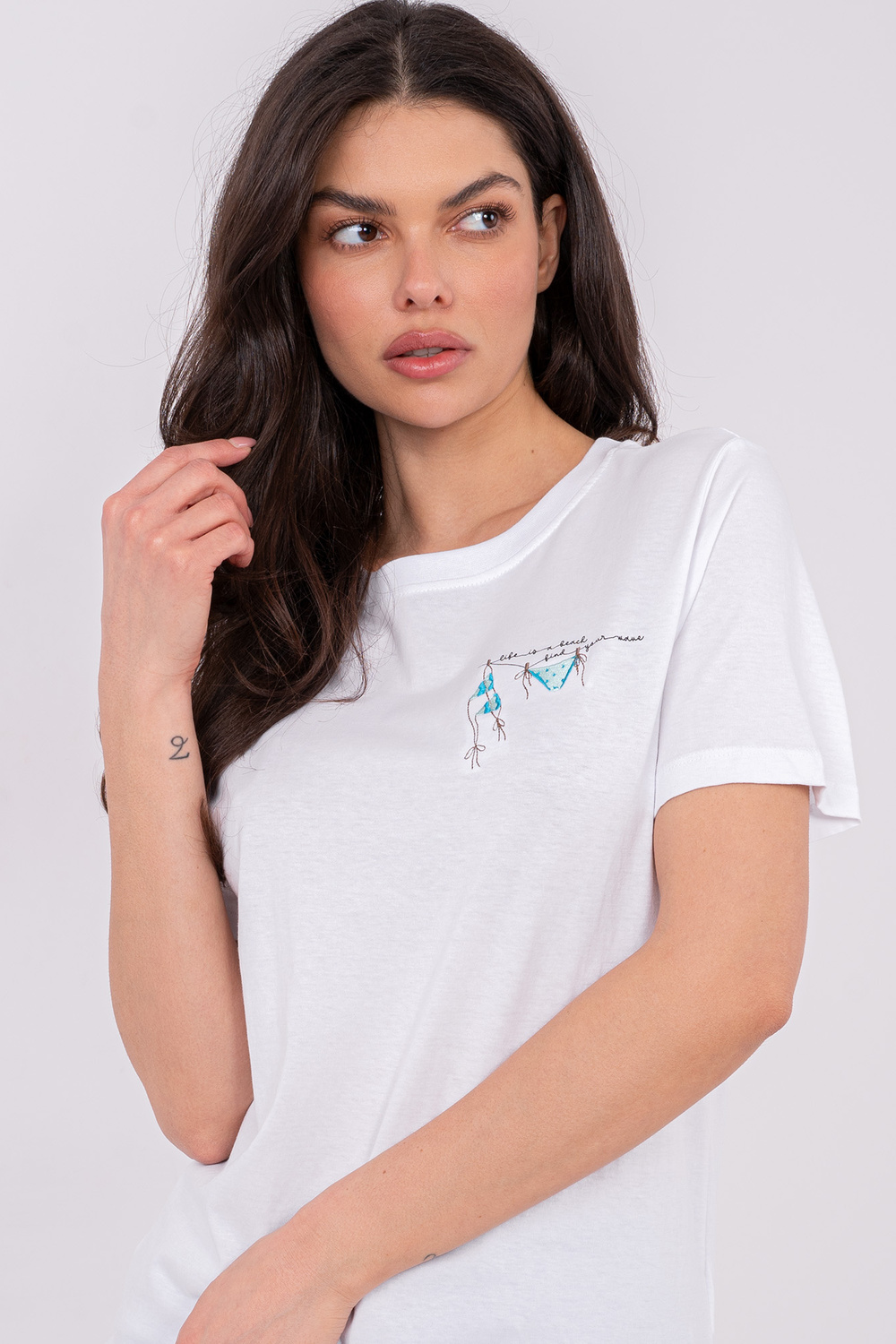 S izmēra krekliņa izmēri mērīti guļus: platums zem padusēm - 48 cm, piedurknes garums - 22 cm (no šuves), platums gurnos - 49 cm, kopējais garums - 63 cm.
