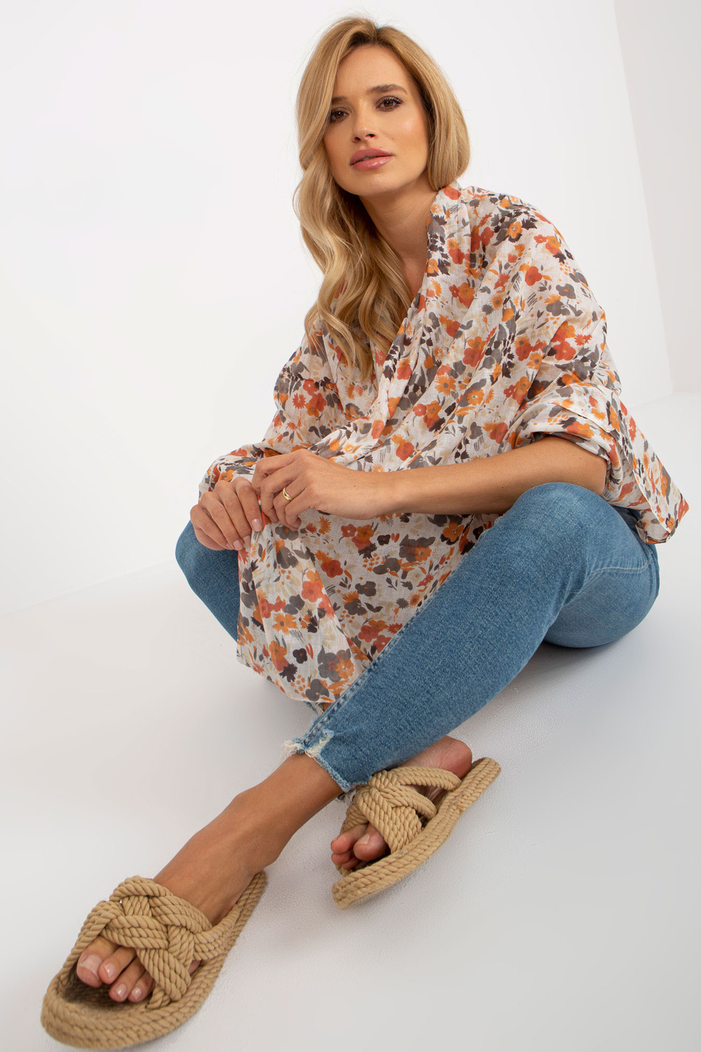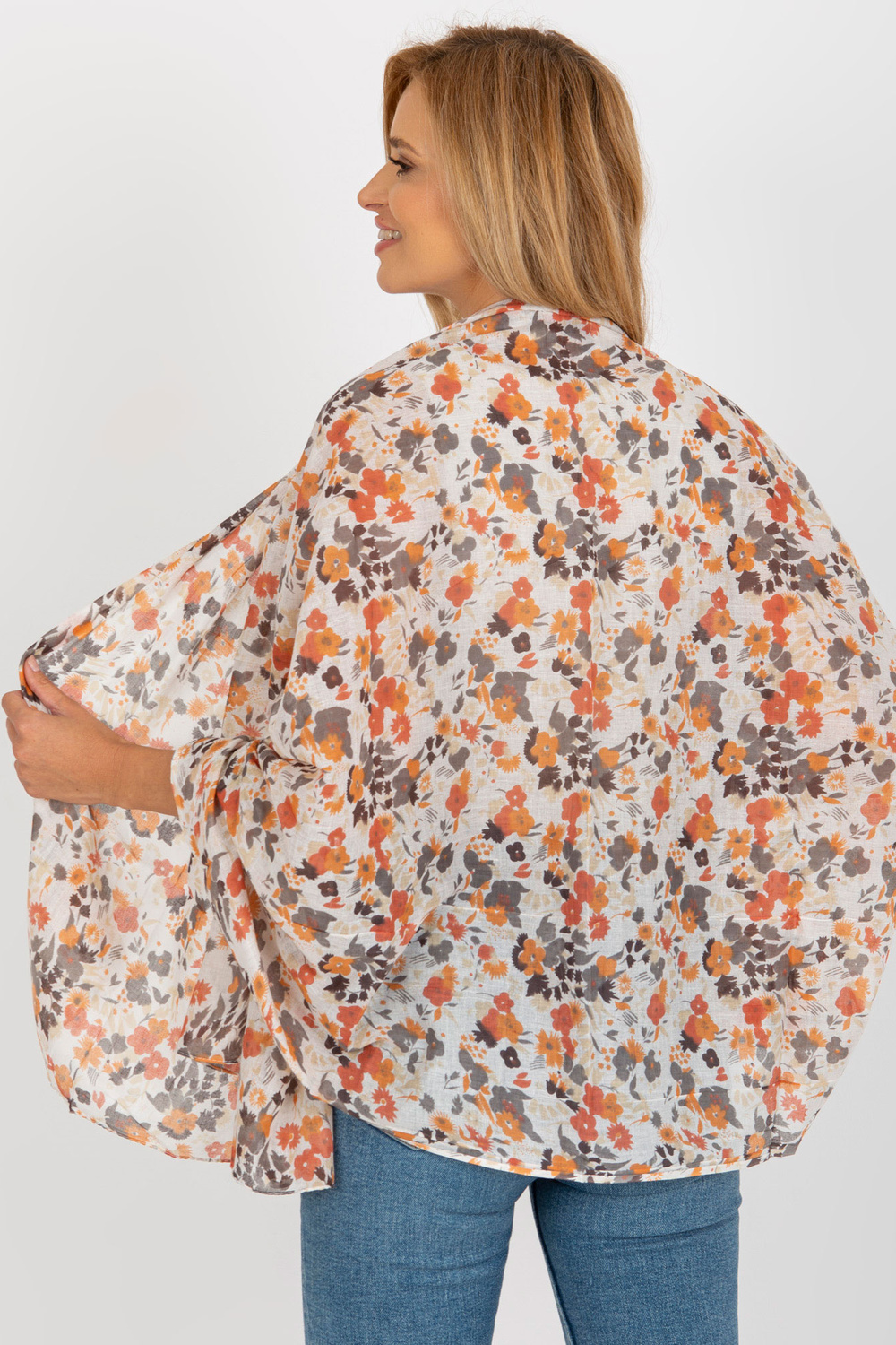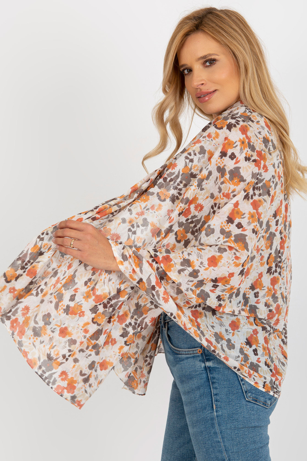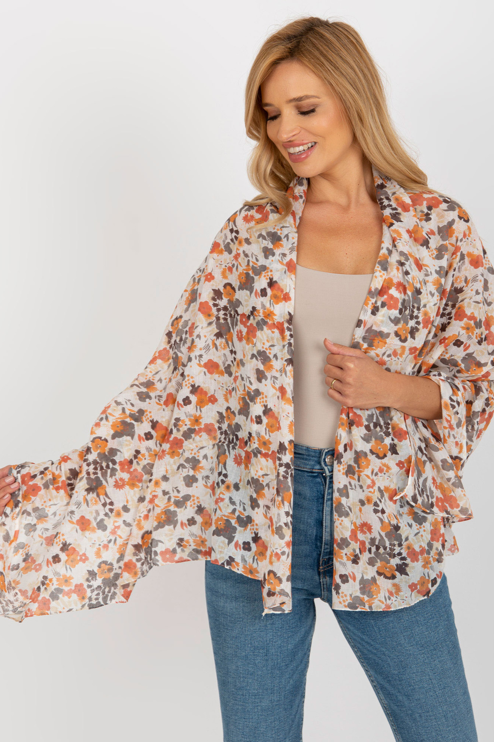 Oranža un balta kokvilnas šalle ar ziedu rakstiem.