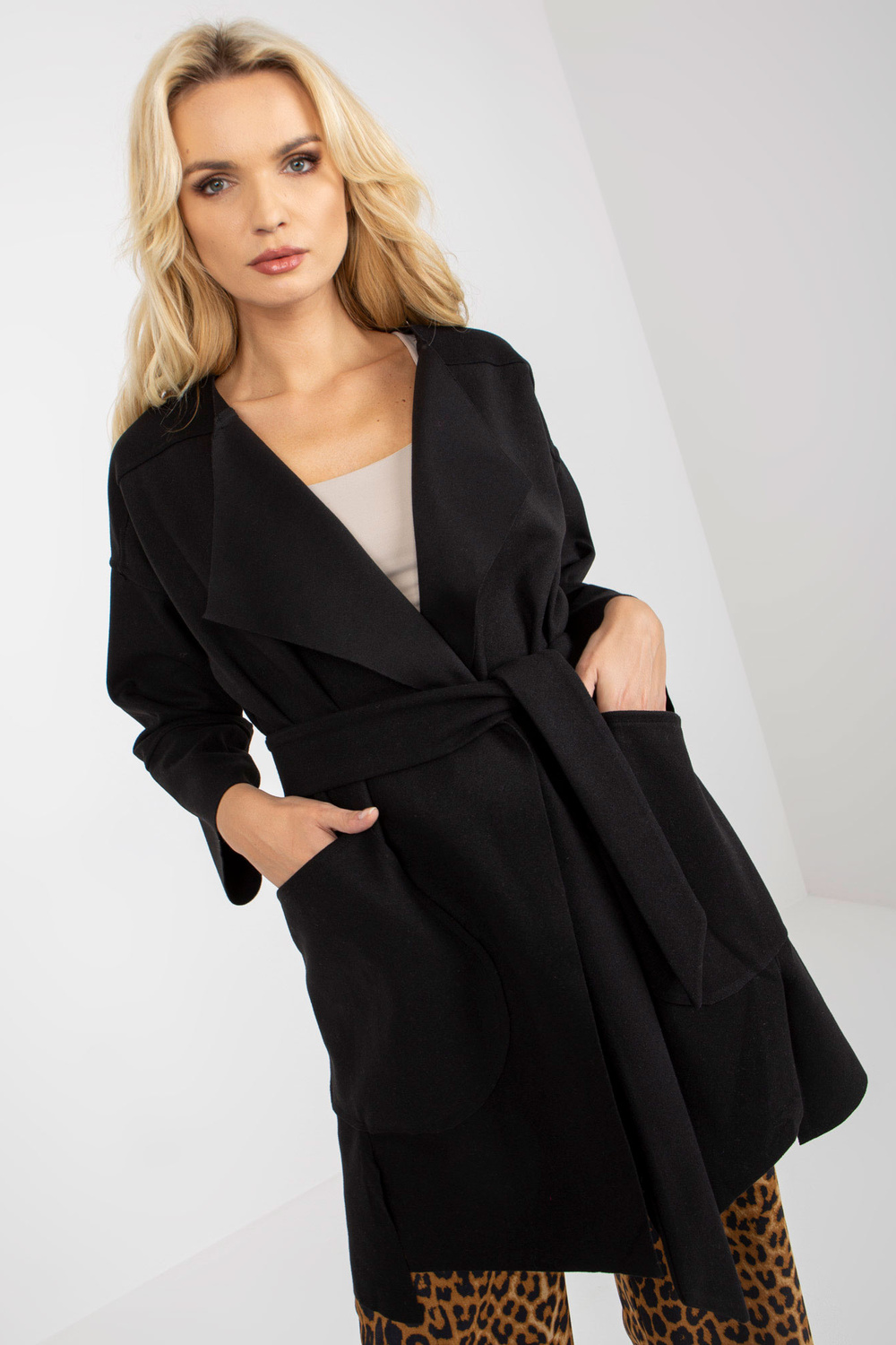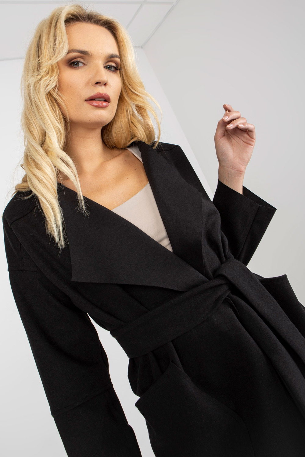 Schwarzer dünner Mantel ar Taschen OCH BELLA. Produkta kods: TW-PL-BE-M125.21 dominantes Muster: glatt Stils: Elegant Anlass: lässig, in der Stadt, spazieren gehen, arbeiten Modelis Größe S. Maße des Modeļi: Höhe 180 cm, Büste 90 cm, Taille Hüfte 93 c