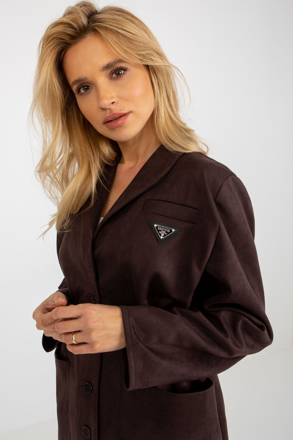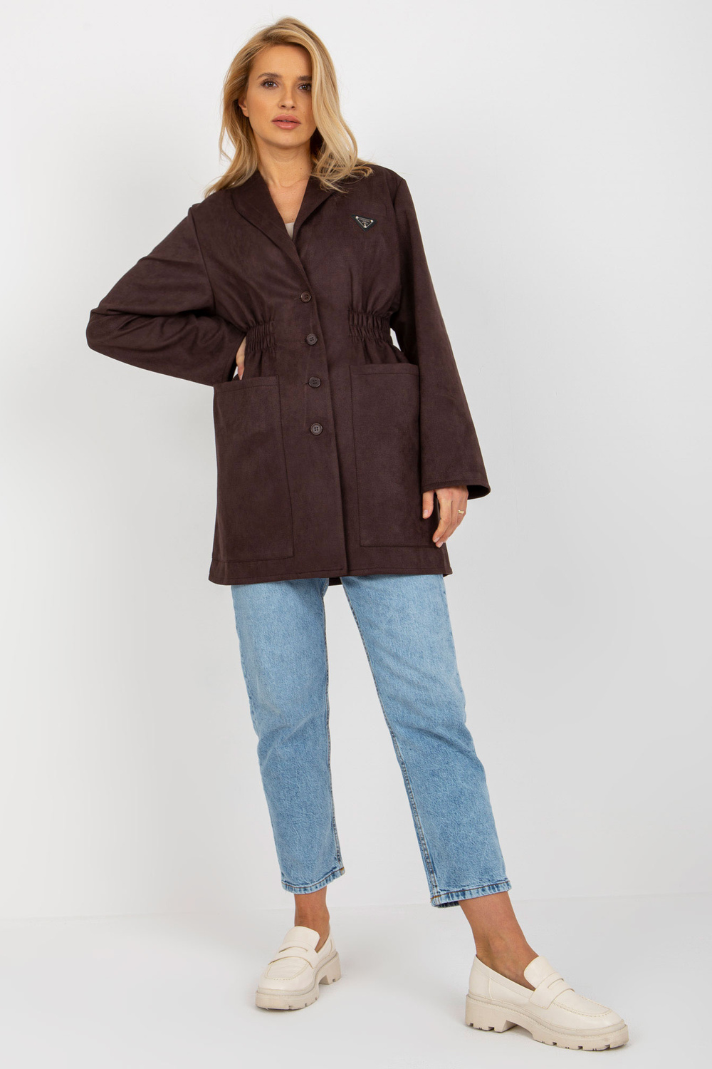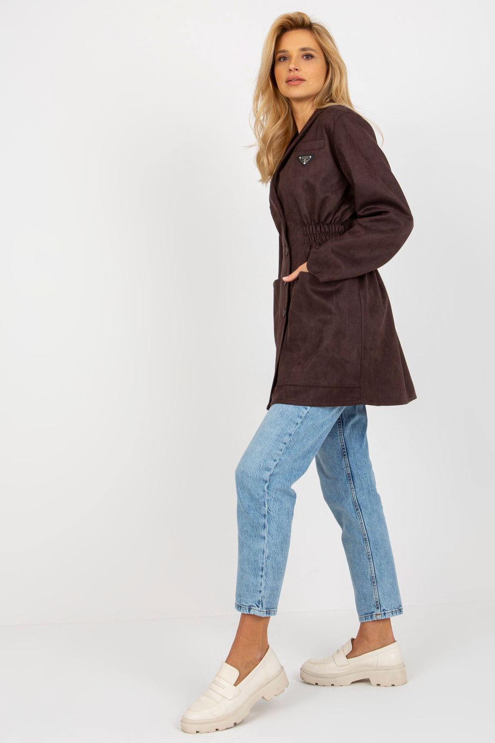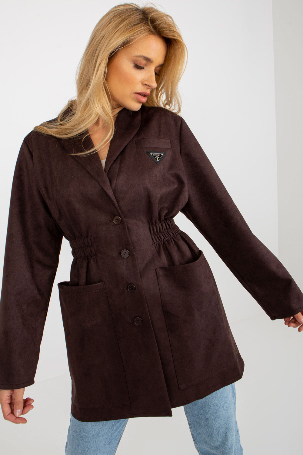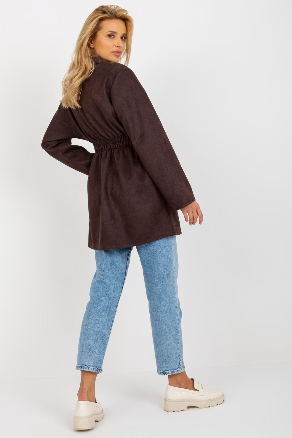 Tumši brūns jakas mētelis ar elastīgu joslu jostasvietā.