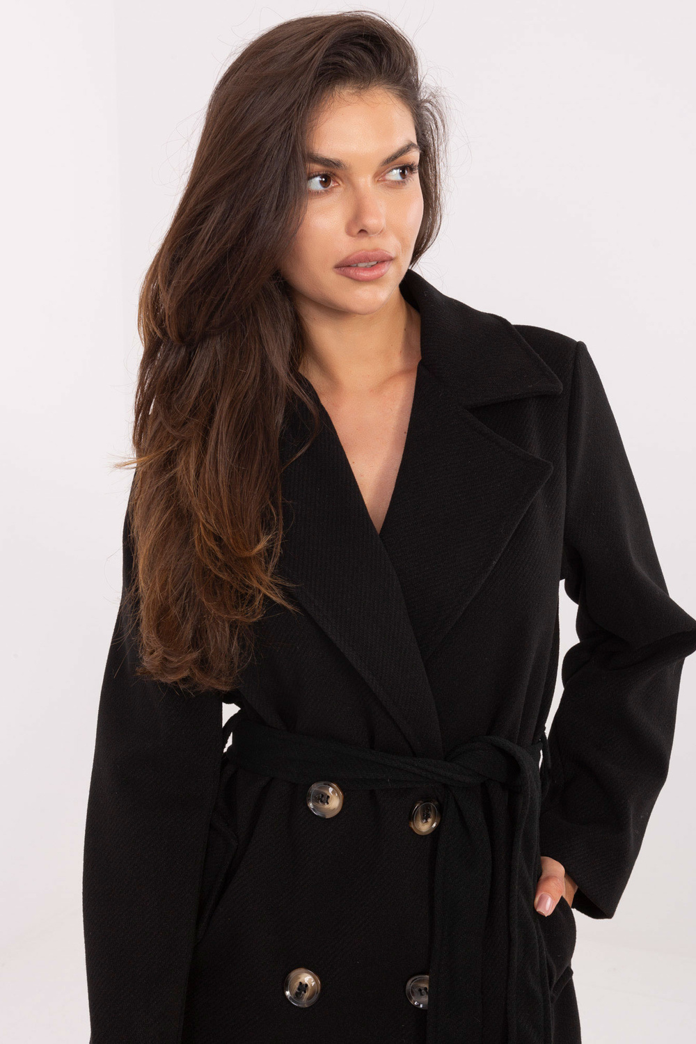 Modelis valkā vienu izmēru mēteli. Modeļa izmēri: augums 173 cm, krūtis 85 cm, viduklis 62 cm, gurni 95 cm.