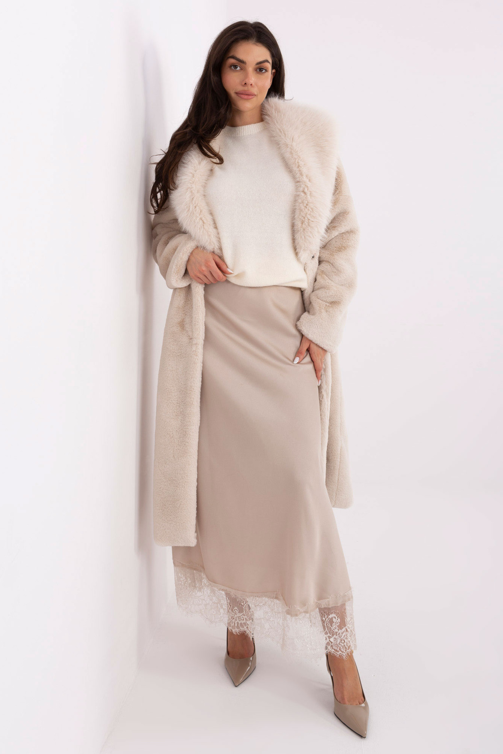 Modelis valkā vienas izmēra apģērbu. Modeļa izmēri: augums 176 cm, krūtis 90 cm, viduklis 62 cm, gurni 94 cm.