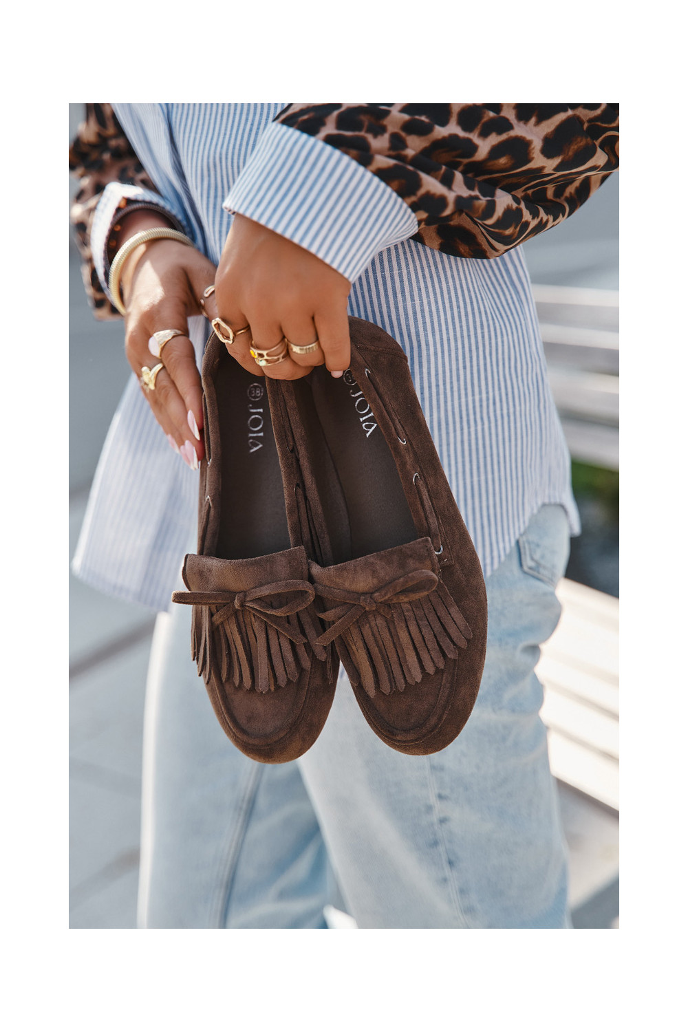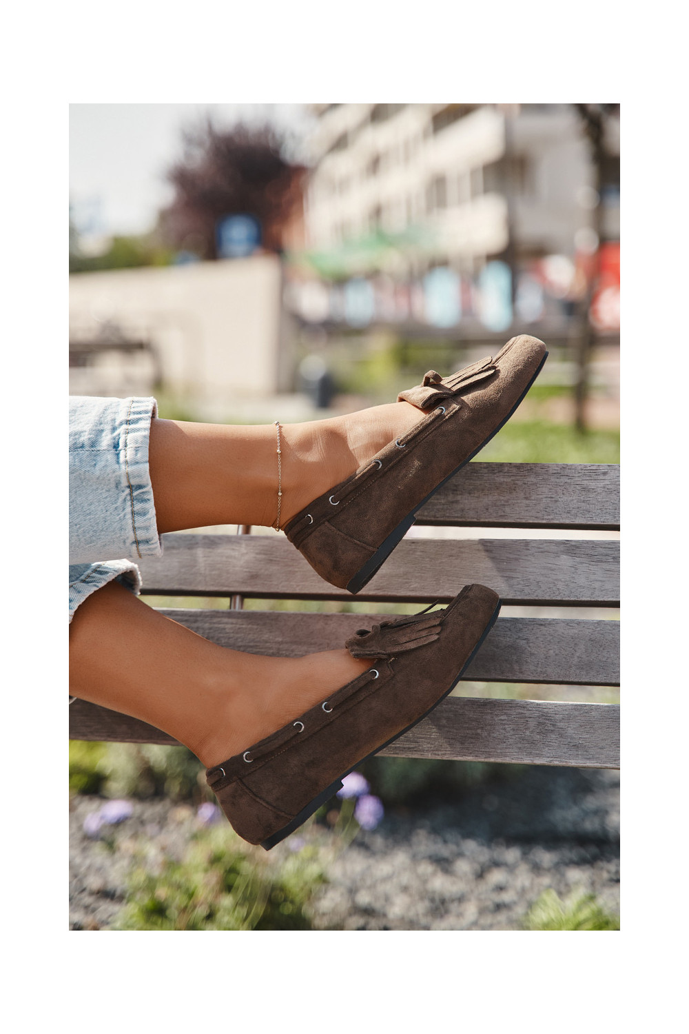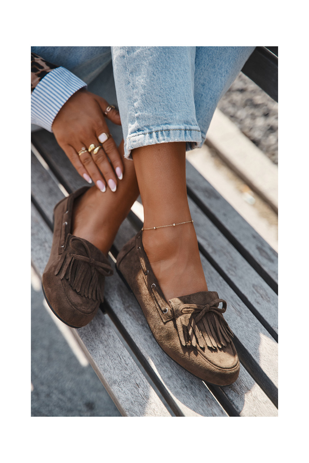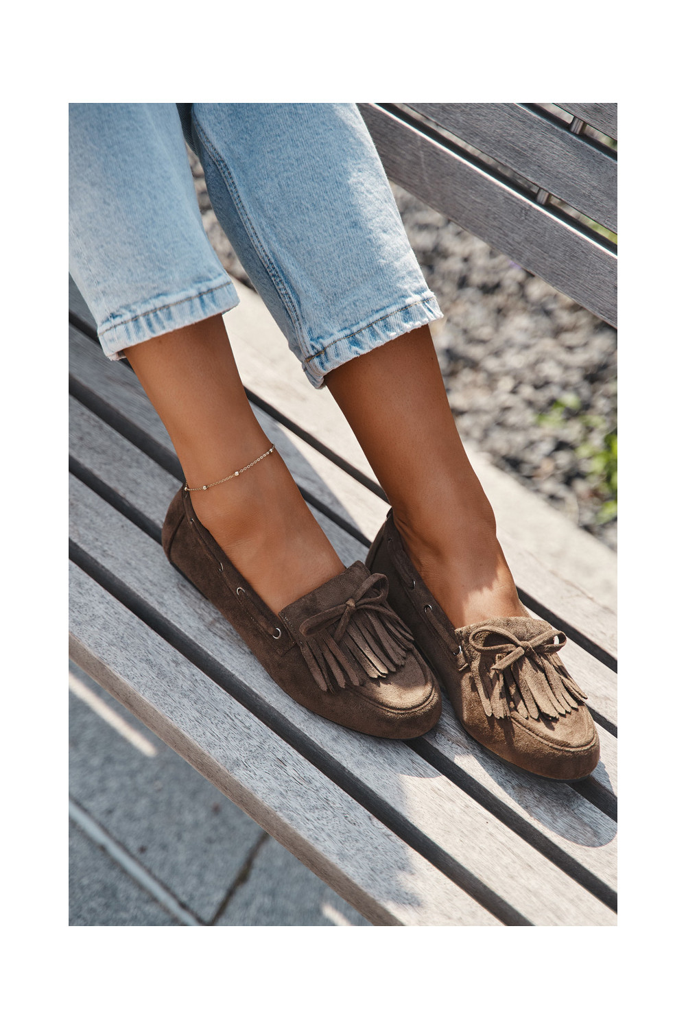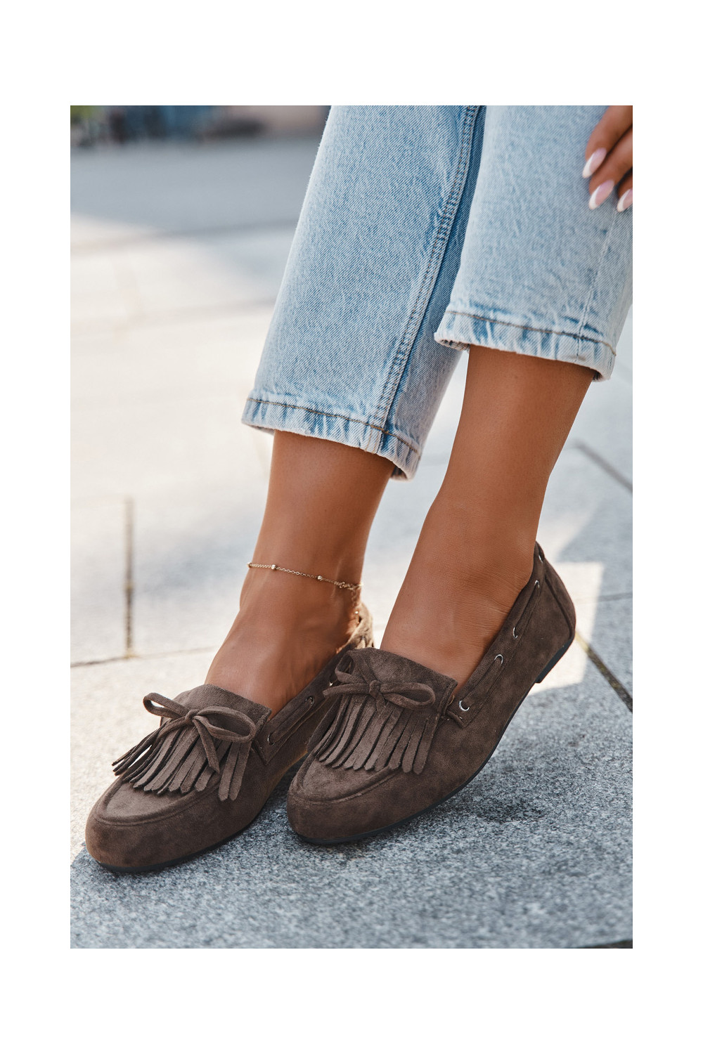 Sieviešu mokasīni ar bārkstīm un kokardu haki krāsā "Olivianne"