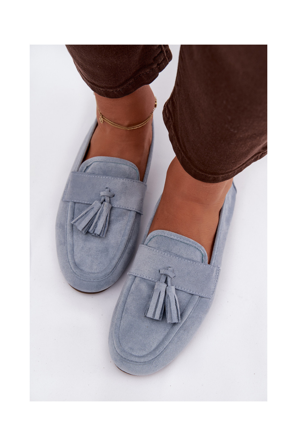 Mokasīni sieviešu ar pūciņām zilā krāsā