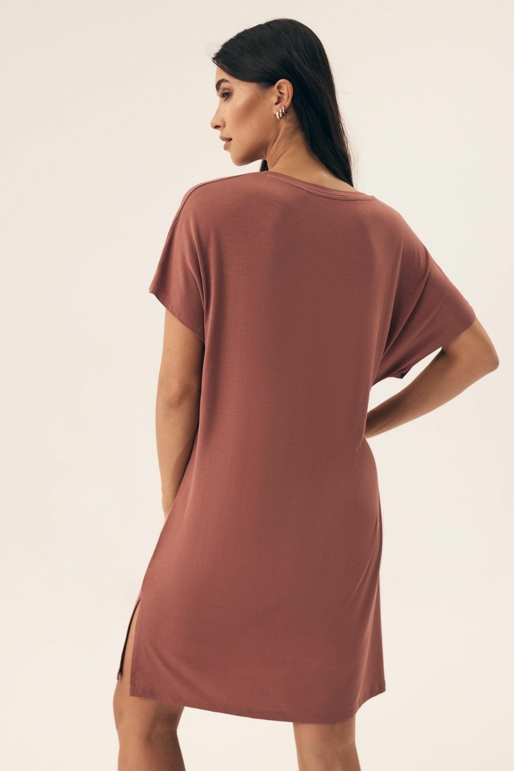 Elegant and comfortable nightshirt made of delicate, smooth Viskoze that pleasantly wraps around the body and provides comfort throughout the night. A loose fit and knee-length ensure freedom of movement, while short sleeves and a V-neck add lightness and feminine charm to the overall look. Product packed in a practical plastic bag, also perfect for a gift.