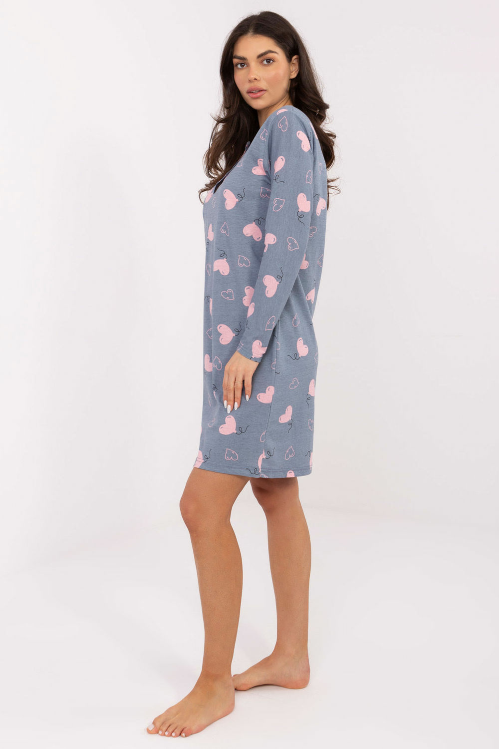 Women's shirt made of dominant cotton, which ensures high wearing comfort and breathability throughout the day. The is decorated with a charming heart print, giving it a delicate, feminine character. The shirt has a V-neckline, which subtly emphasizes the neckline, and long sleeves, perfect for cooler days. Four buttons are placed on the front, adding a classic finish and making it easy to put on. This is a stylish and comfortable everyday option.