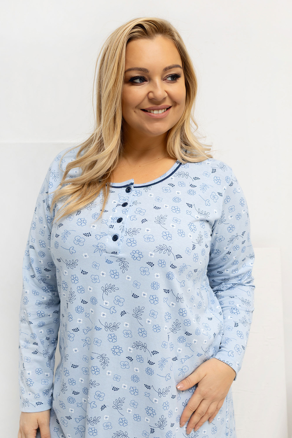 Krekla izmēri XL izmērā, mērīti iztaisnoti: blūze: platums zem padusēm – 60 cm, gurnu platums – 65 cm, piedurknes garums – 59 cm, kopējais garums – 106 cm, apakšmalas platums – 56 cm.