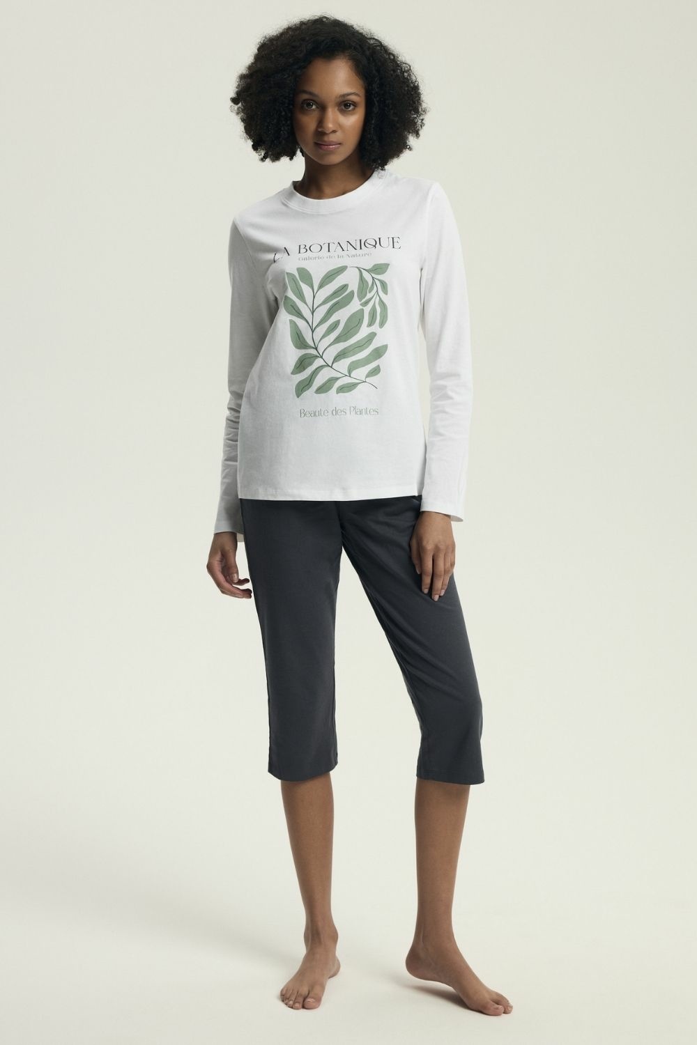 Women's pajamas in a stylish yet comfortable cut, created with comfort in mind during sleep and home relaxation. The long-sleeved blūze with a round neckline is adorned with a delicate print that adds subtle charm to the whole. 3/4 slim-fit pants beautifully complement the silhouette, providing freedom of movement. The without pockets, with a wide elastic waistband, guarantees comfortable and stable fit. The set is packed in a practical plastic bag, an ideal proposition for women who appreciate comfort, quality, and feminine style.