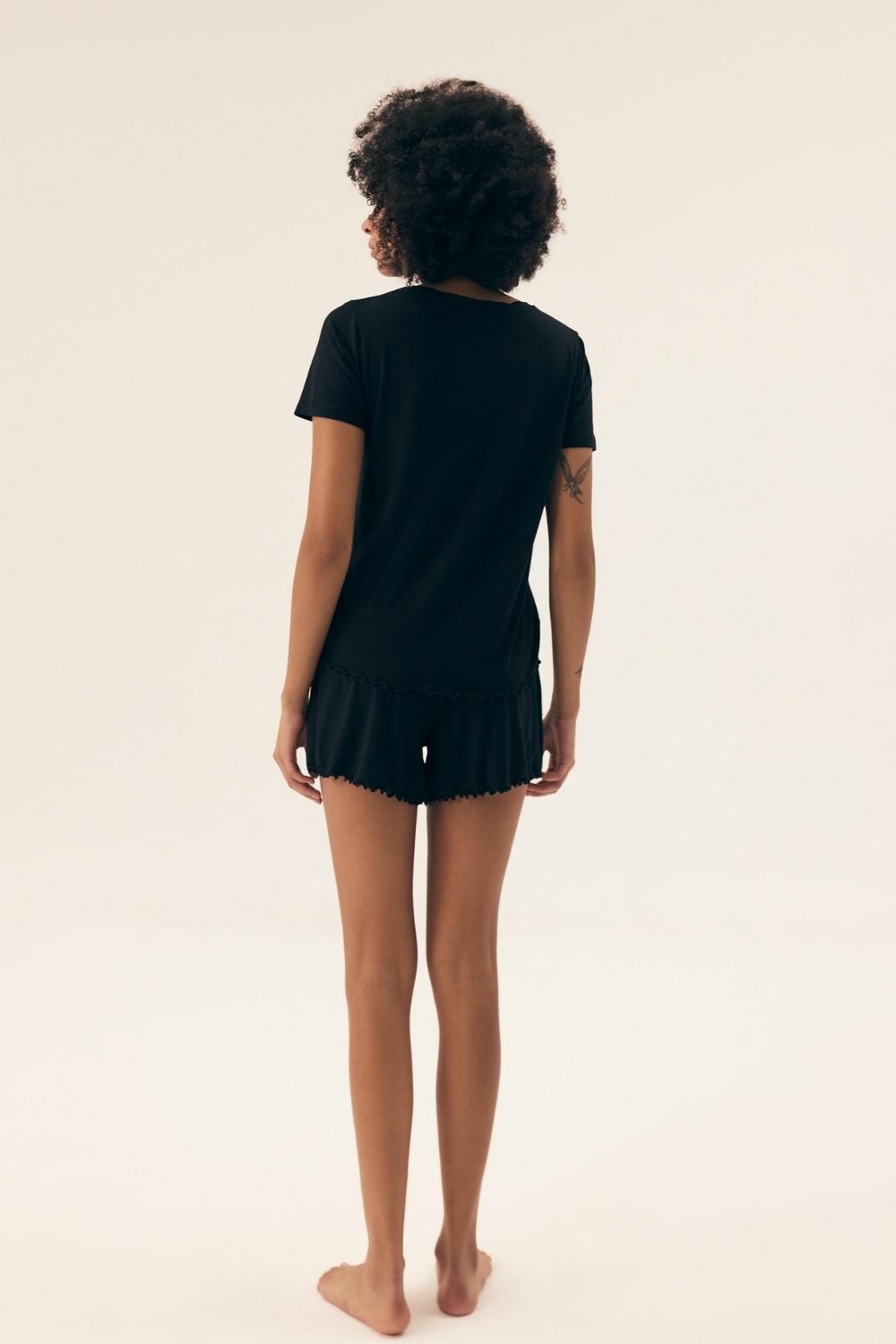 Stylish women's pajamas, made of delicate Viskoze, providing comfortable sleep throughout the night. The short-sleeved top with a V-neckline, decorated with subtle lace at the bottom, perfectly complements the shorts, which have a wide elastic waistband for even greater comfort. The smooth Materiāls: makes the pajamas pleasant to the touch, perfect for warm nights. The product is packed in a practical plastic bag, also excellent for a gift.