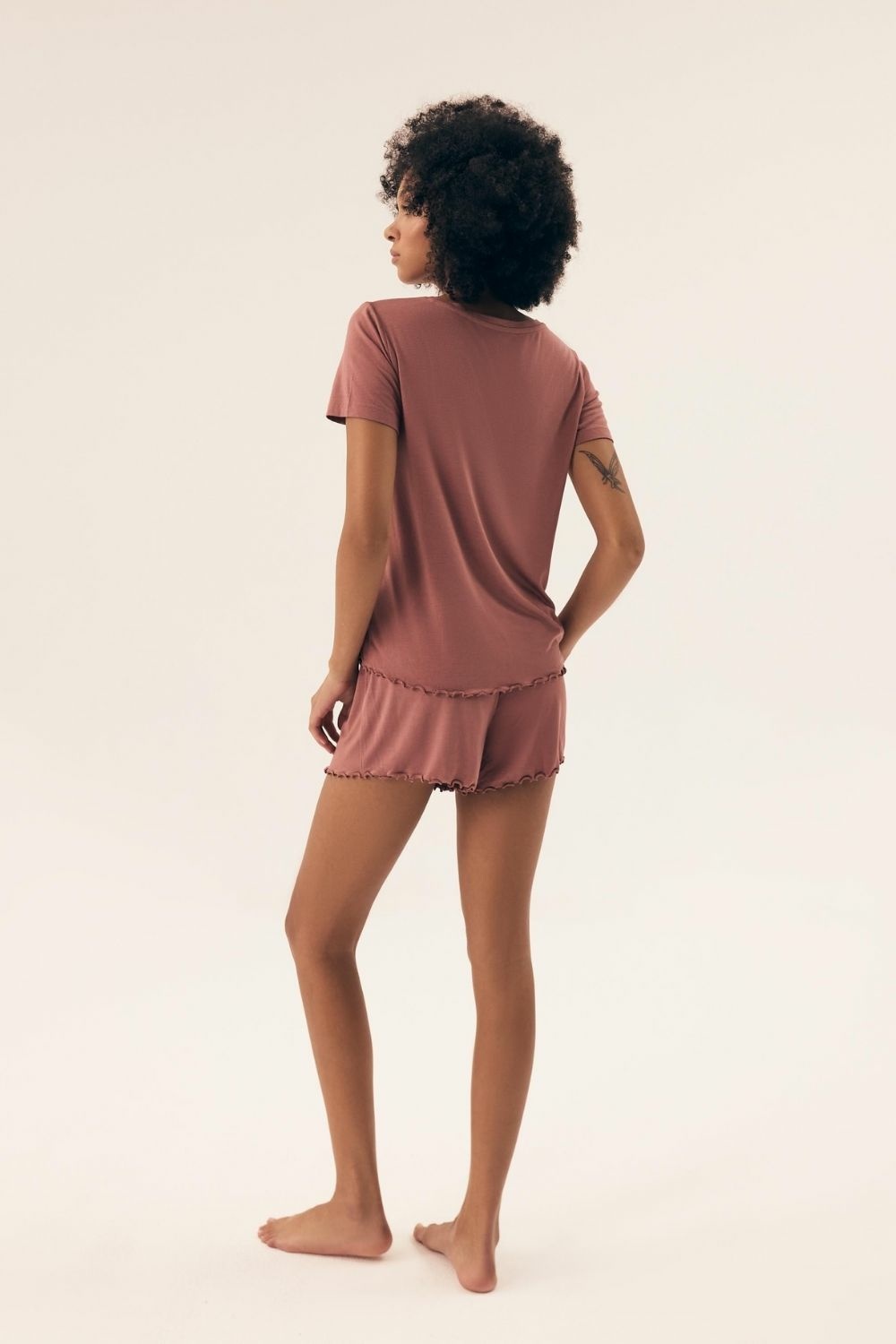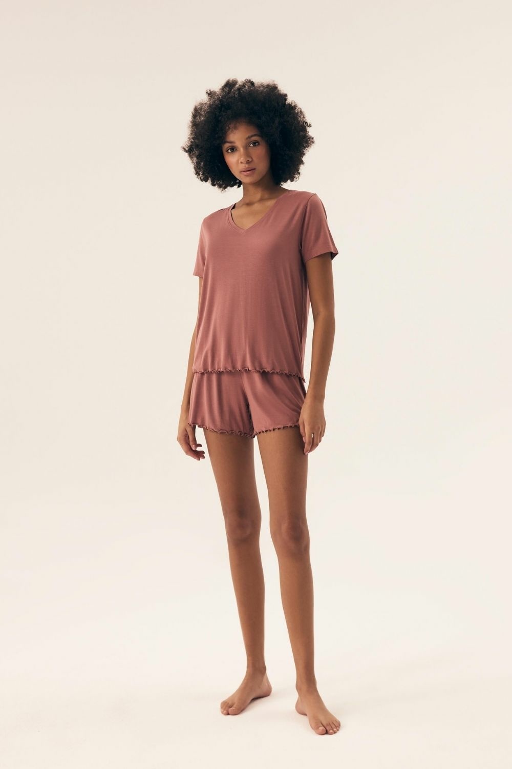 Stylish women's pajamas made of delicate Viskoze, providing comfortable sleep throughout the night. The short-sleeved top with a V-neckline, decorated with subtle lace at the bottom, perfectly complements the short shorts, which have a wide elastic waistband for even greater comfort. The smooth Materiāls: makes the pajamas pleasant to the touch, perfect for warm nights. The product is packed in a practical plastic bag, also excellent as a gift.