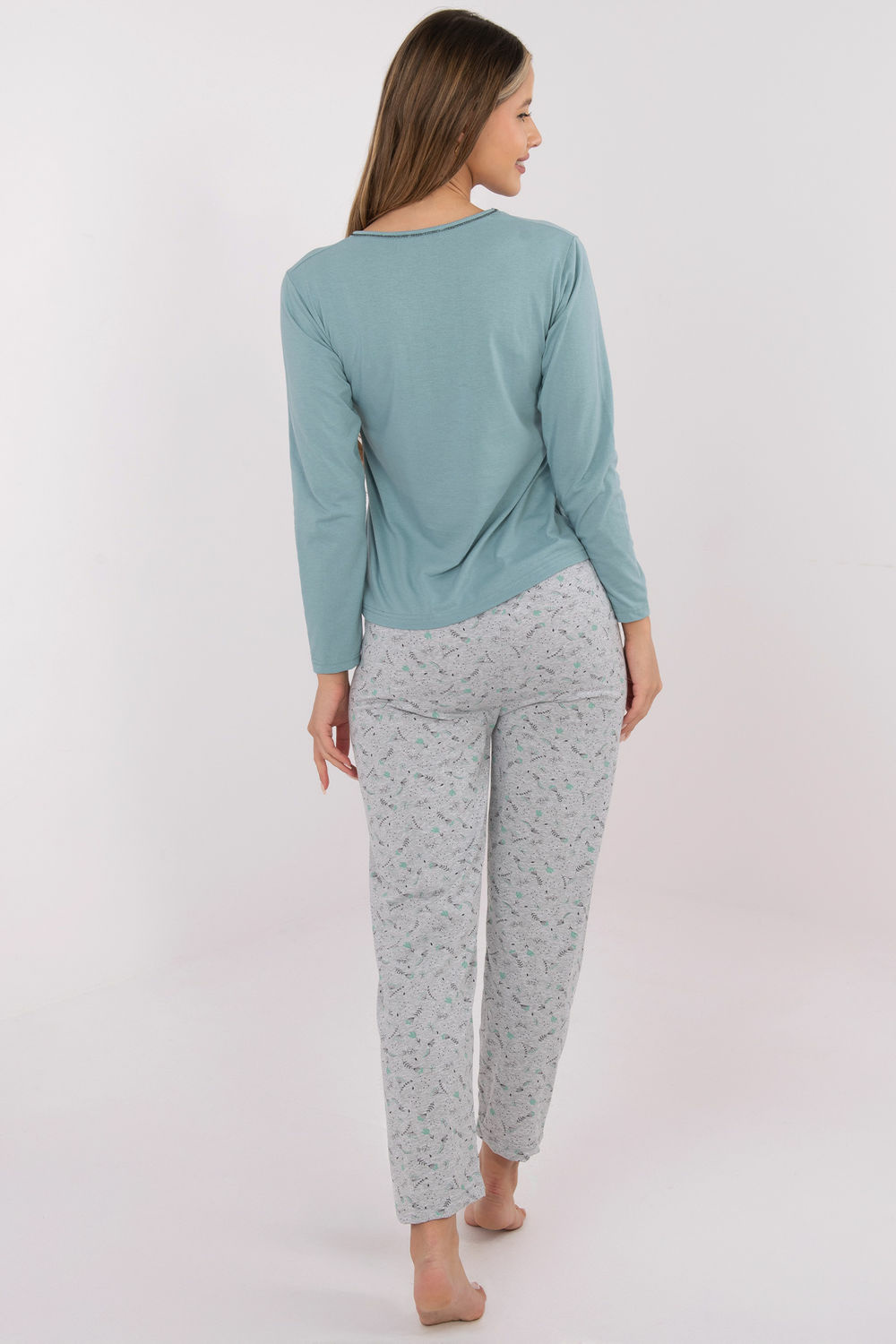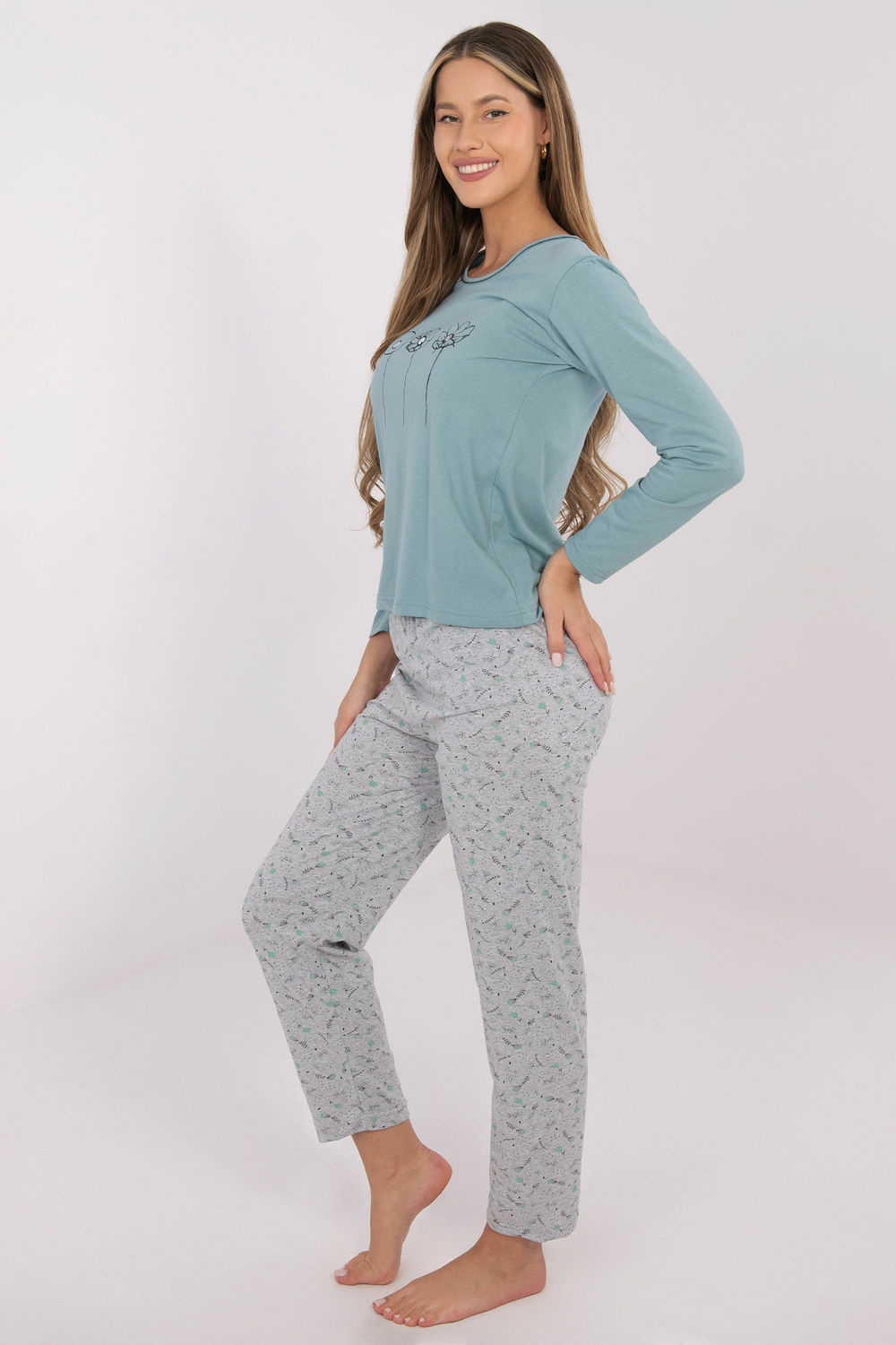Comfortable and stylish women's pajamas made of soft, breathable cotton, perfect for everyday relaxation. The set includes a long-sleeved blūze and pants with straight legs, creating a harmonious and classic ensemble. There is a subtle print on the front of the blūze, adding a delicate, feminine touch to the whole outfit. The pants are adorned with a printed, dominant pattern, making the set look stylish while remaining very comfortable. The does not have pockets, emphasizing its lightness and comfort. An ideal proposition for women who appreciate comfort, simplicity, and delicate, feminine details.