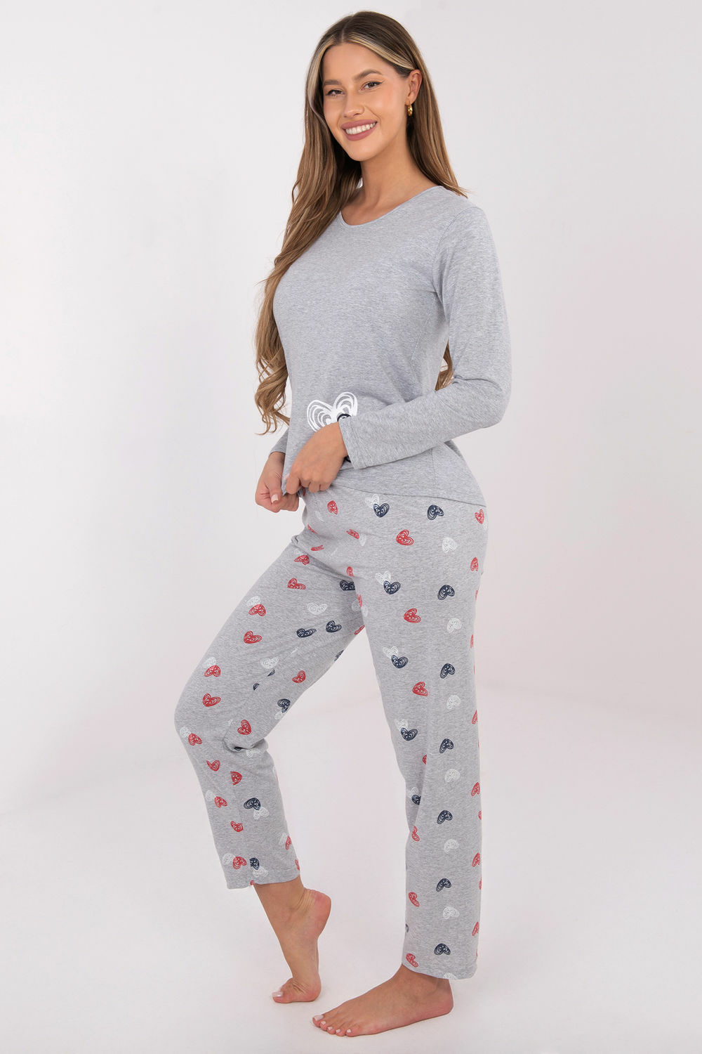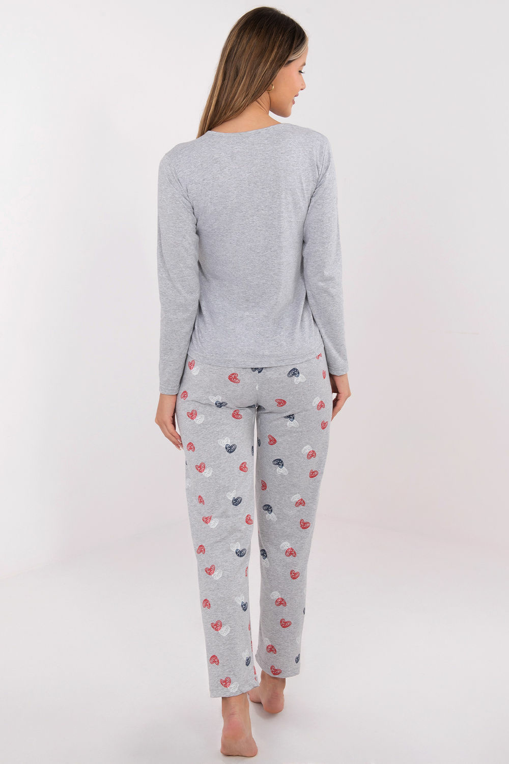 Comfortable, two-piece women's pajamas made of soft, breathable cotton, perfect for peaceful nights and relaxing evenings. The set includes a long-sleeved blūze, decorated at the bottom on the front with cute printed hearts, and long pants with a repeating heart pattern, creating a cohesive and feminine whole. The blūze has a round neckline, which ensures comfort when wearing. The set has no fastening, making it easy to put on and maximally comfortable. Stylish, soft, and feminine, perfect as a gift or as a favorite everyday pajamas.