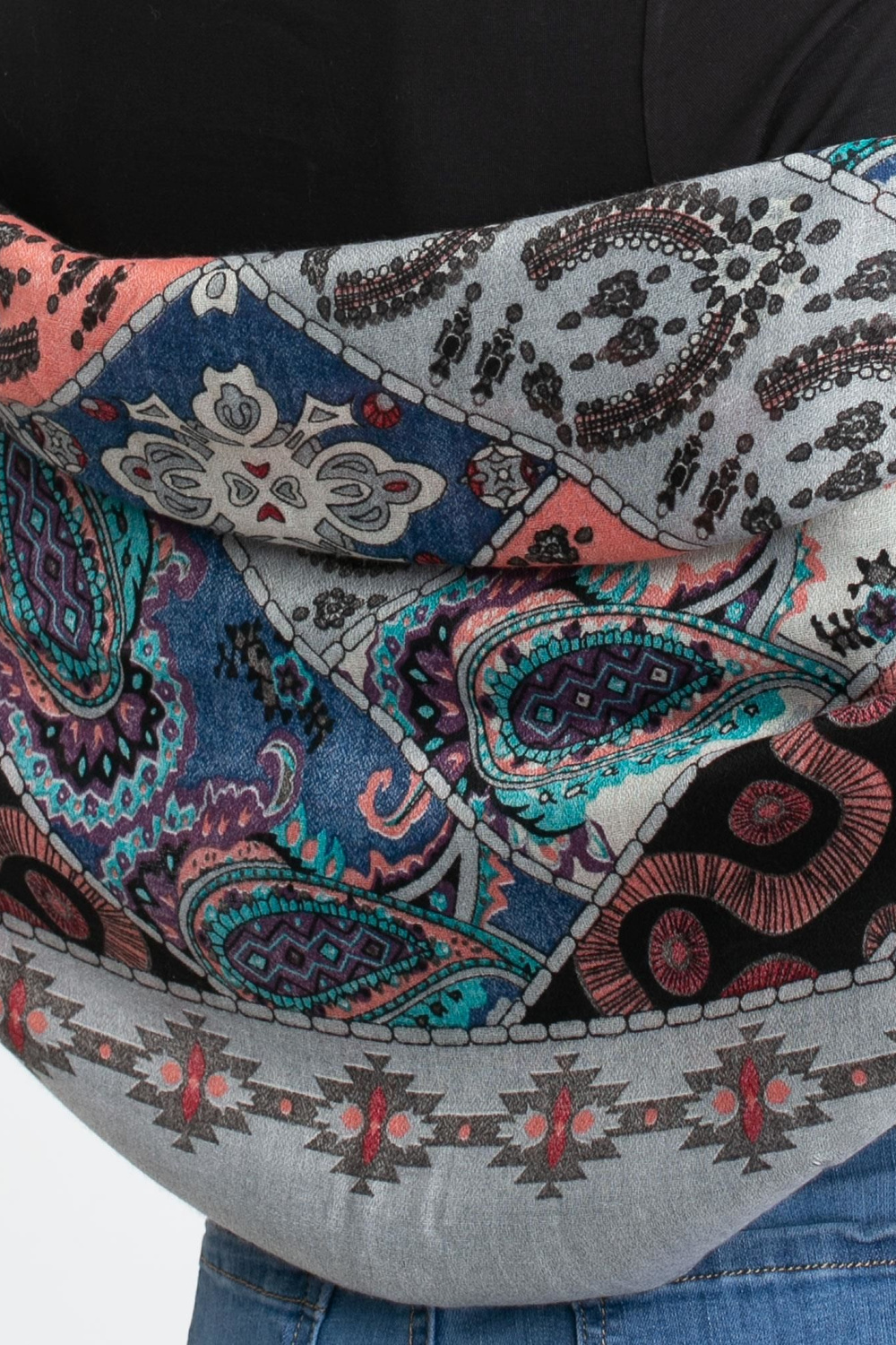 Pelēka šalle ar tautas rakstiem.