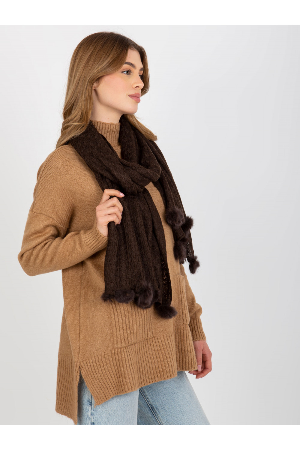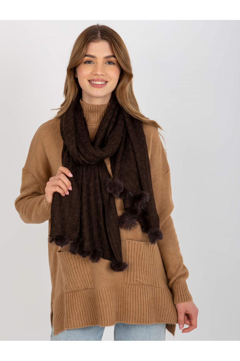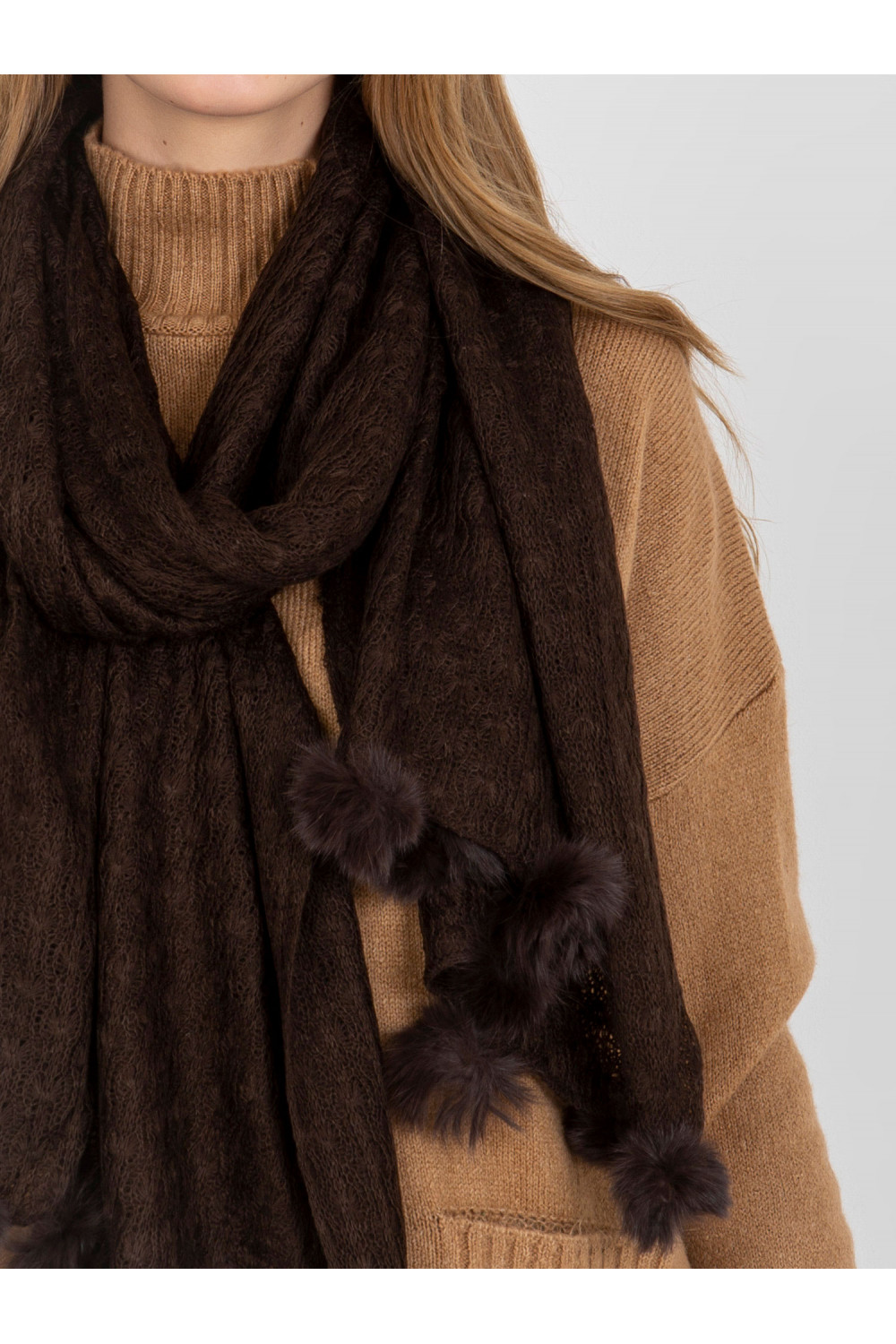 Tumši brūna ažūra sieviešu šalle ar pomponiem.