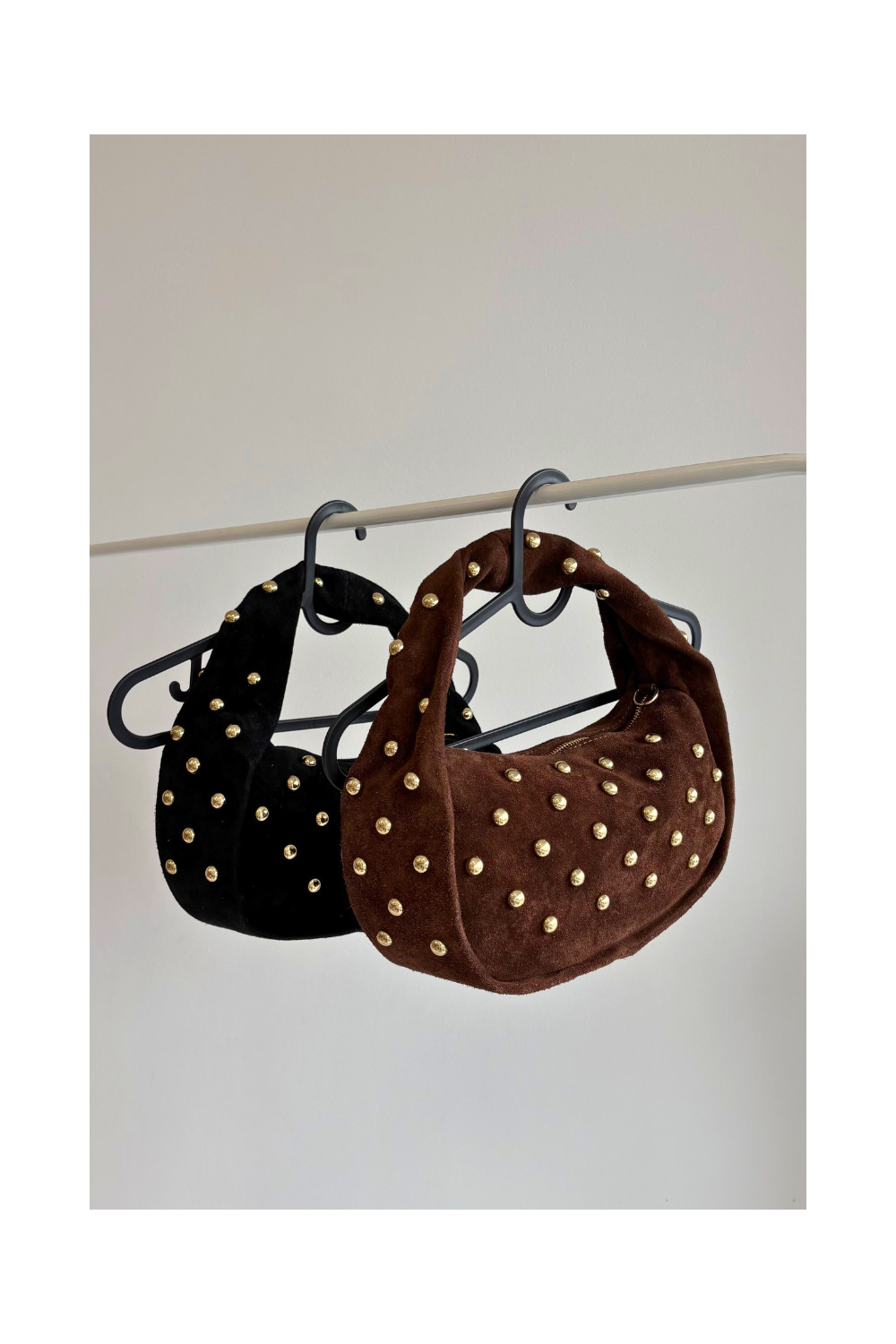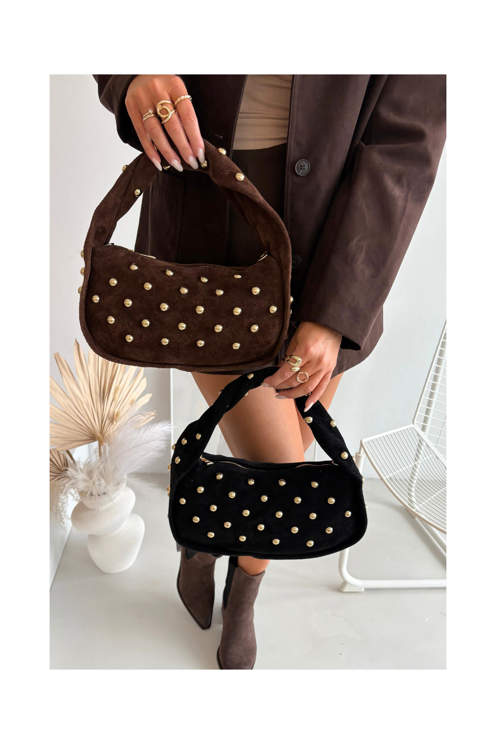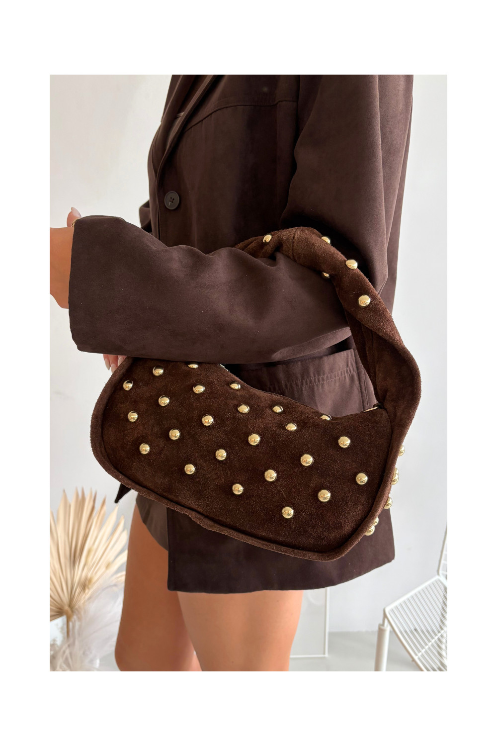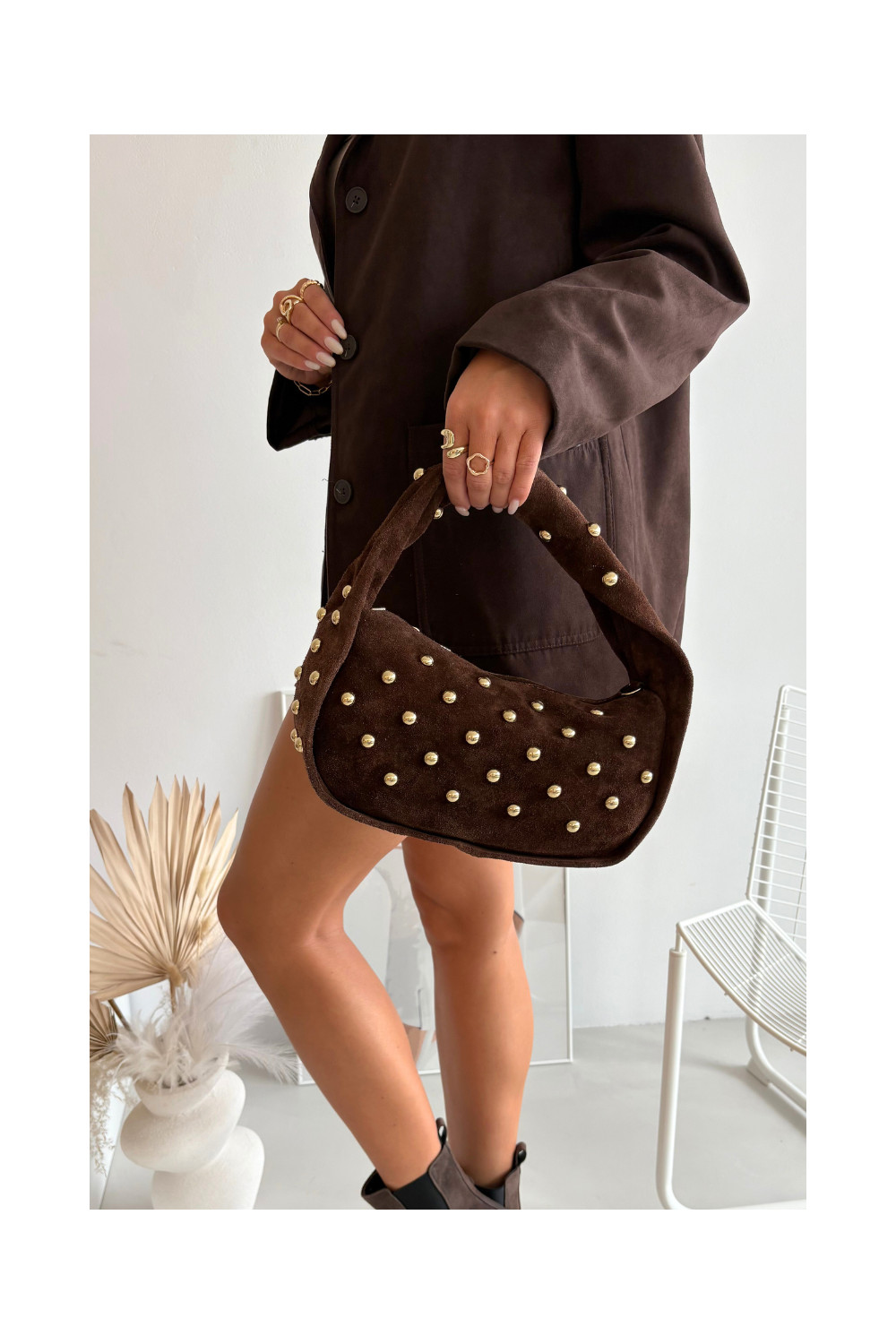 Dabas zamšs šokolādes soma ar dekorāciju Julisse