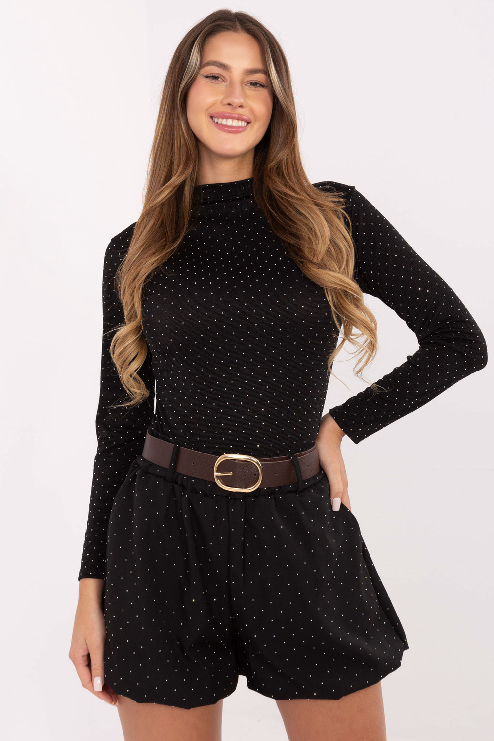 Modelis valkā viena izmēra apģērbu. Modeļa izmēri: augums 176 cm, krūtis 90 cm, viduklis 62 cm, gurni 94 cm.