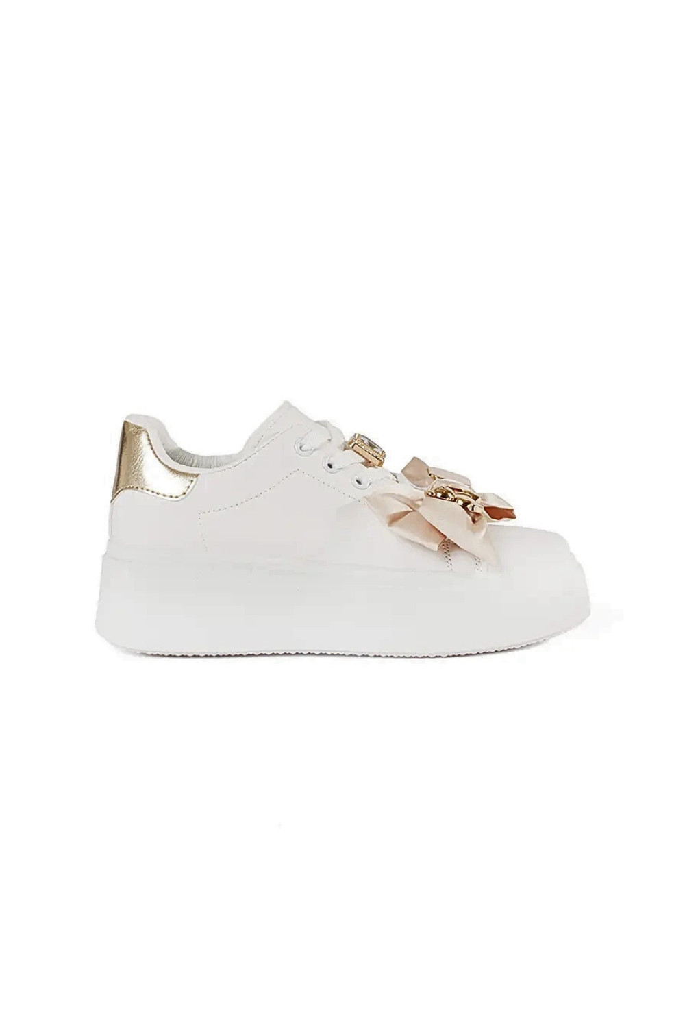 balti-zeltaini sporta apavi ar zelta aksesuāriem