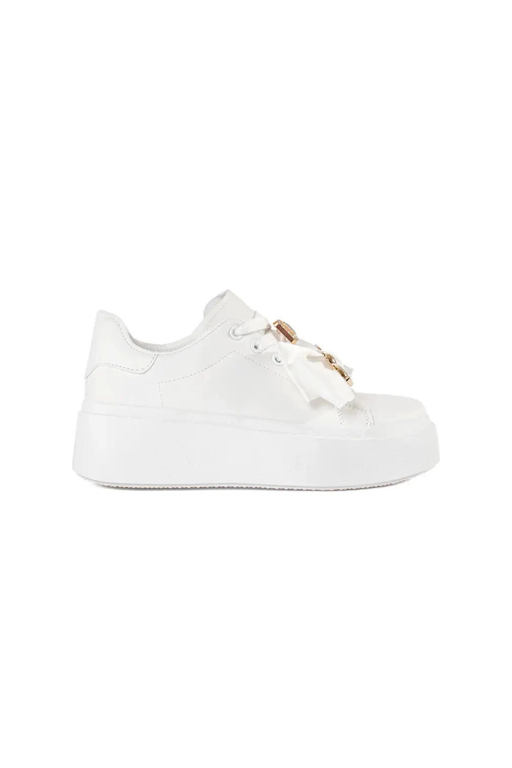 baltas krāsas sporta apavi ar zelta aksesuāriem