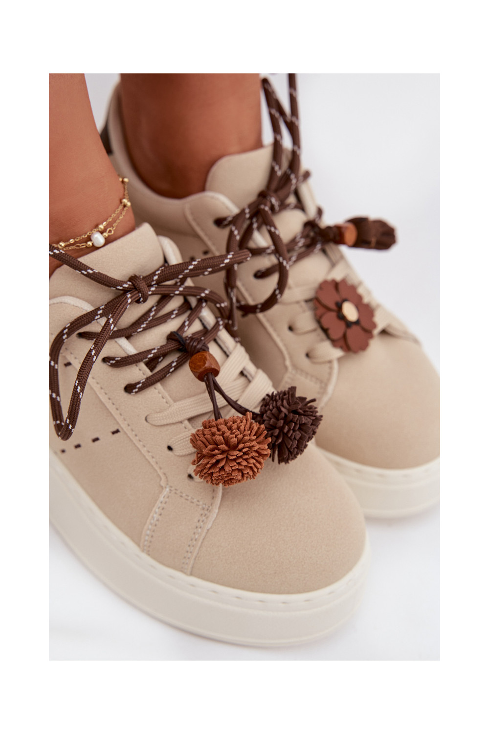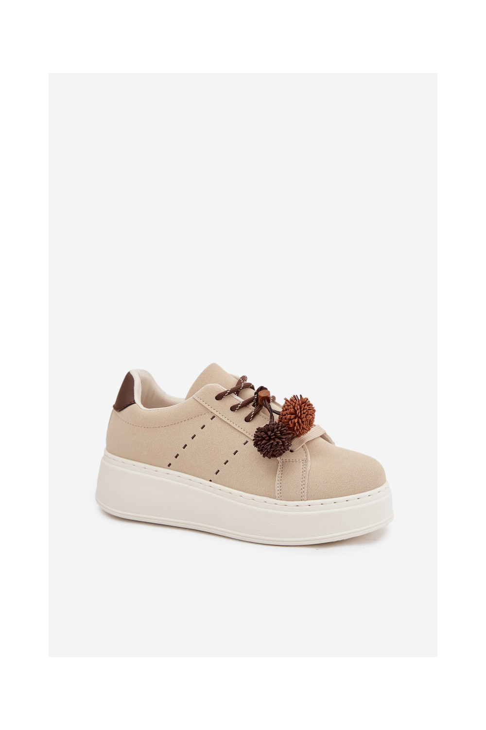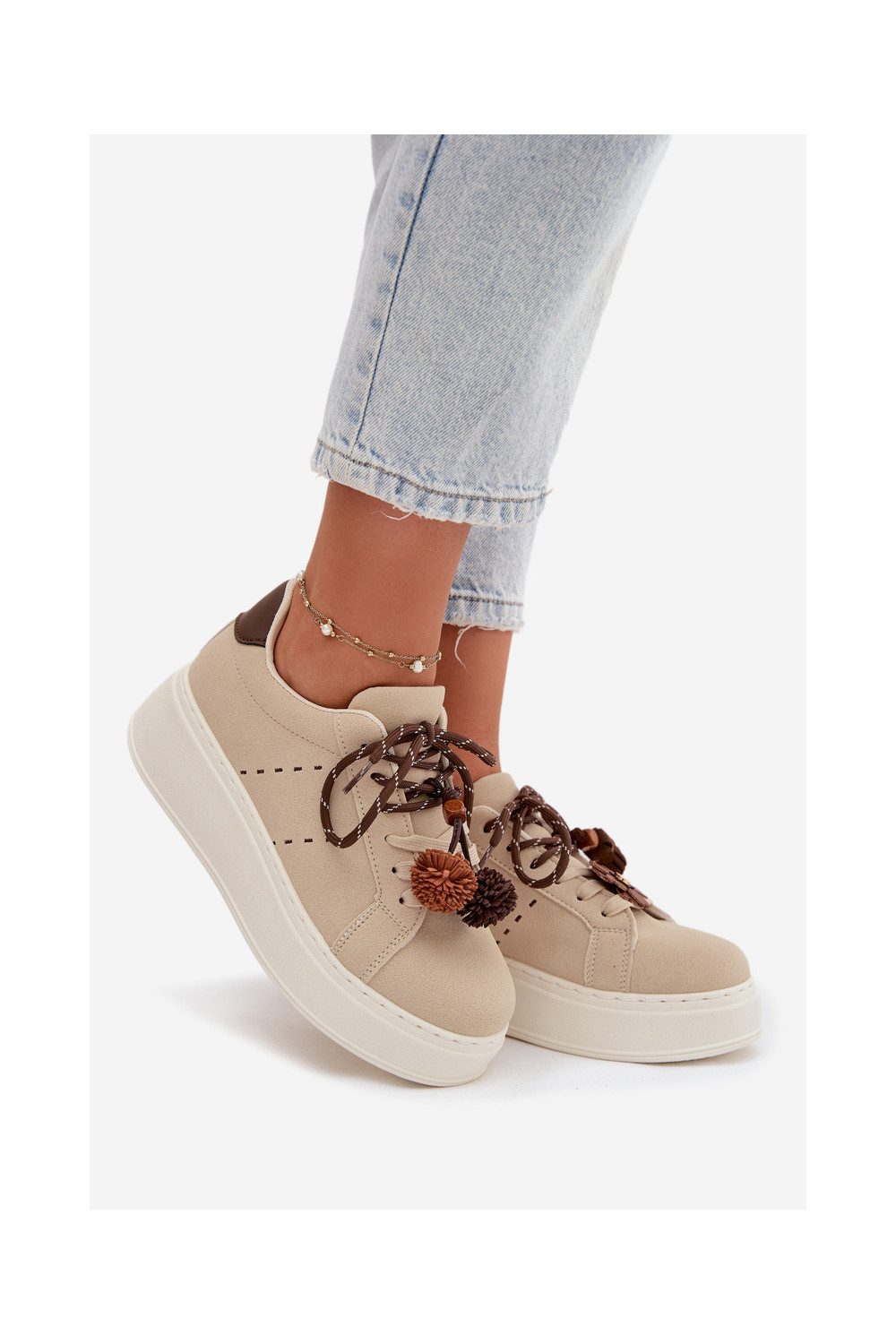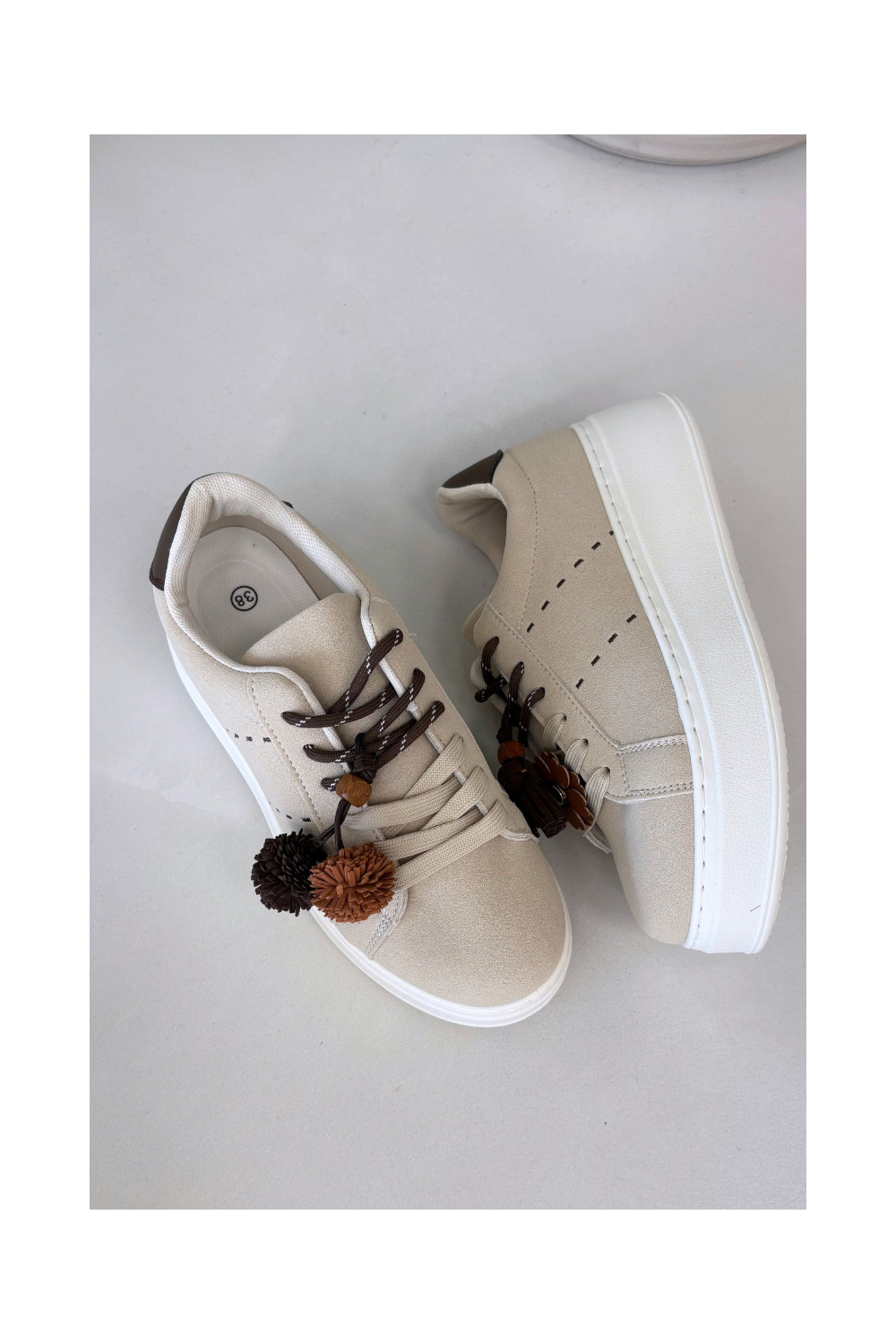 Smilšu krāsas Corinna sieviešu platformas sporta apavi ar grezniem pomponiem