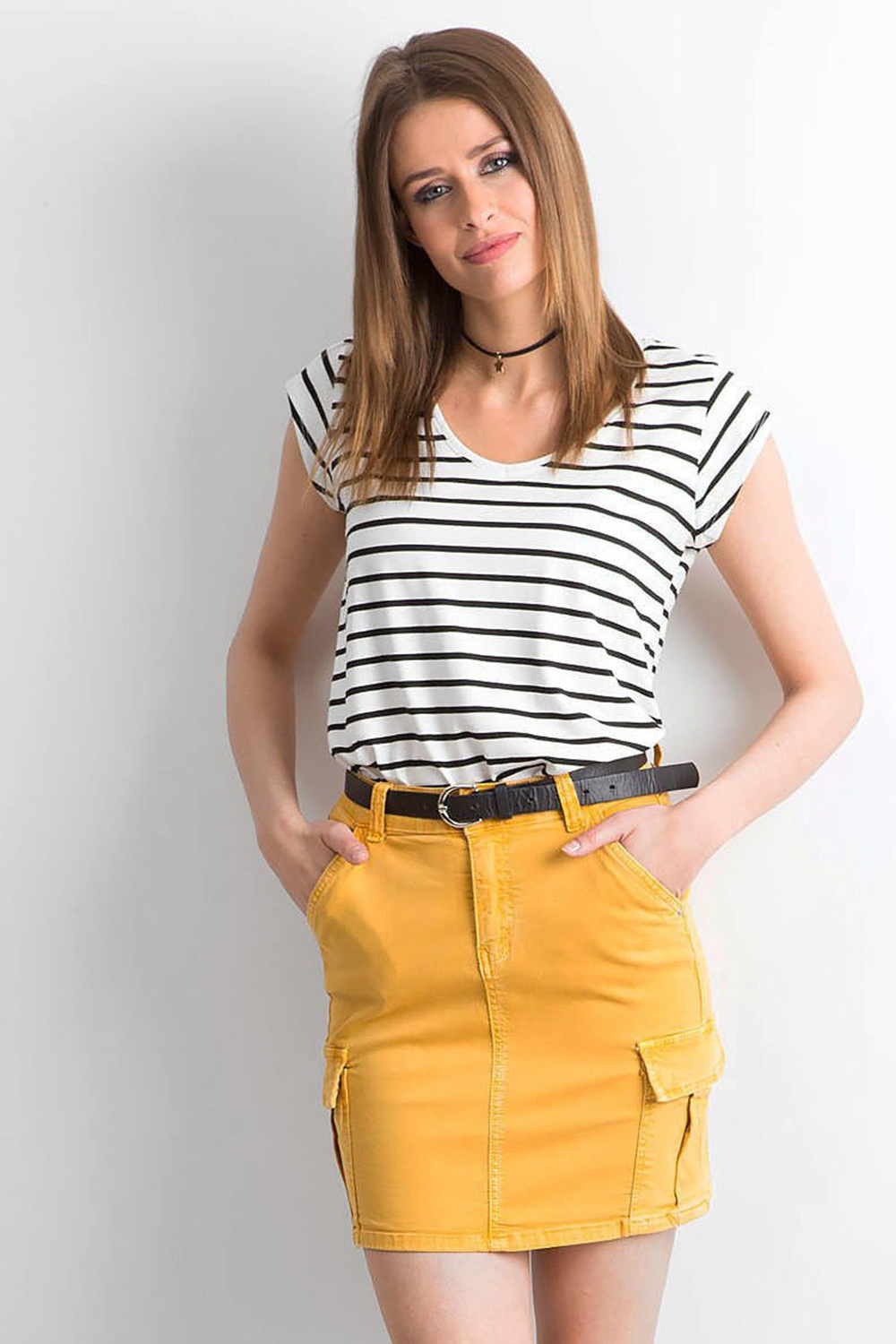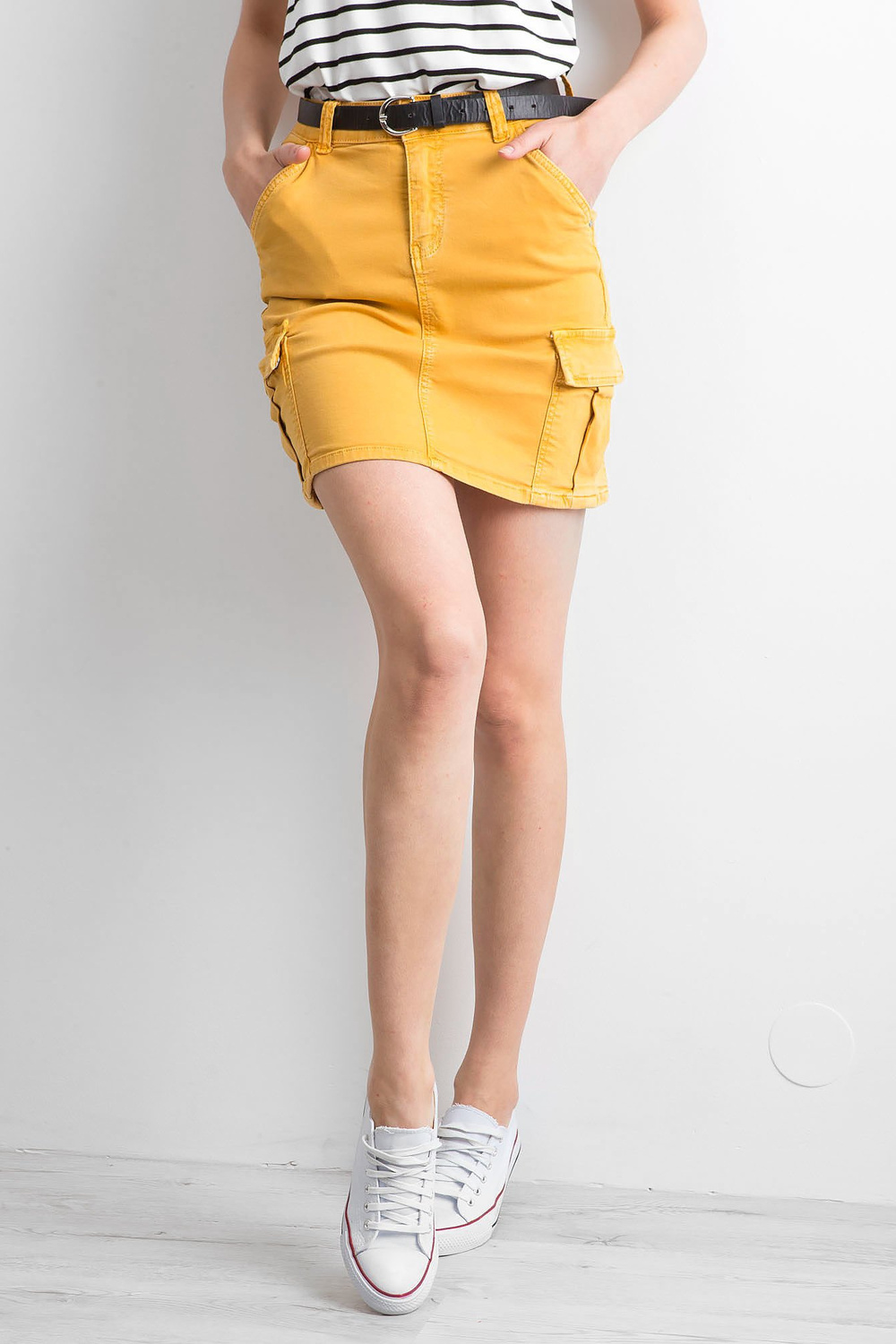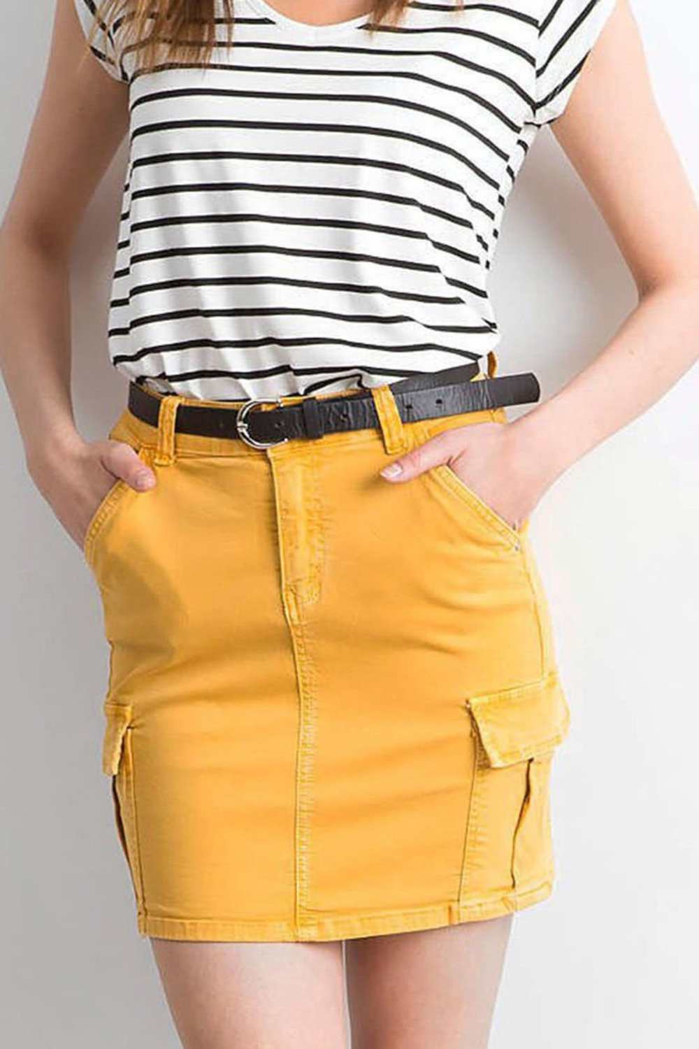 Dzelteni džinsa svārki ar kabatām .