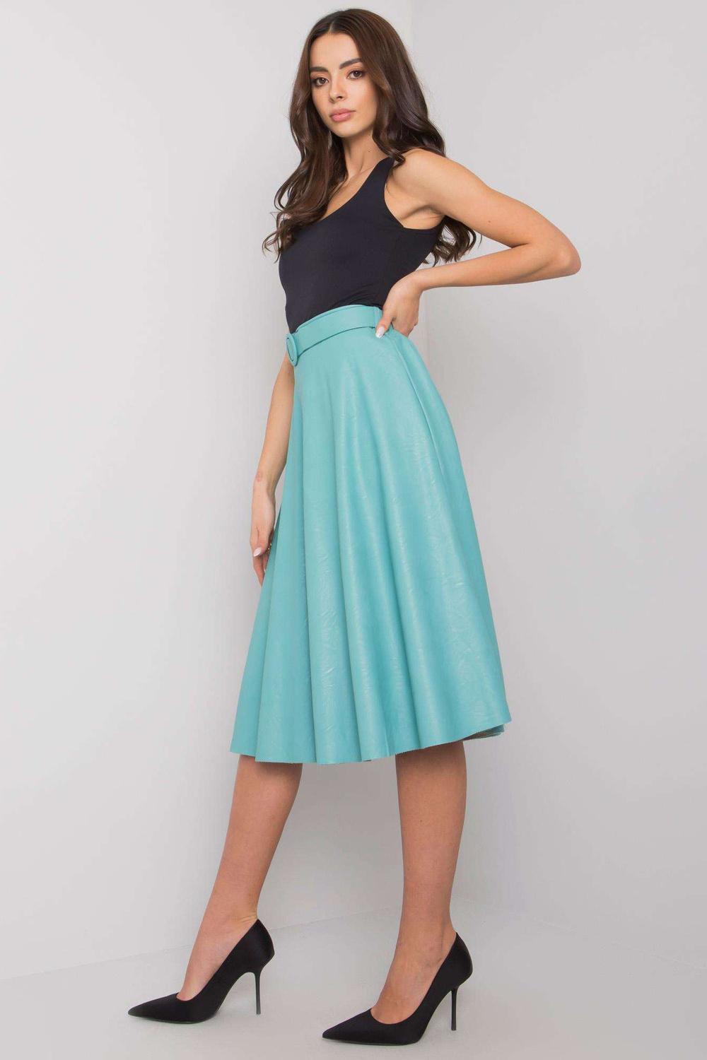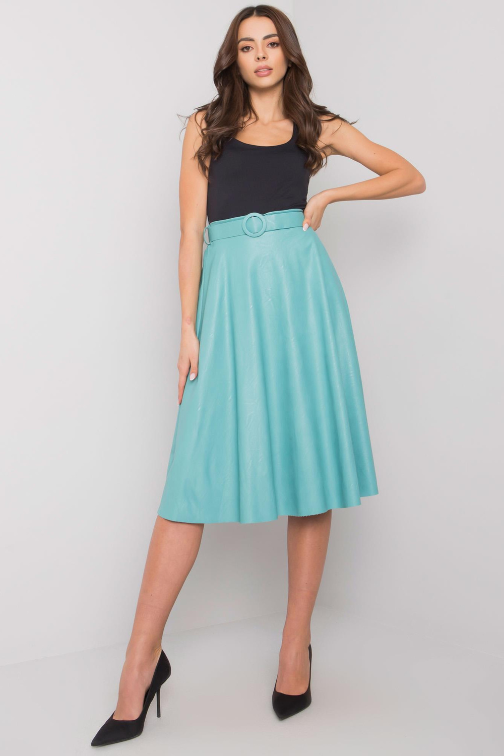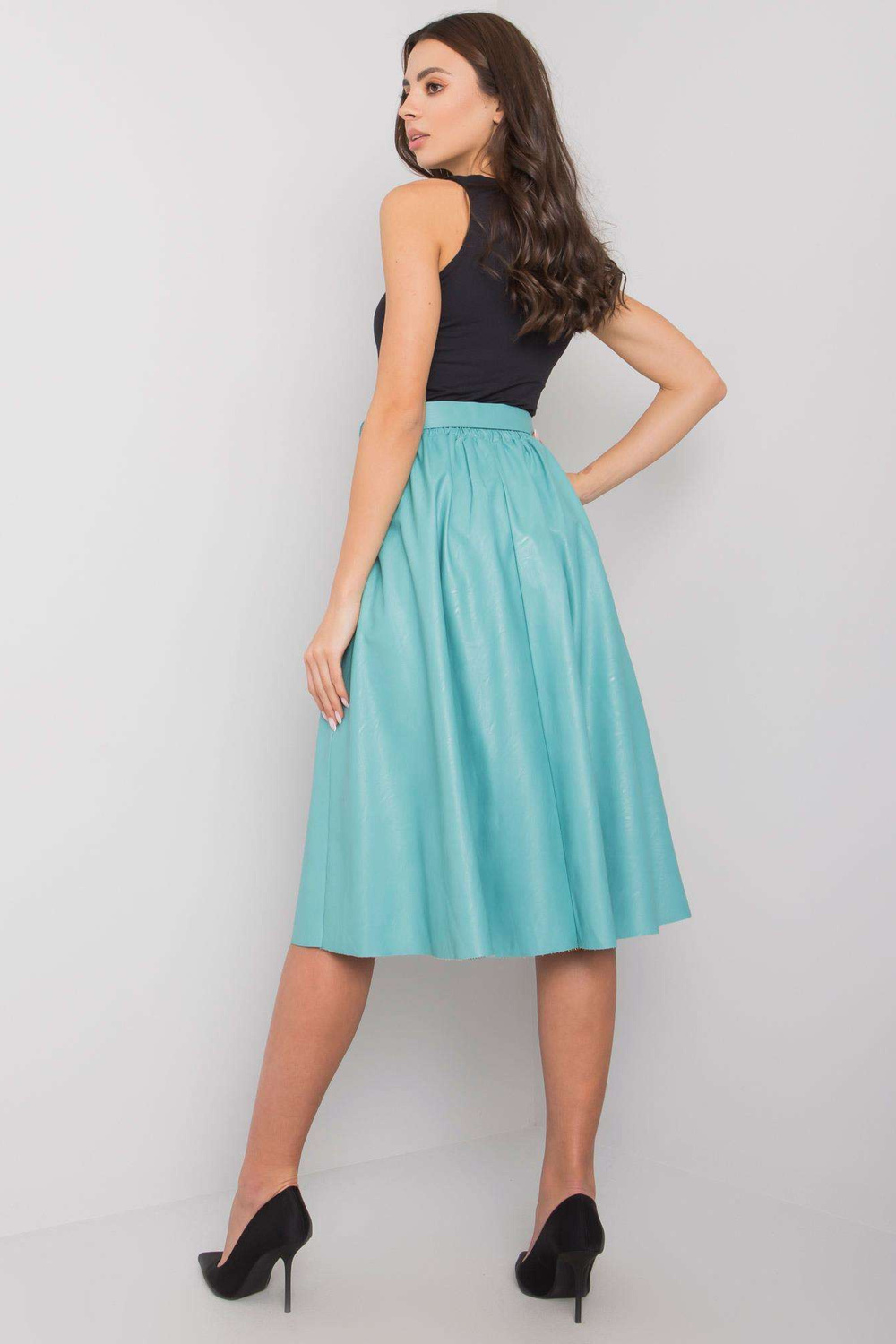 Tirkīza svārki no Gerrie ādas. ekstras: siksniņas materiālssastāvs: 55% viskoze, 45% poliuretāns mazgāšanas metode: veļas mašīna 30°C. Modelis valkā vienu izmēru. Modeļa izmēri: augums 175 cm, krūtis 84 cm, viduklis 61 cm, gurni 91 cm. Di