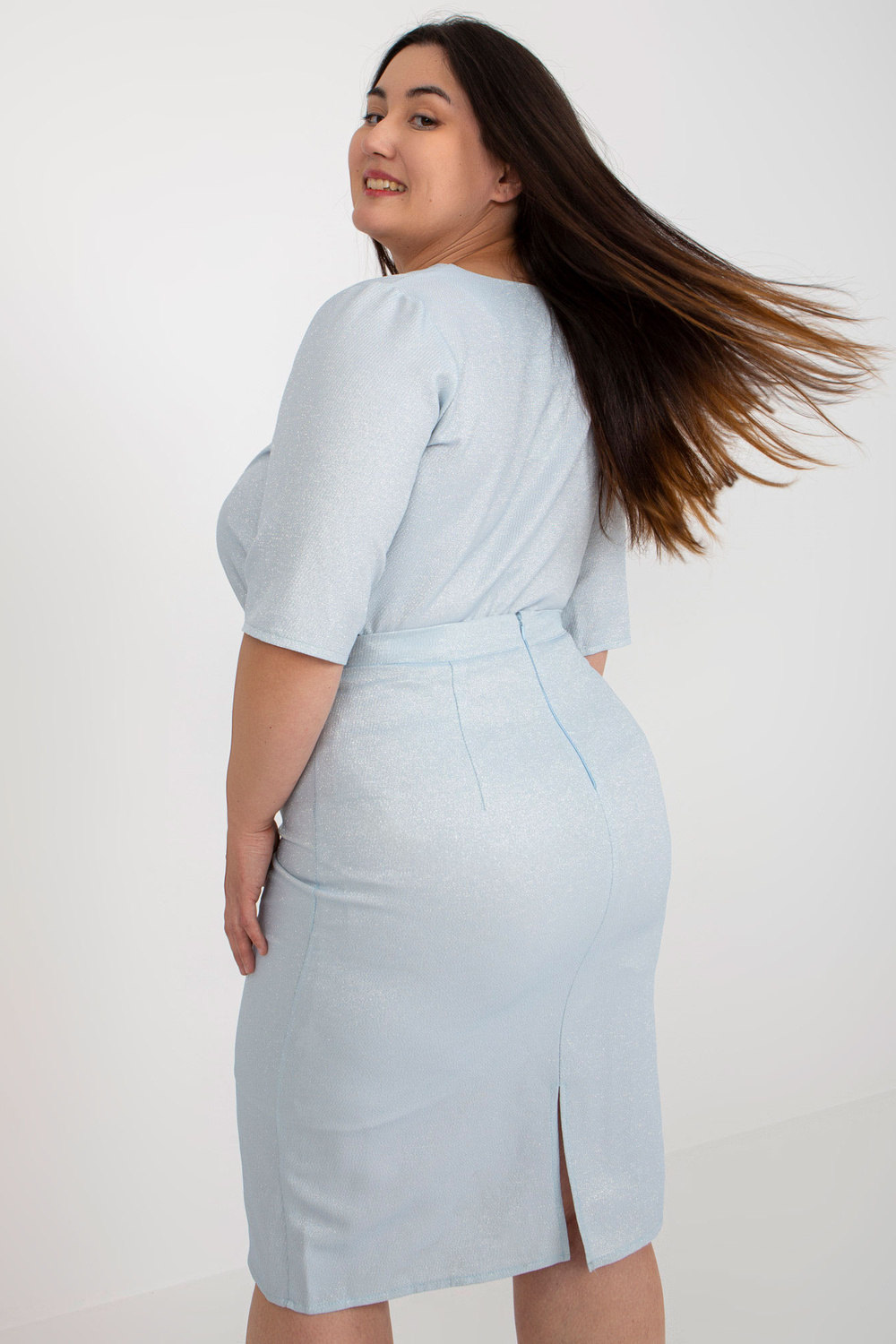 Modele valkā 48. izmēru. Modeļa izmēri: augums 167 cm, krūtis 102 cm, viduklis 81 cm, gurni 113 cm.