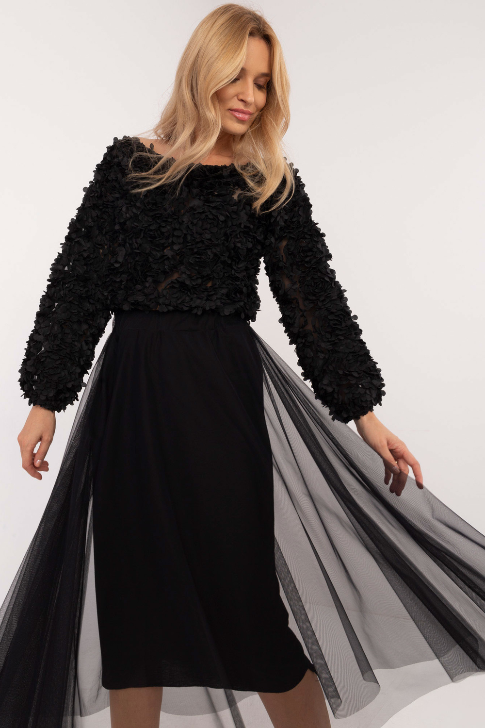 Modele valkā viena izmēra izmēru. Modeļa izmēri: augums 175 cm, krūtis 90 cm, viduklis 66 cm, gurni 94 cm.