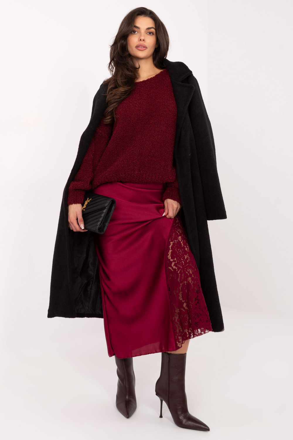 Modelis valkā viena izmēra apģērbu. Modeļa izmēri: augums 173 cm, krūtis 85 cm, viduklis 62 cm, gurni 95 cm.