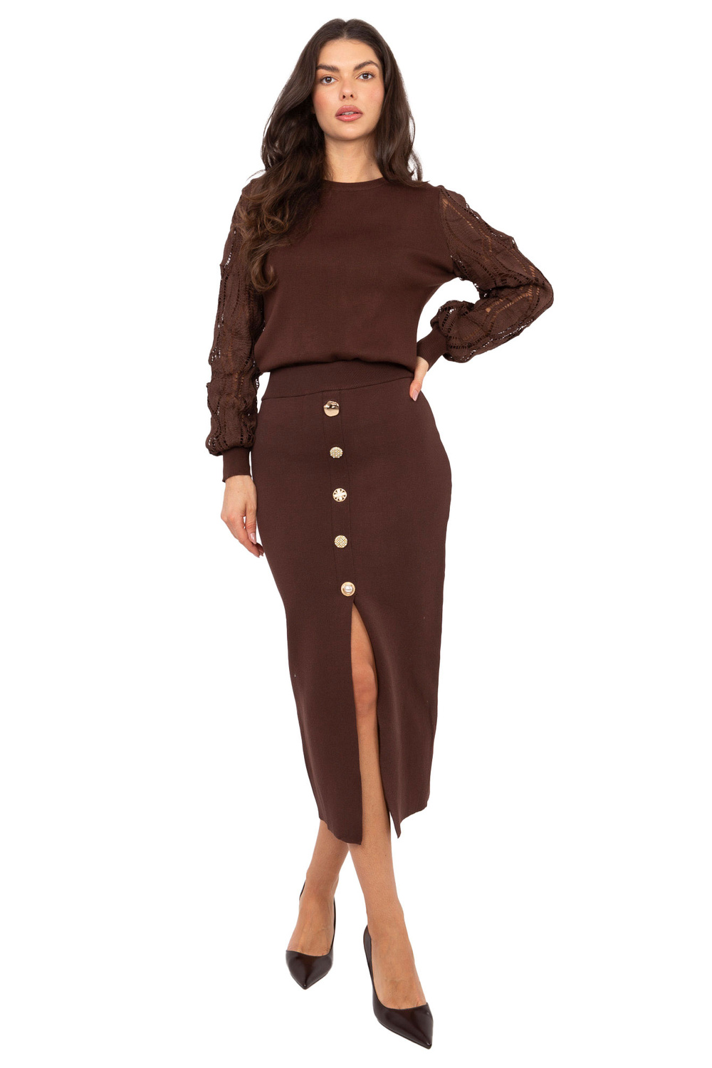Modelis valkā viena izmēra apģērbu. Modeļa izmēri: augums 173 cm, krūtis 85 cm, viduklis 62 cm, gurni 95 cm.