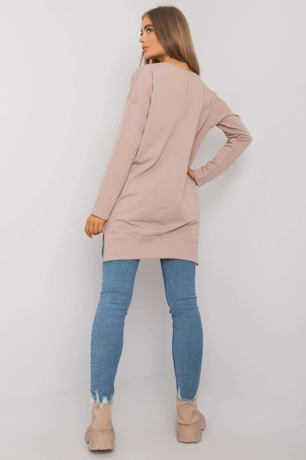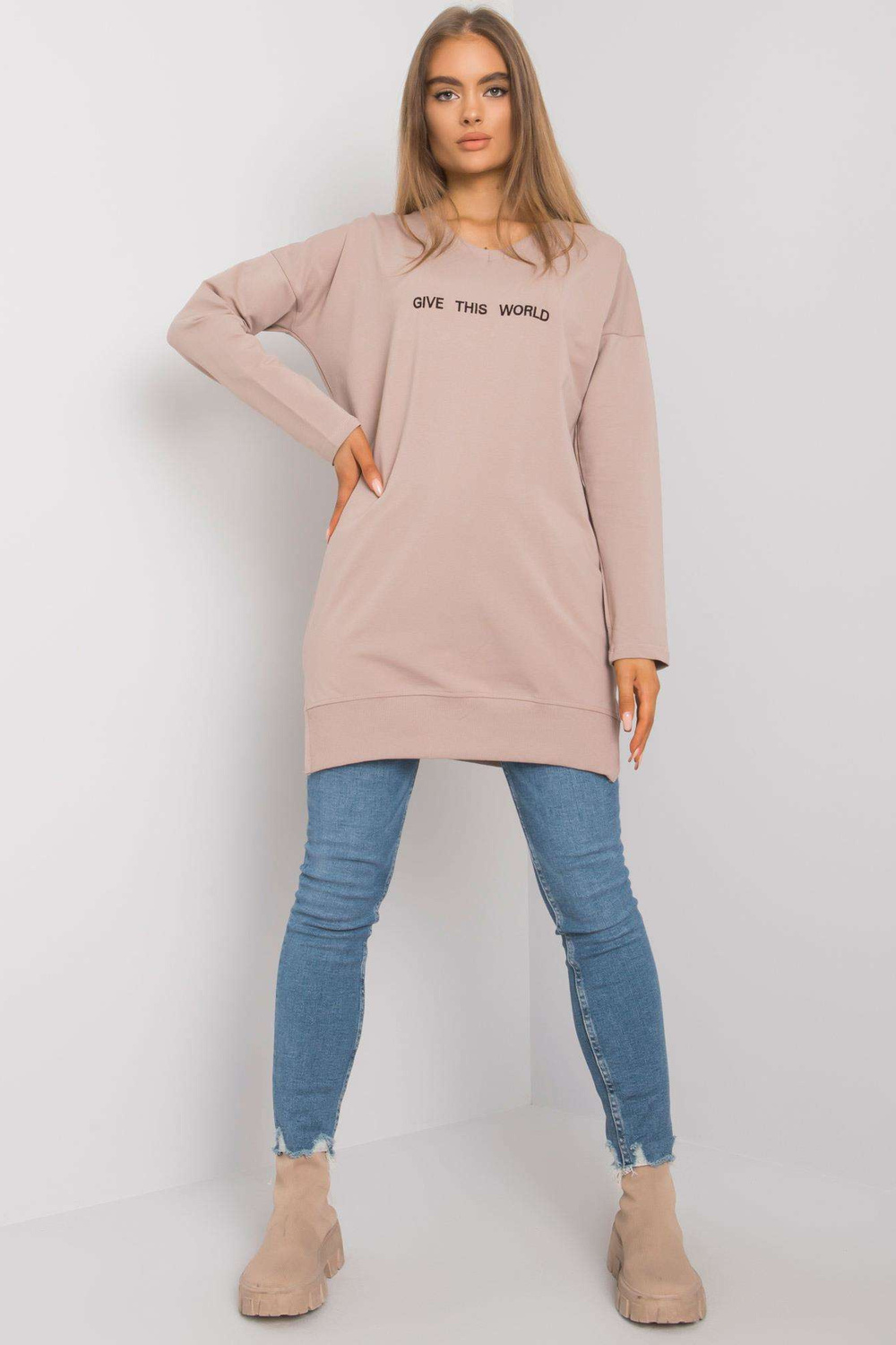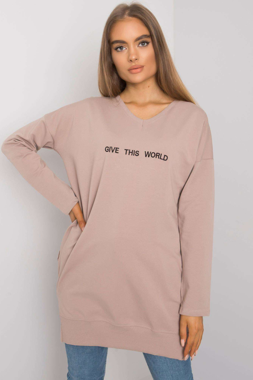Tunikas izmēri S/M, mērot plakanā stāvoklī: platums zem padusēm - 55 cm, piedurknes garums - 60 cm, kopējais garums - 80 cm