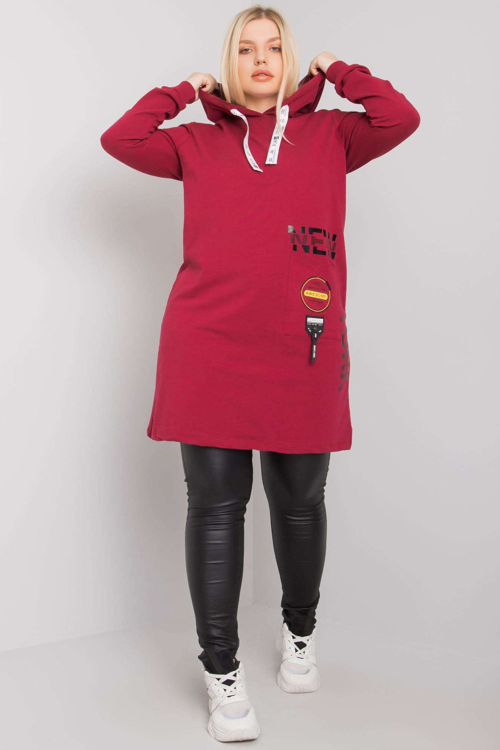 Burgunditunika liela izmēra ar Ashford kapuci. Ekstras: kabatas materiālssastāvs: 90% kokvilna, 10% elastāns mazgāšanas metode: mazgāšana veļasmašīnā 30°C. Modelis valkā viena izmēra izmēru. Modeļa izmēri: augums 172 cm, krūtis 102 cm, viduklis 77 cm, gurni 118 cm. Dimetānnaftalīns