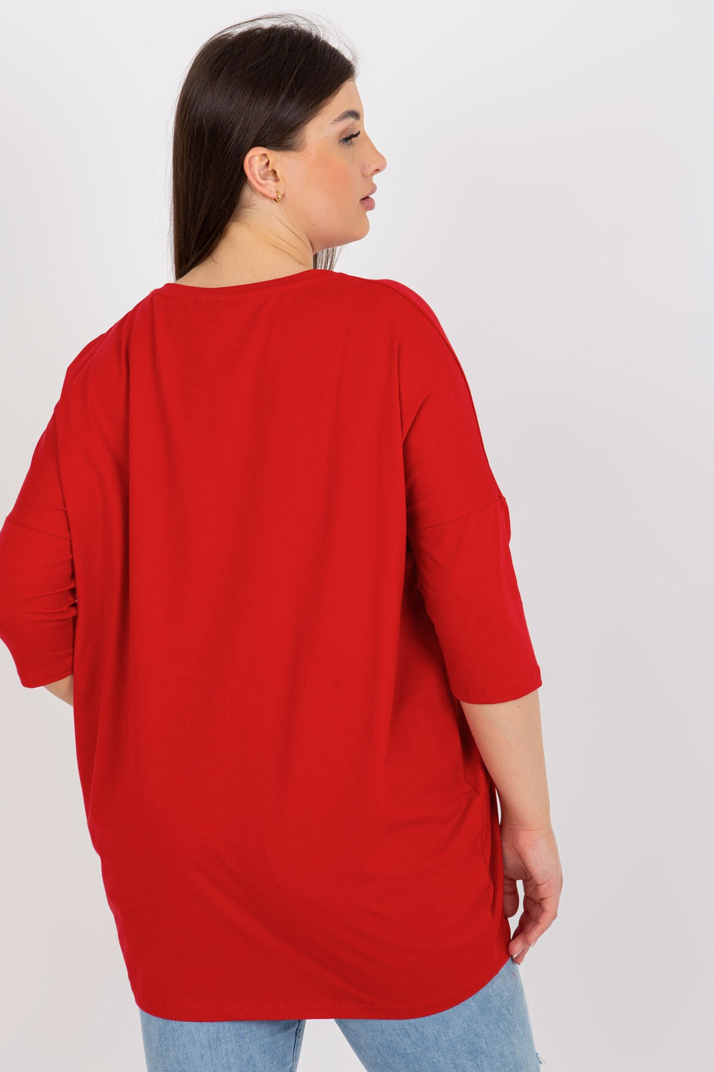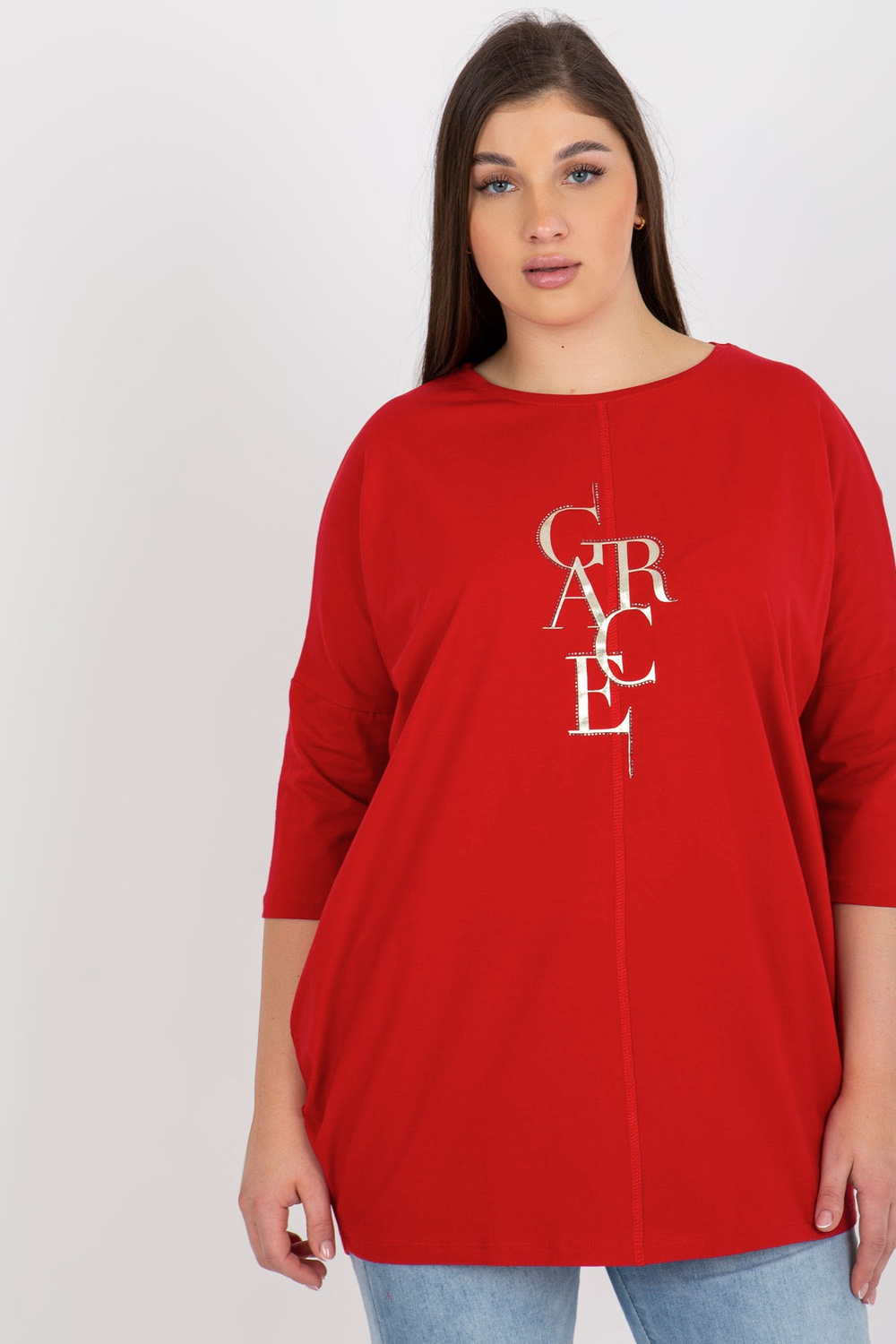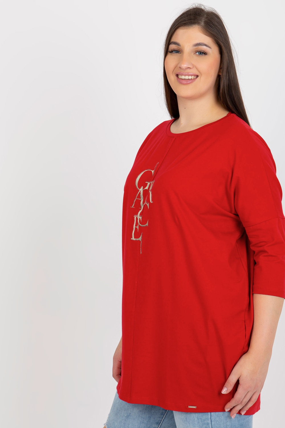 Sarkana liela izmēra blūze ar rhinestones aplikāciju.