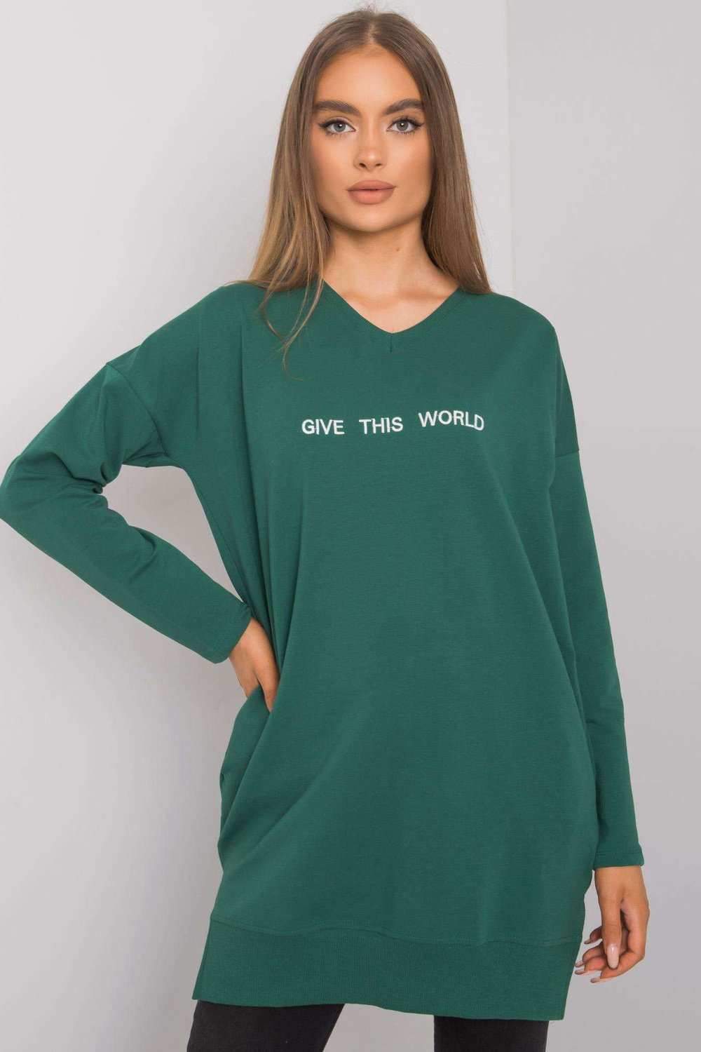 Tunikas izmēri S/M, mērot plakanā stāvoklī: platums zem padusēm - 55 cm, piedurknes garums - 60 cm, kopējais garums - 80 cm