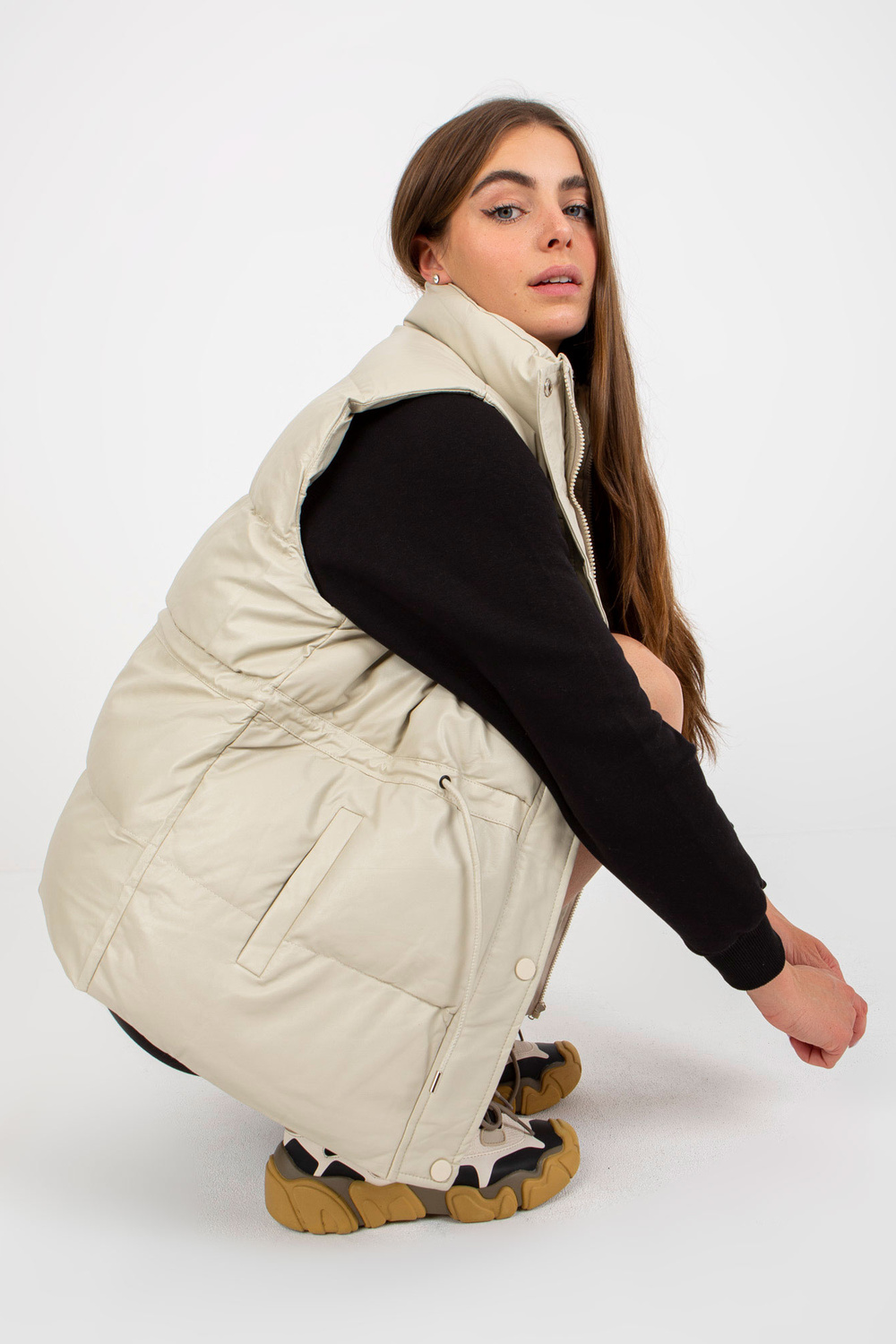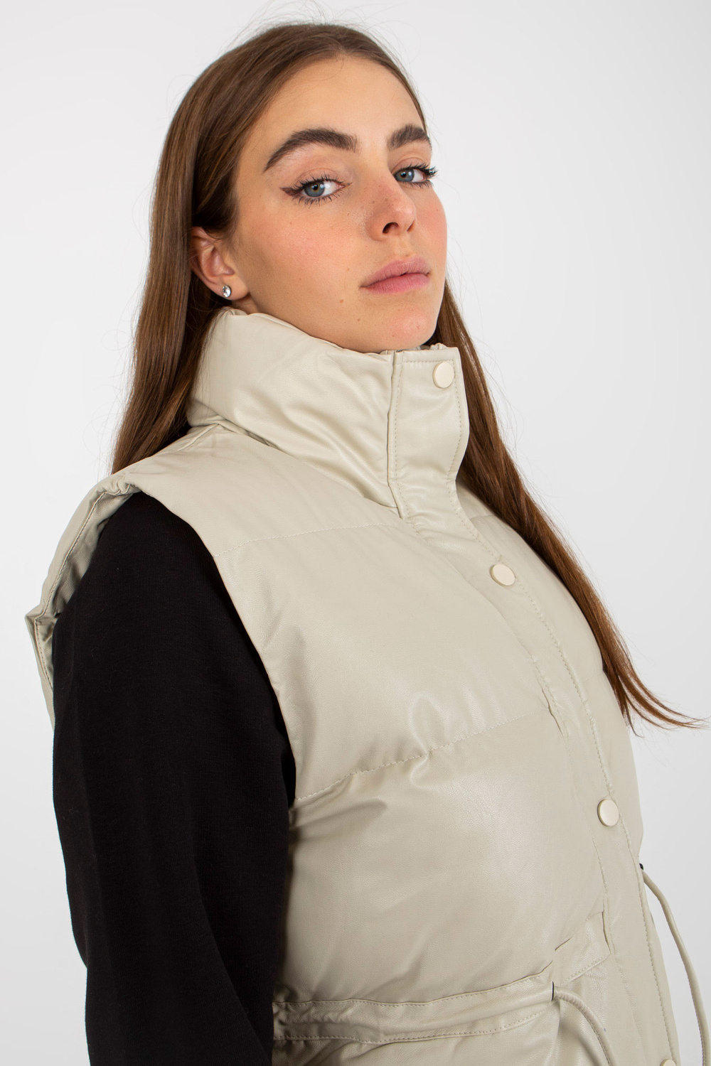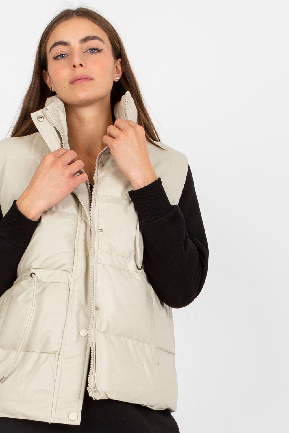 Gaiši bēša dūnu veste no eko ādas ar vatējumu.