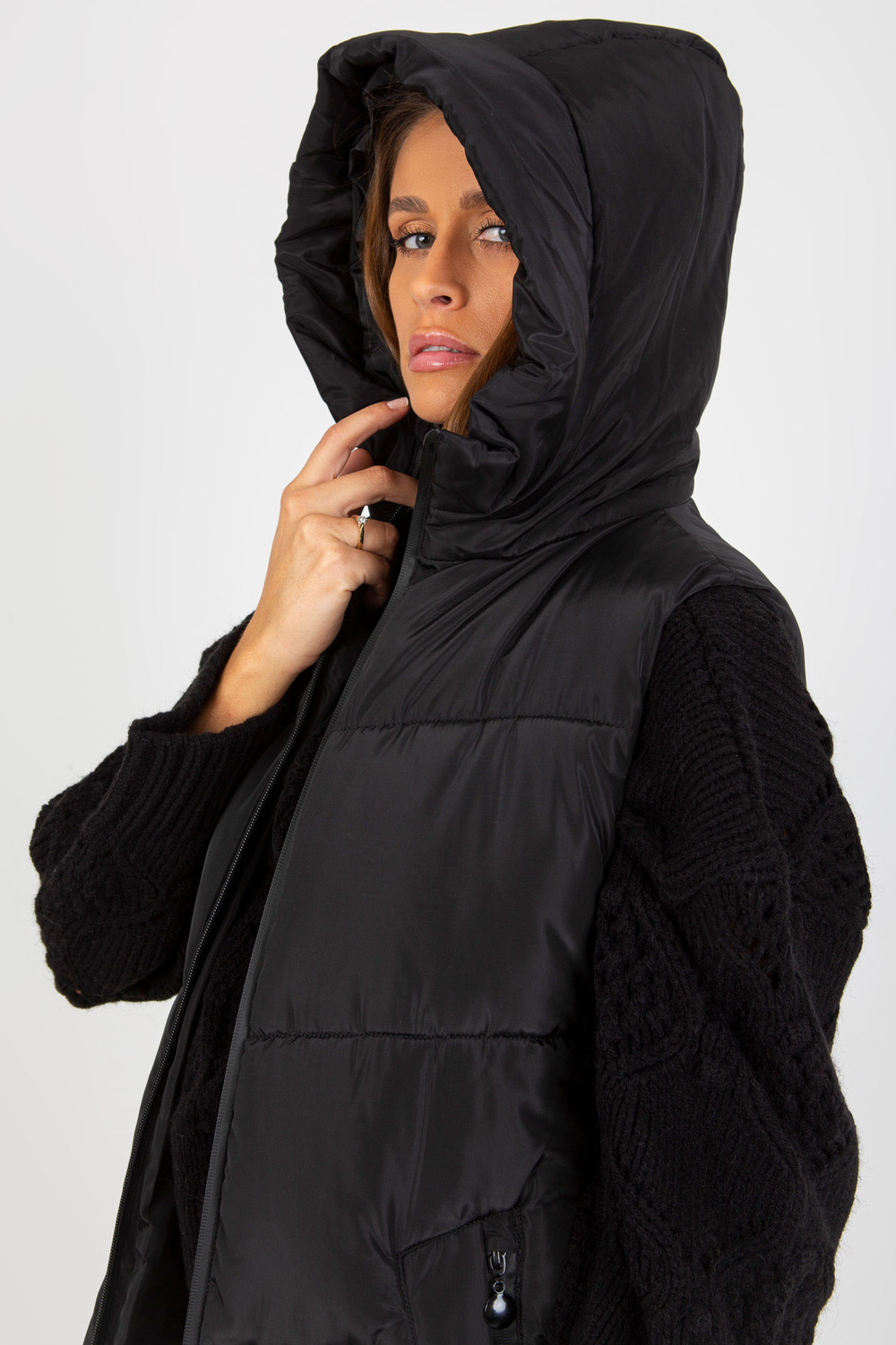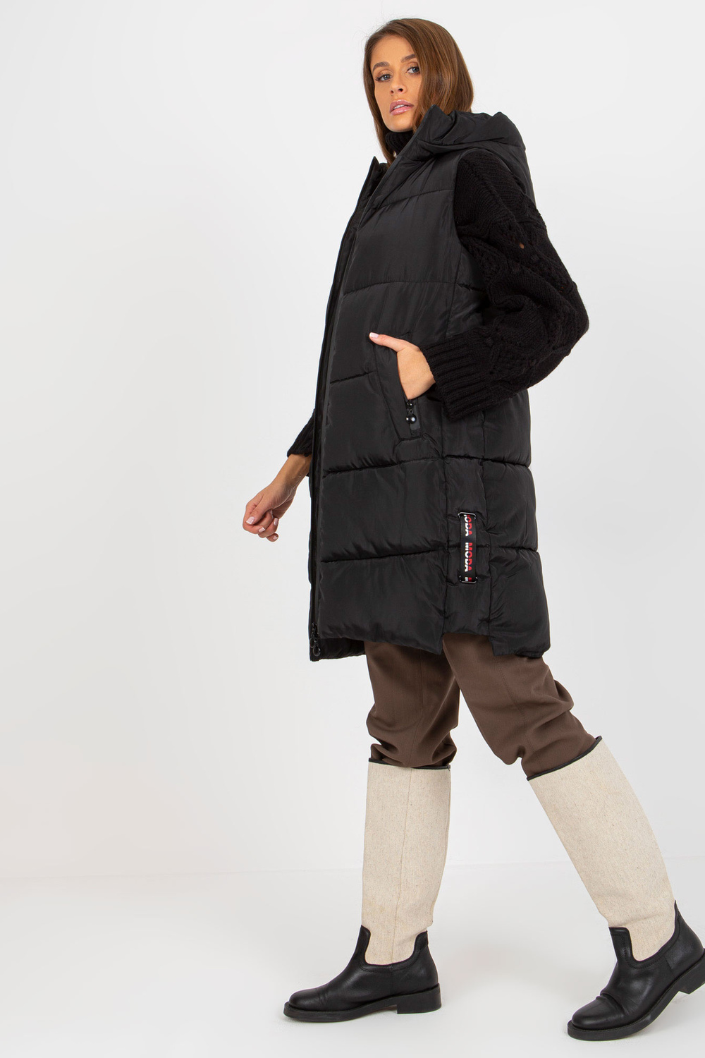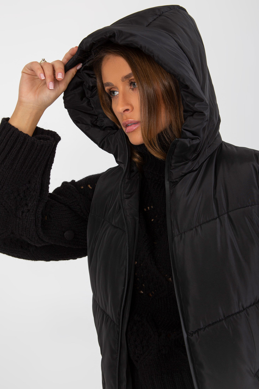 Schwarze lange Daunenweste mit Kapuze und Taschen.