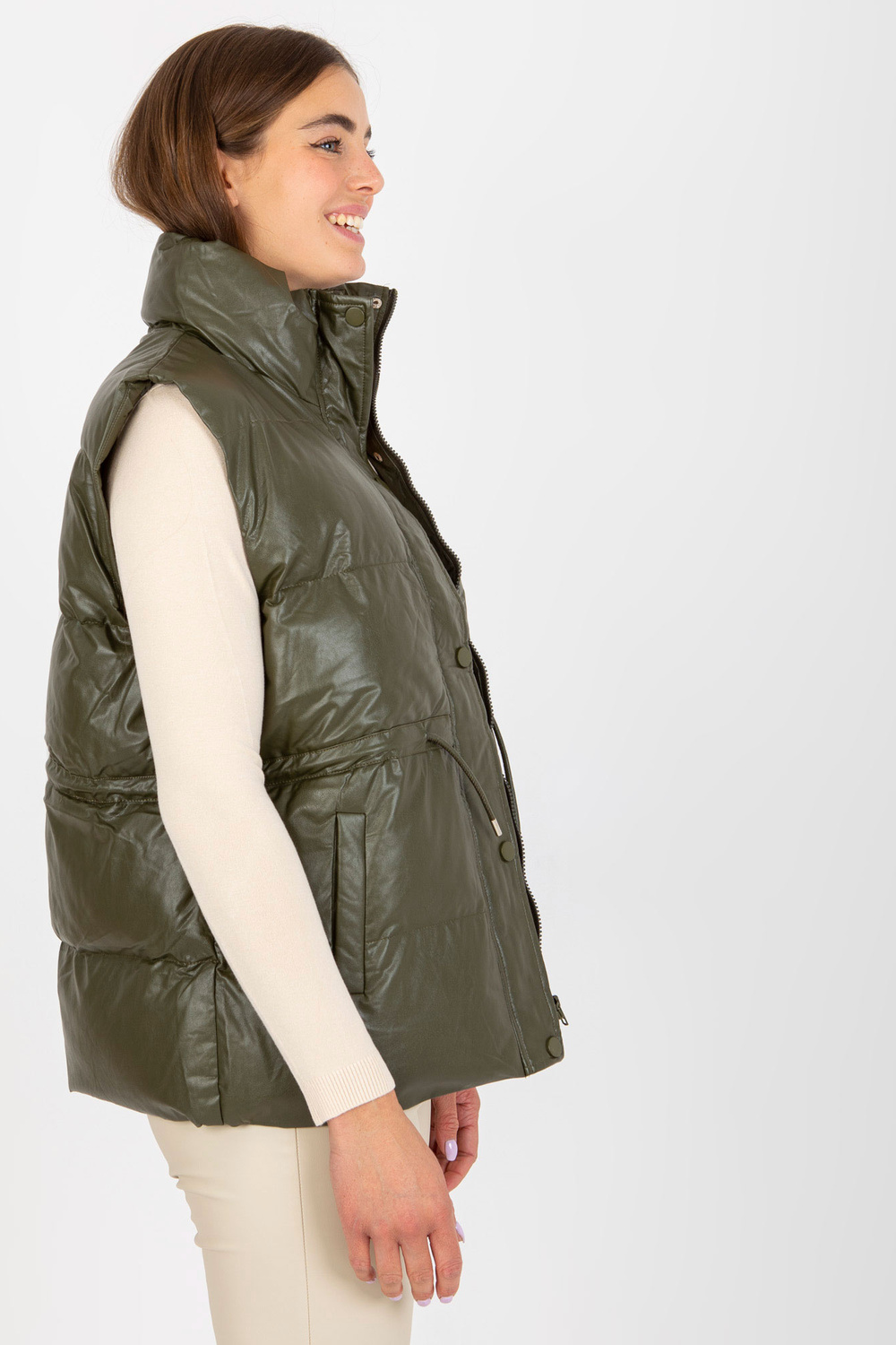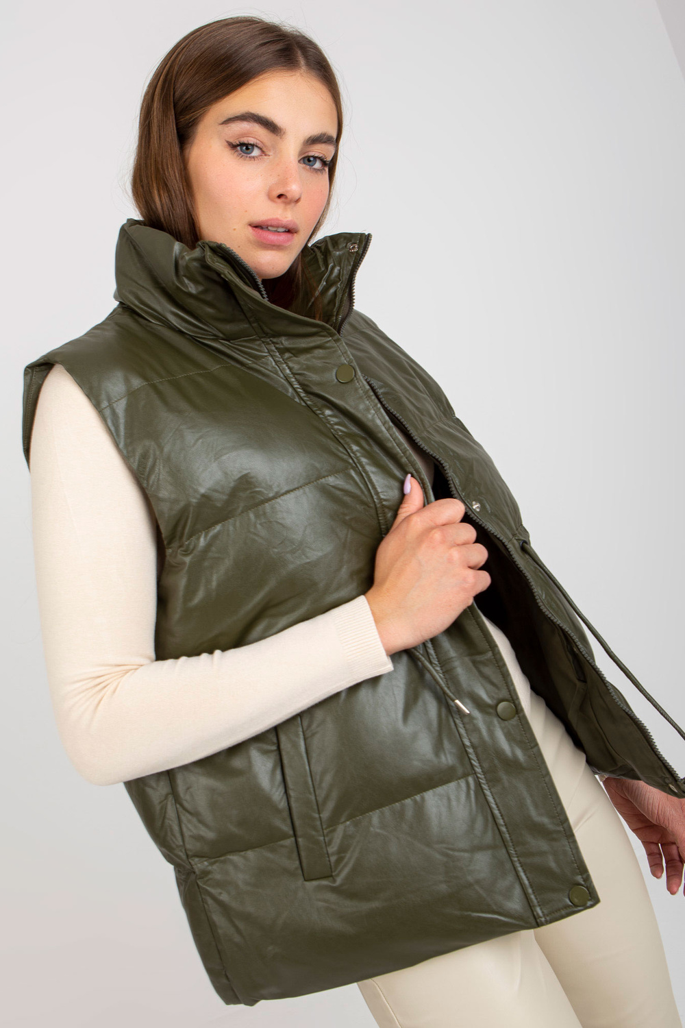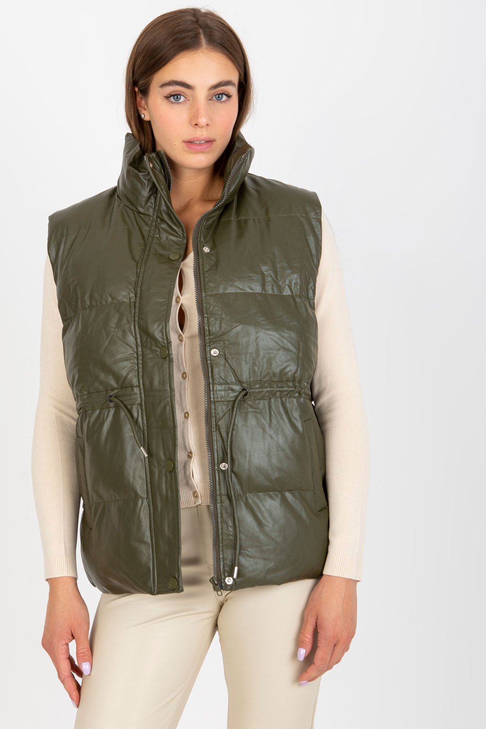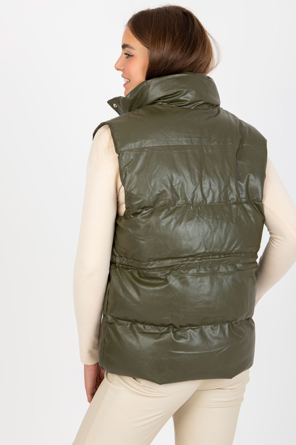 Khaki krāsas dūnu veste, kas izgatavota no eko-ādas ar velmēm.