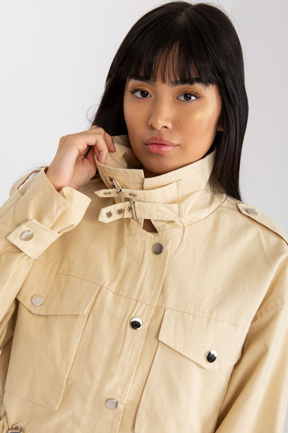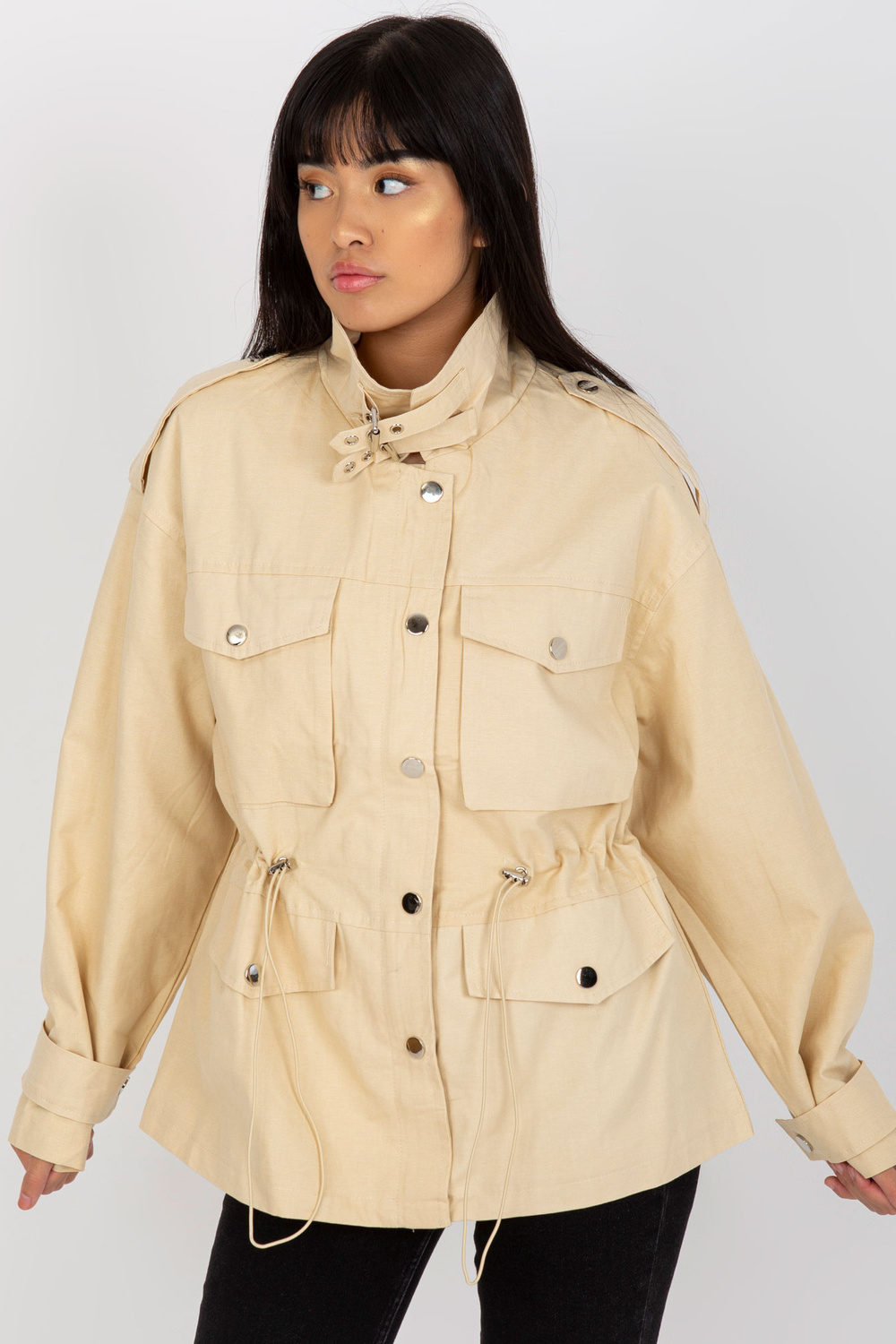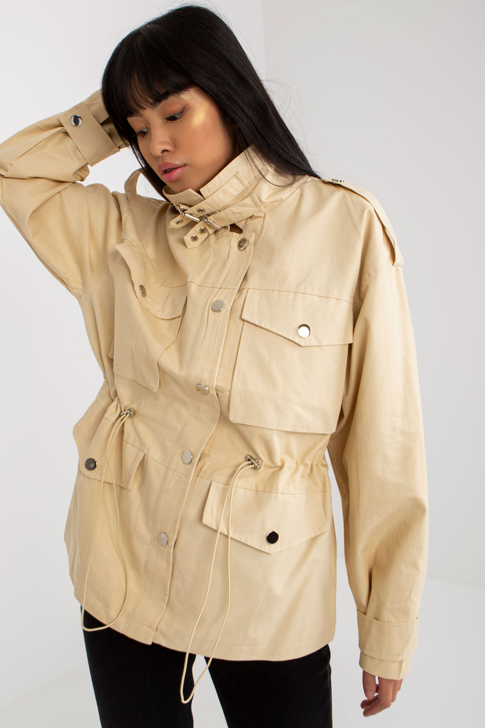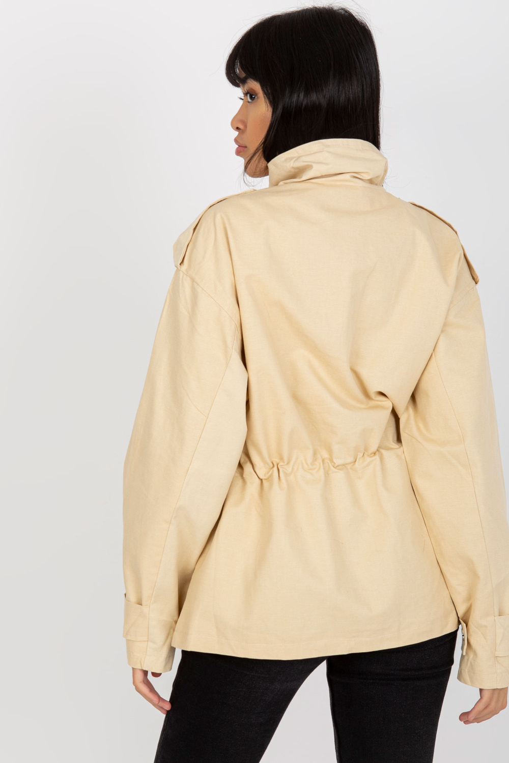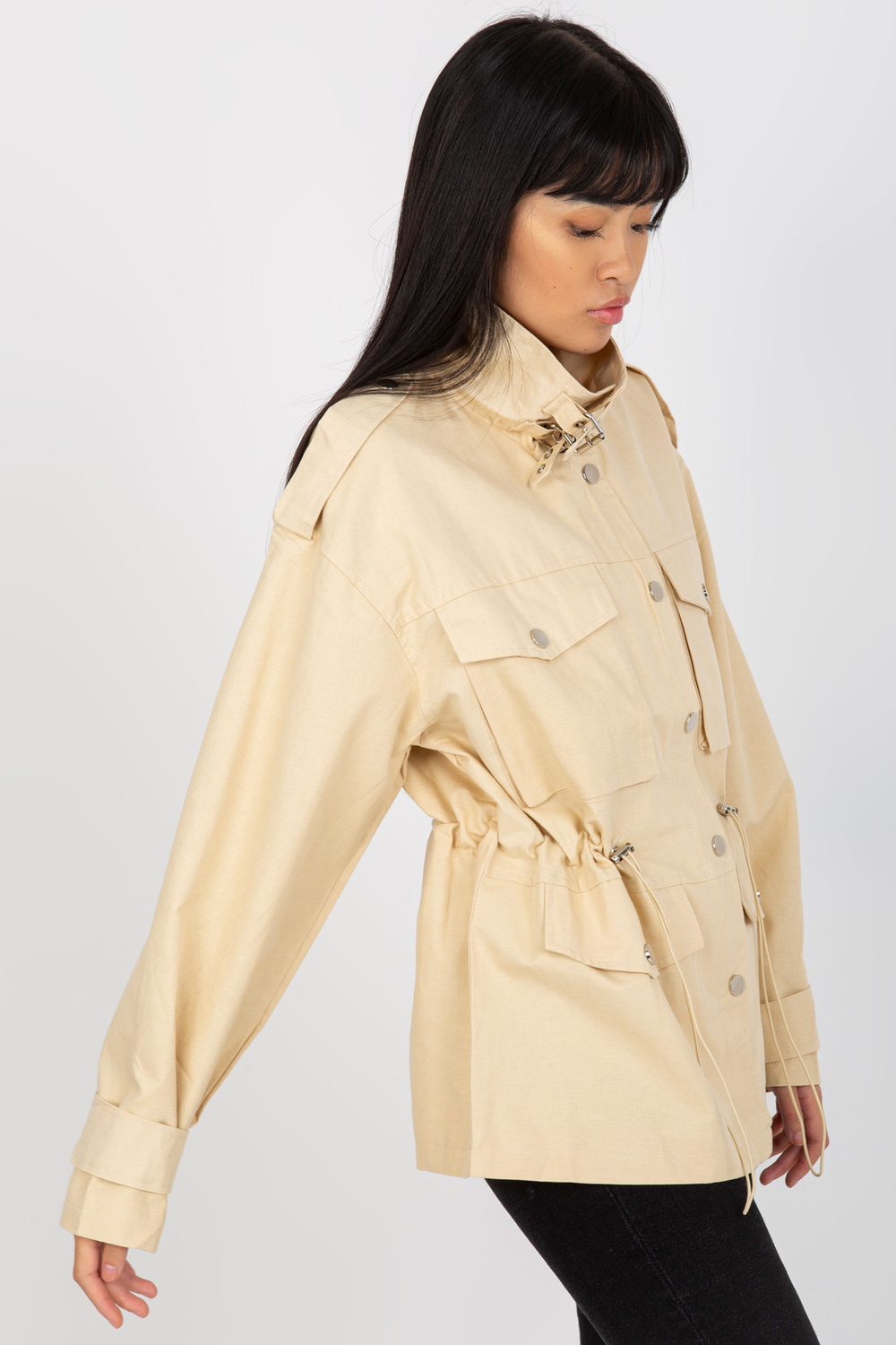 Gaiši bēša kokvilnas pārejas jaka ar kabatām.