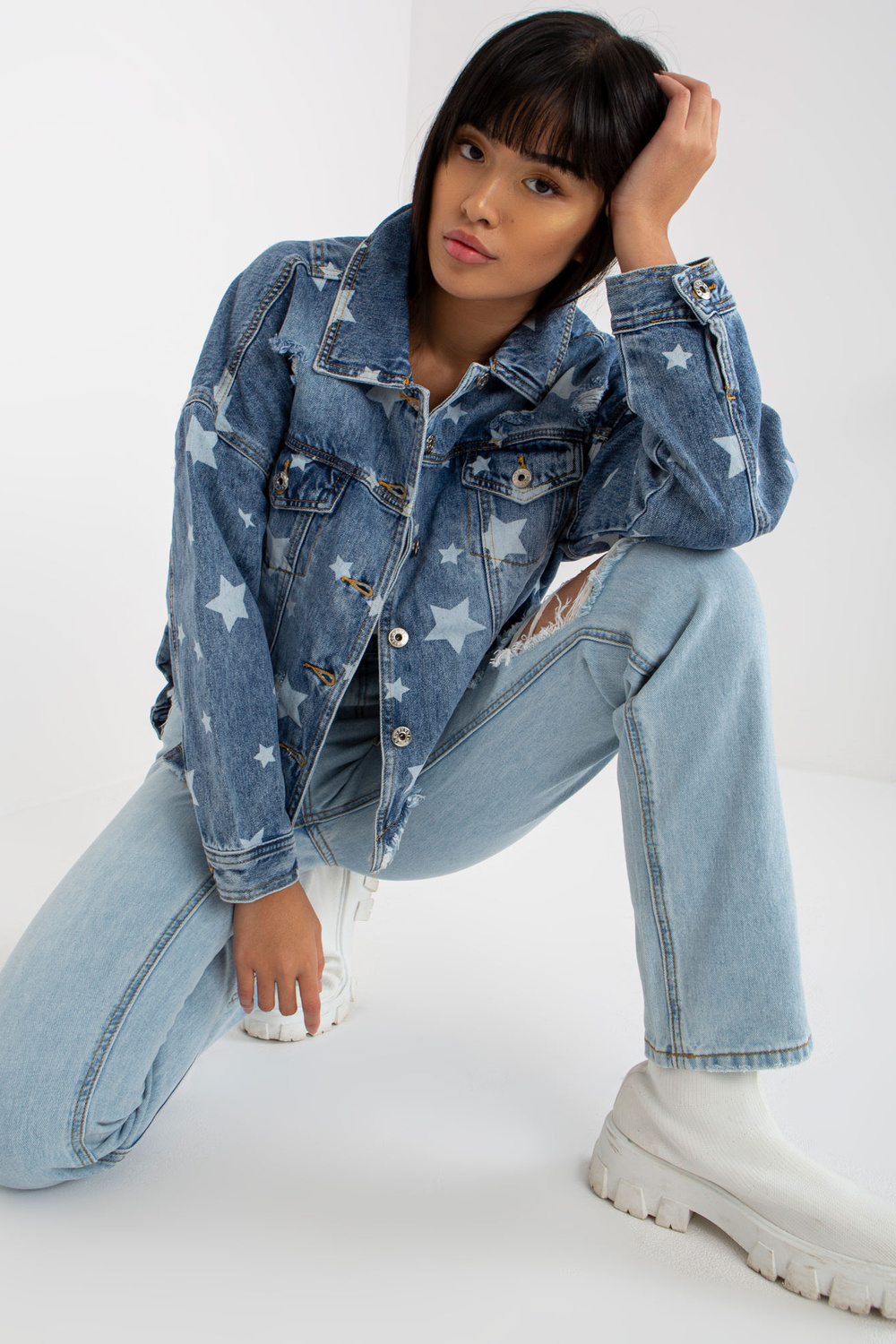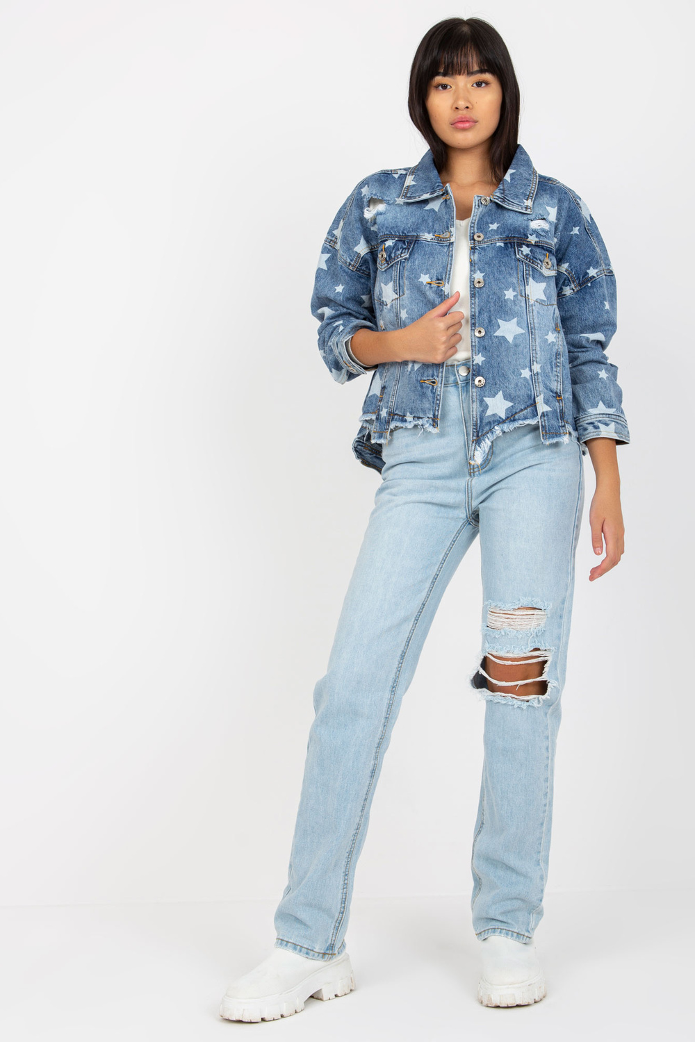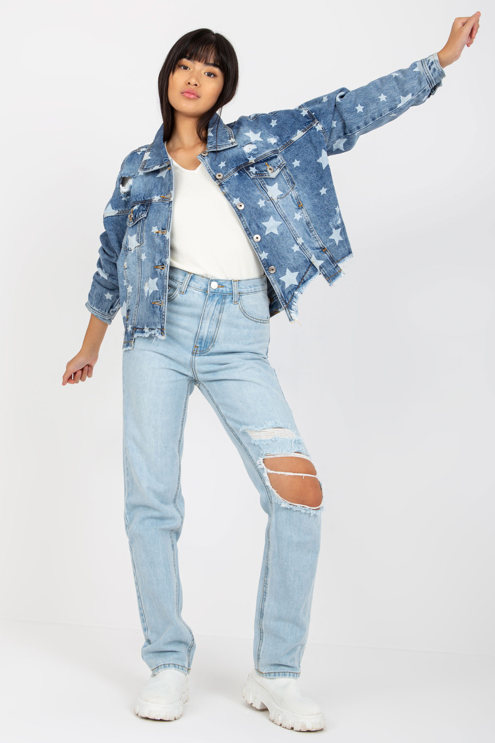Zila sieviešu džinsa jaka ar apdruku un caurumiem.