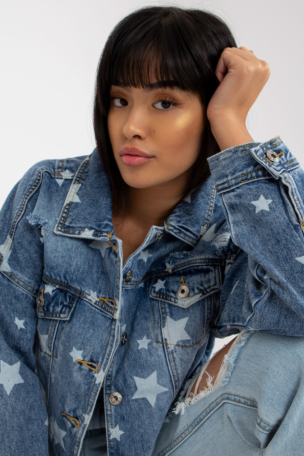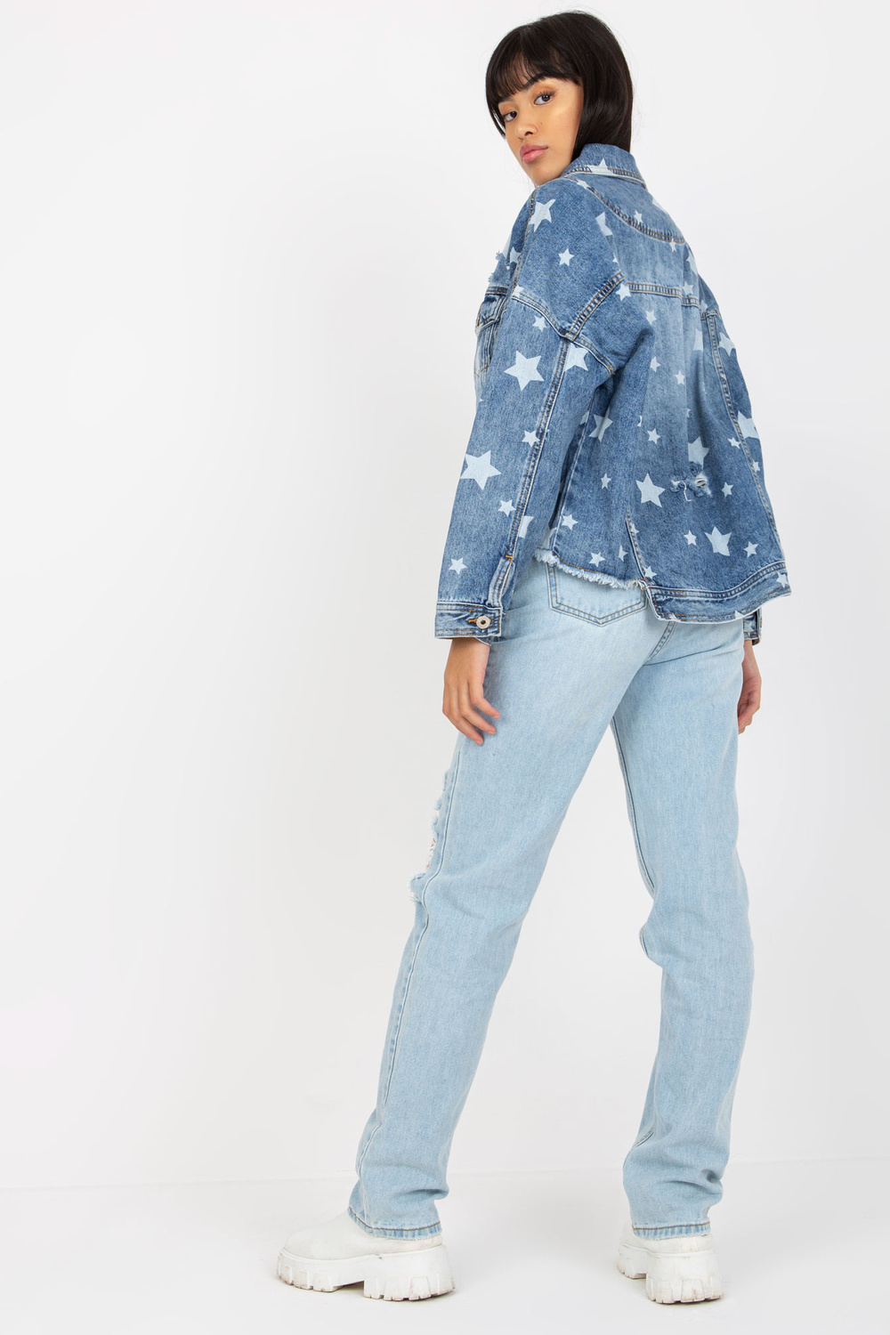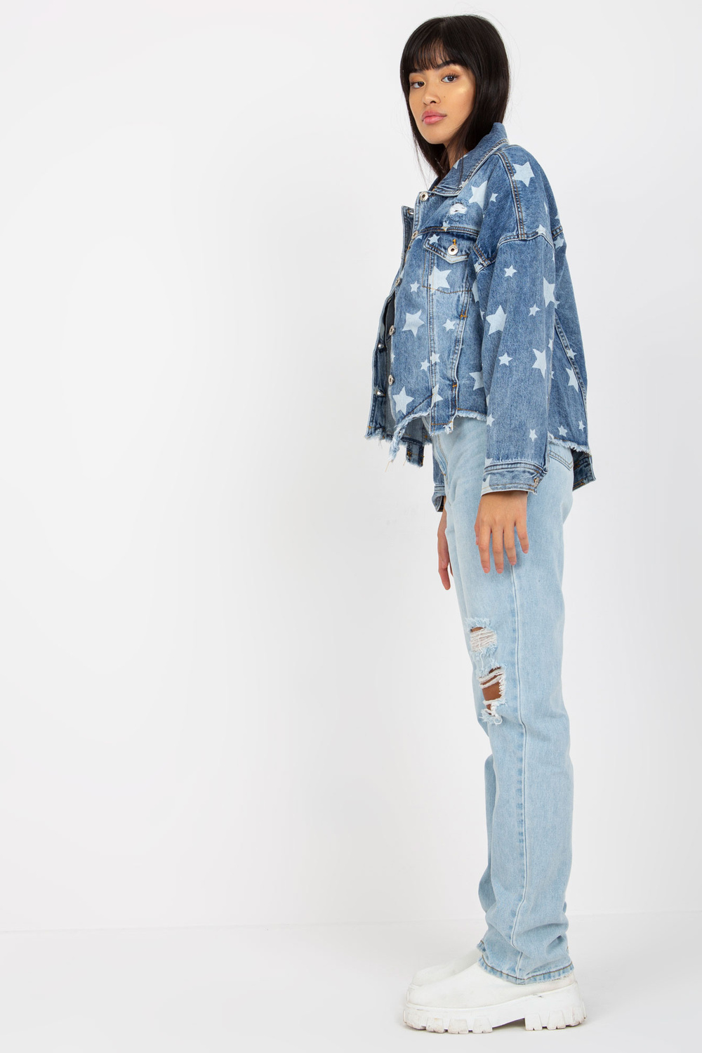 Zila sieviešu džinsa jaka ar apdruku un caurumiem.
