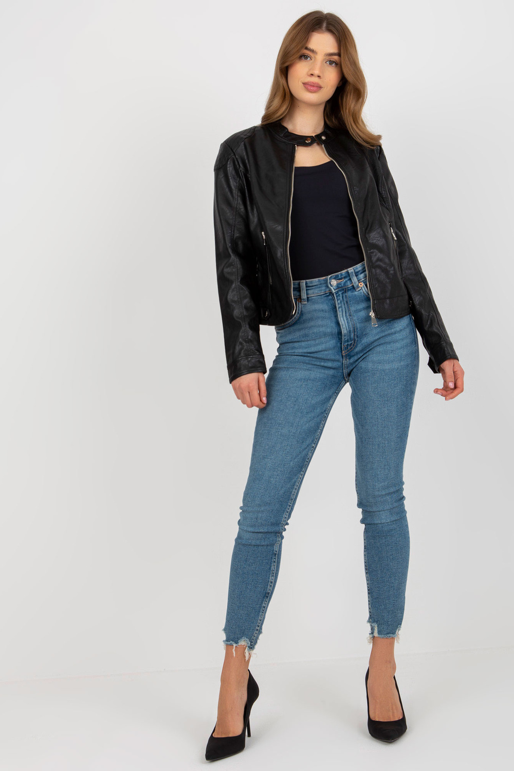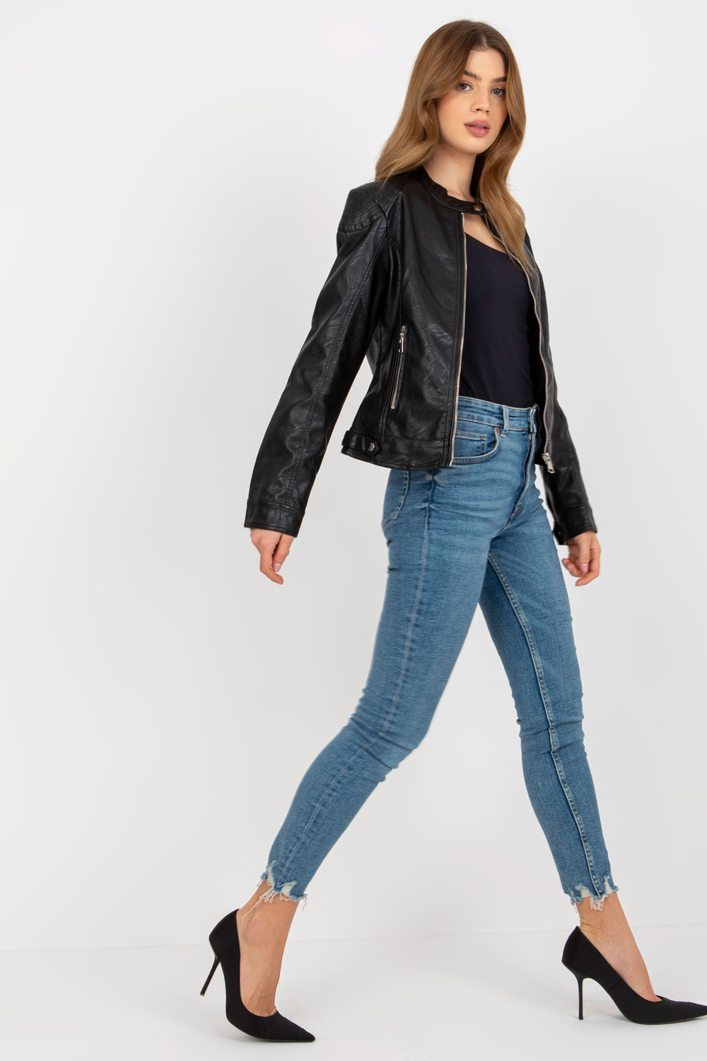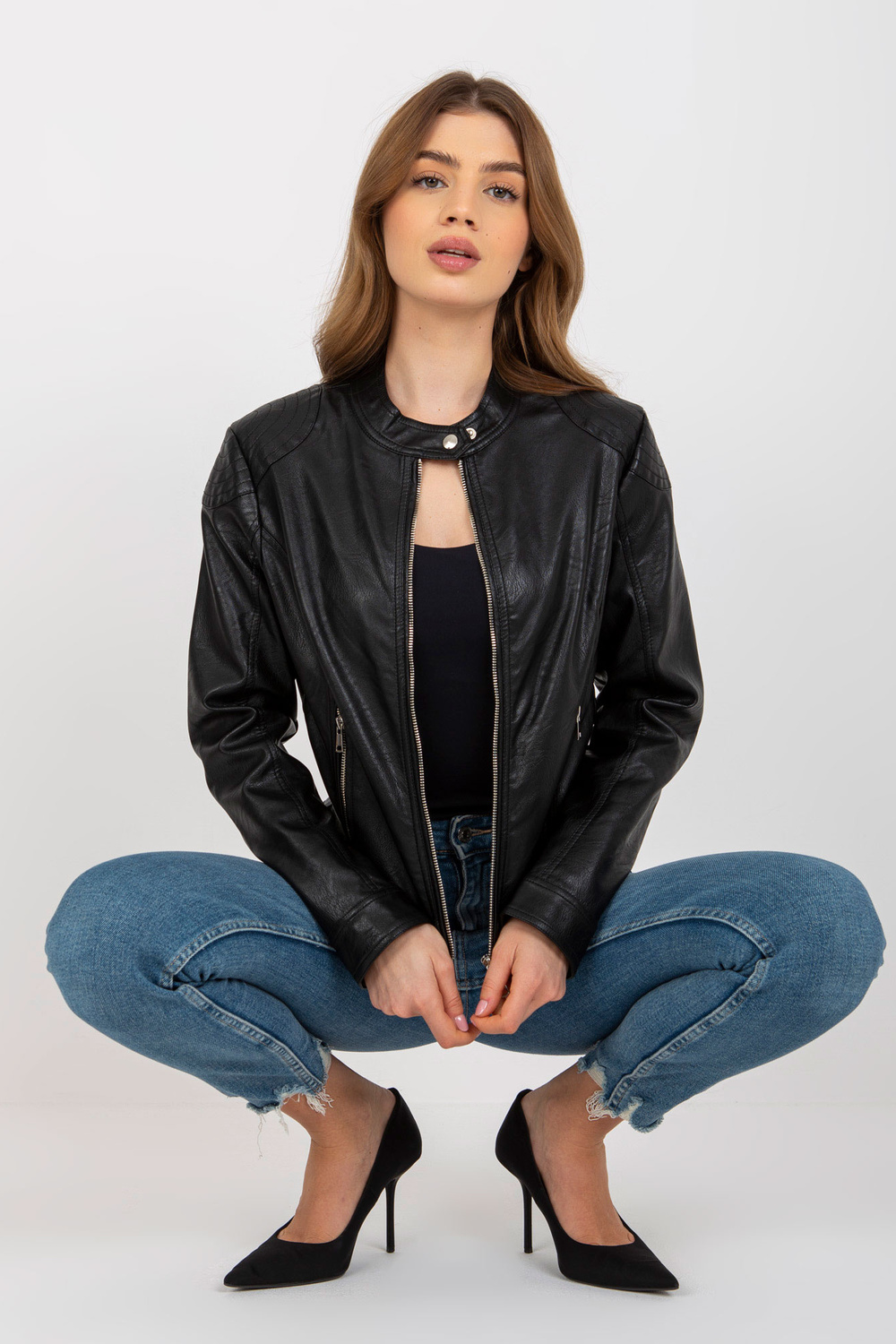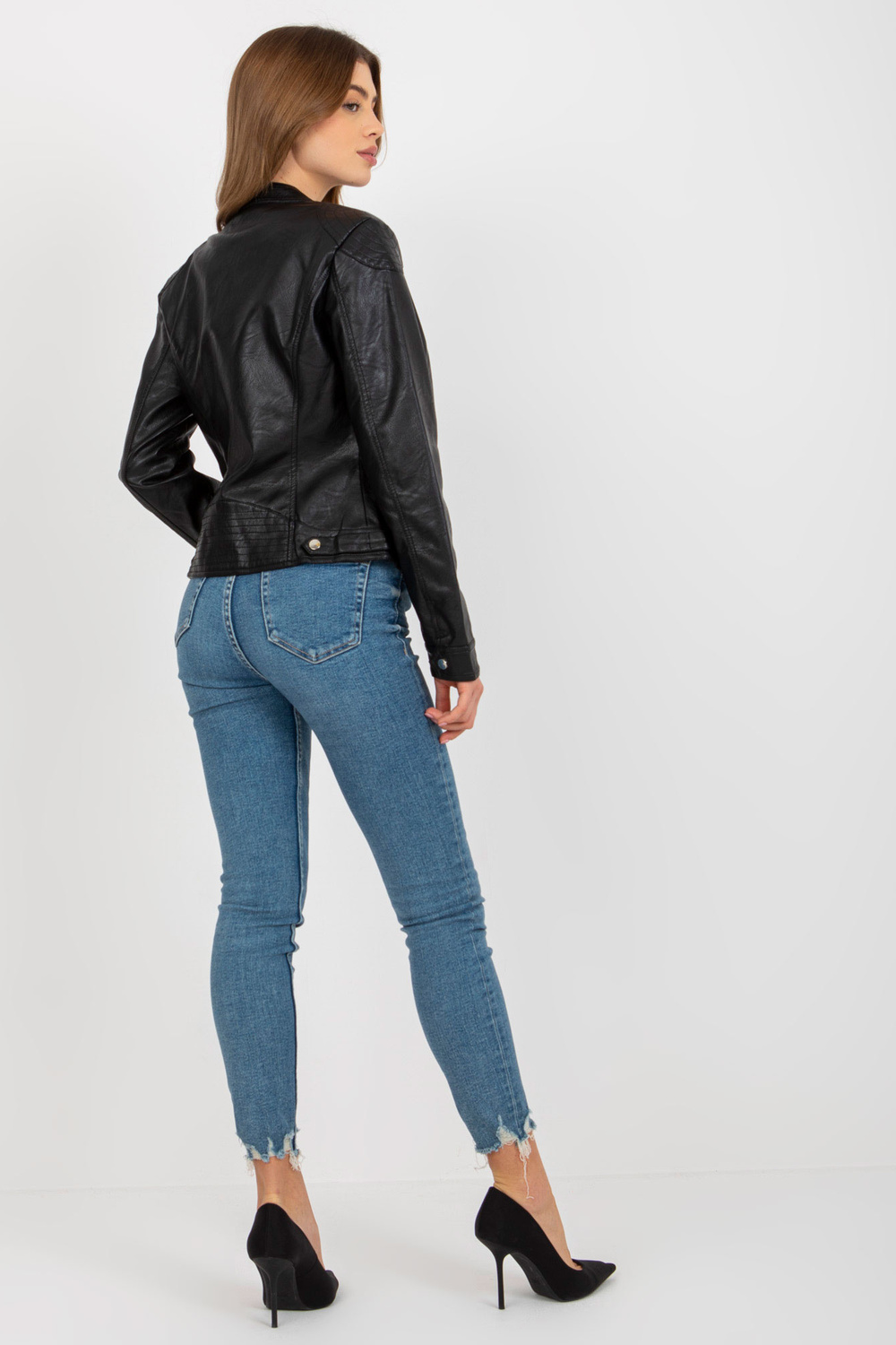Melna sieviešu eko-ādas motociklistu jaka ar vatējumu.