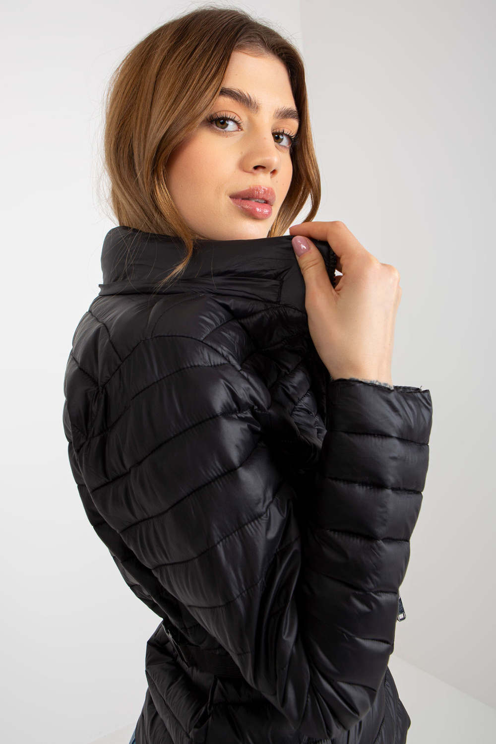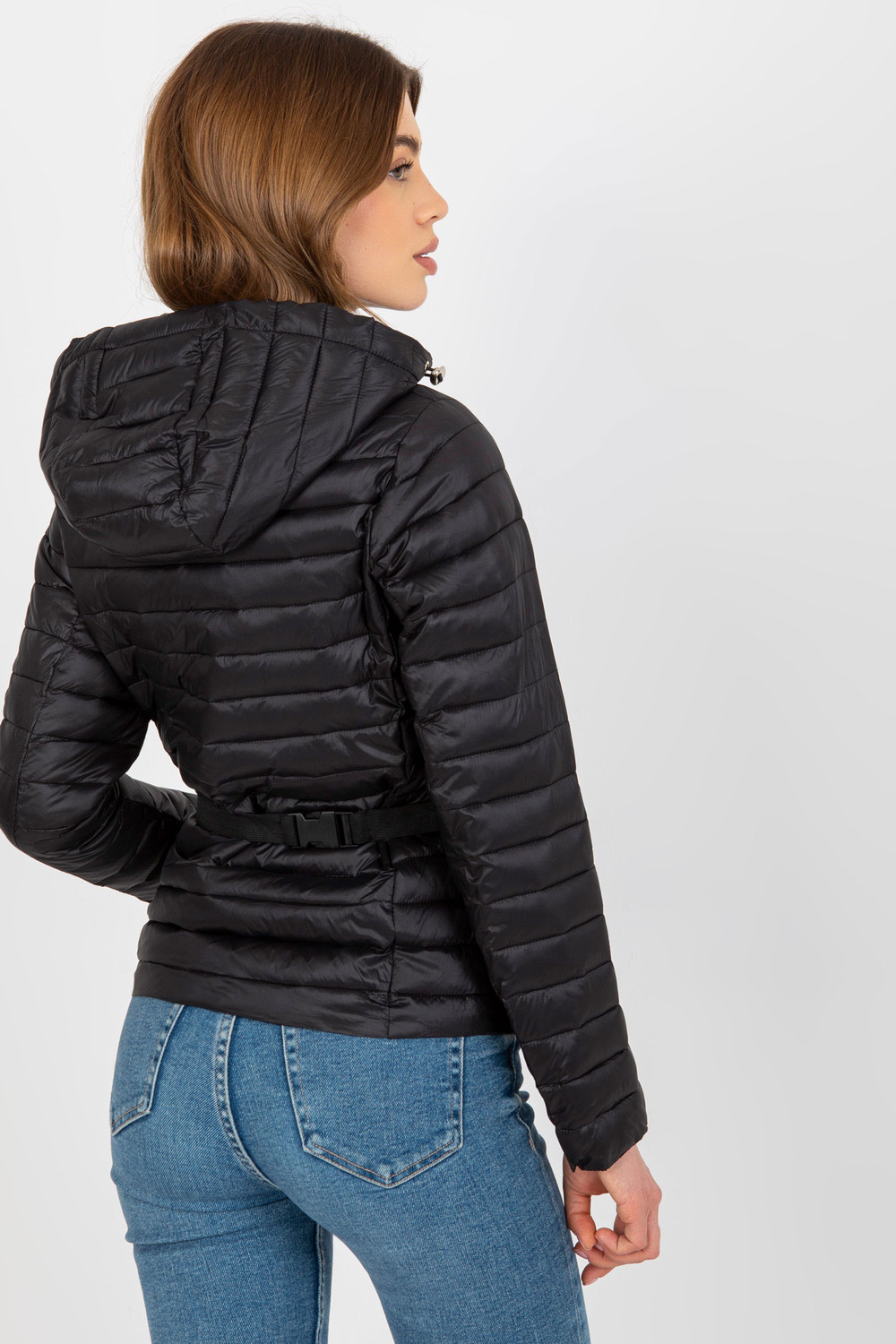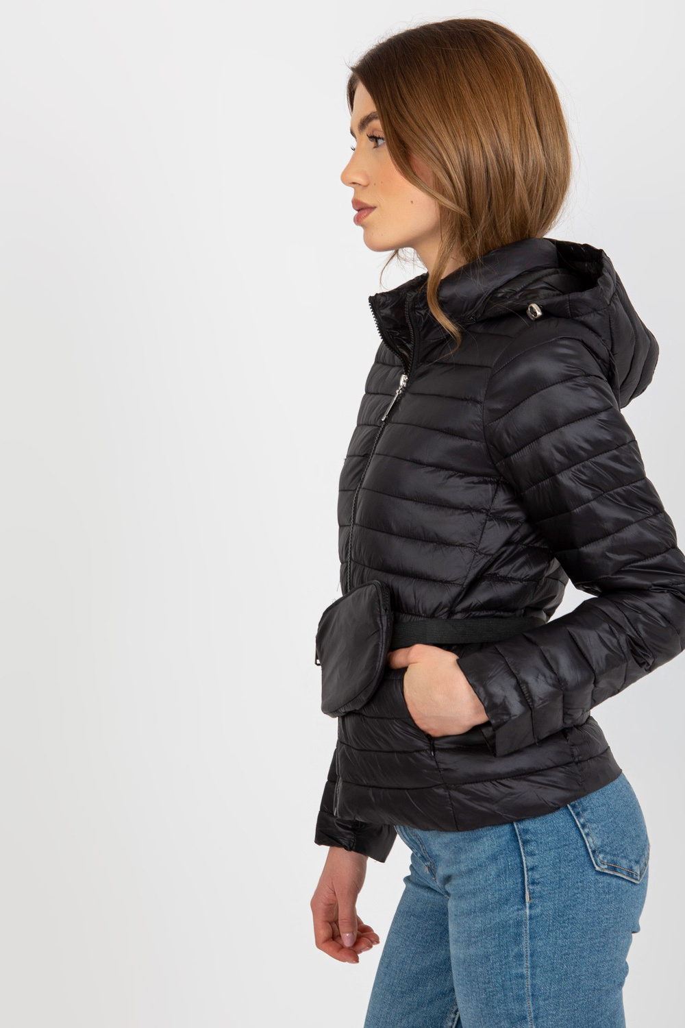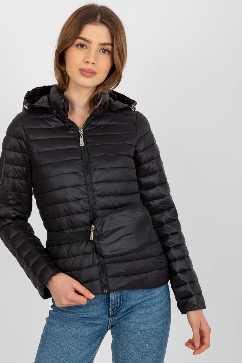 Melna pagaidu stepēta jaka ar kapuci un rokassomu.