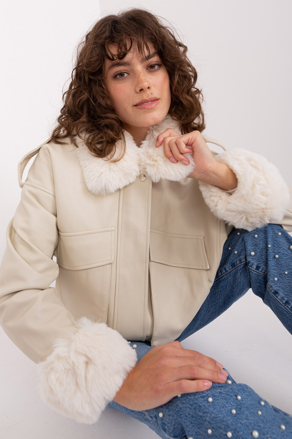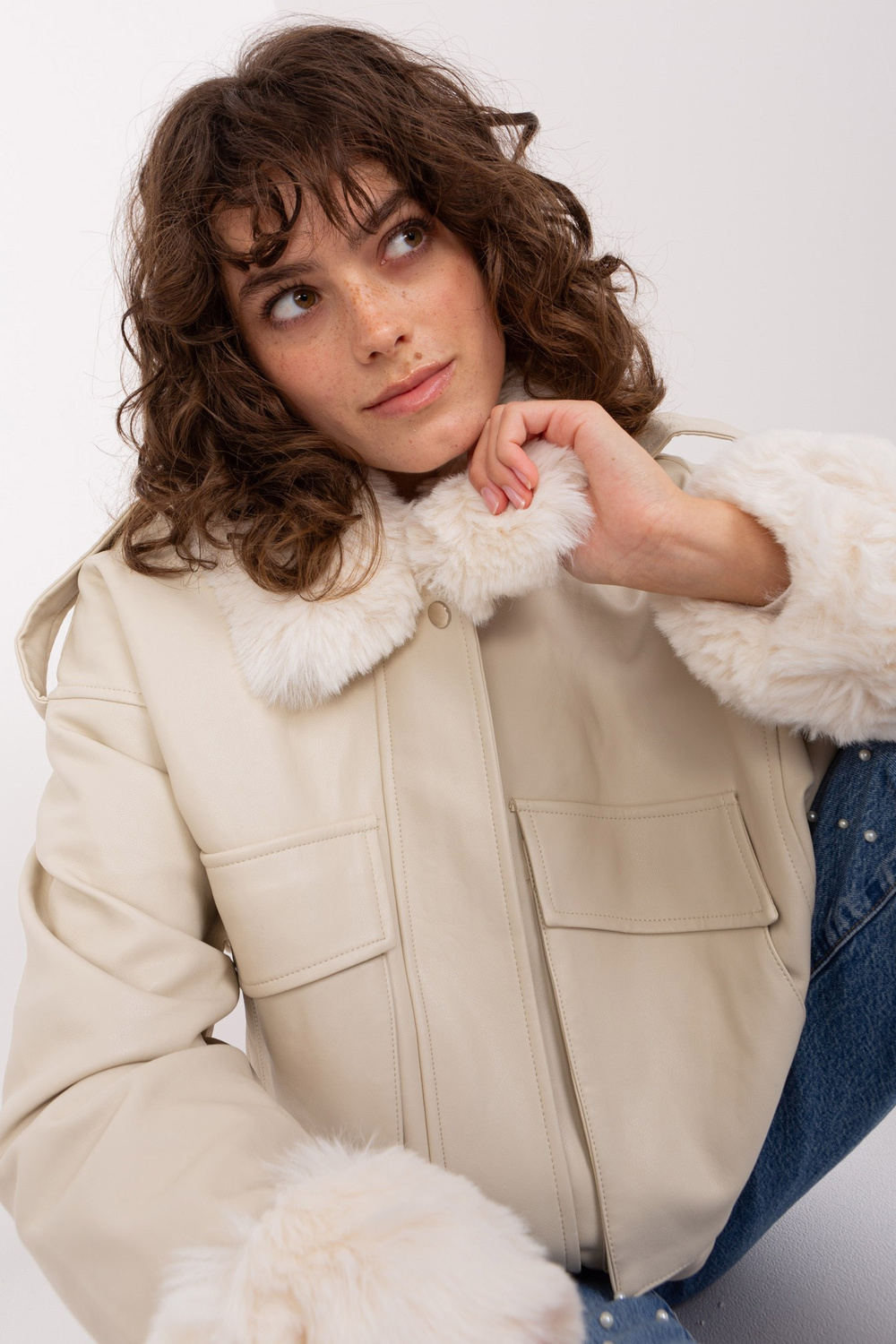 Gaiši bēša sieviešu ziemas jaka ar kabatām .