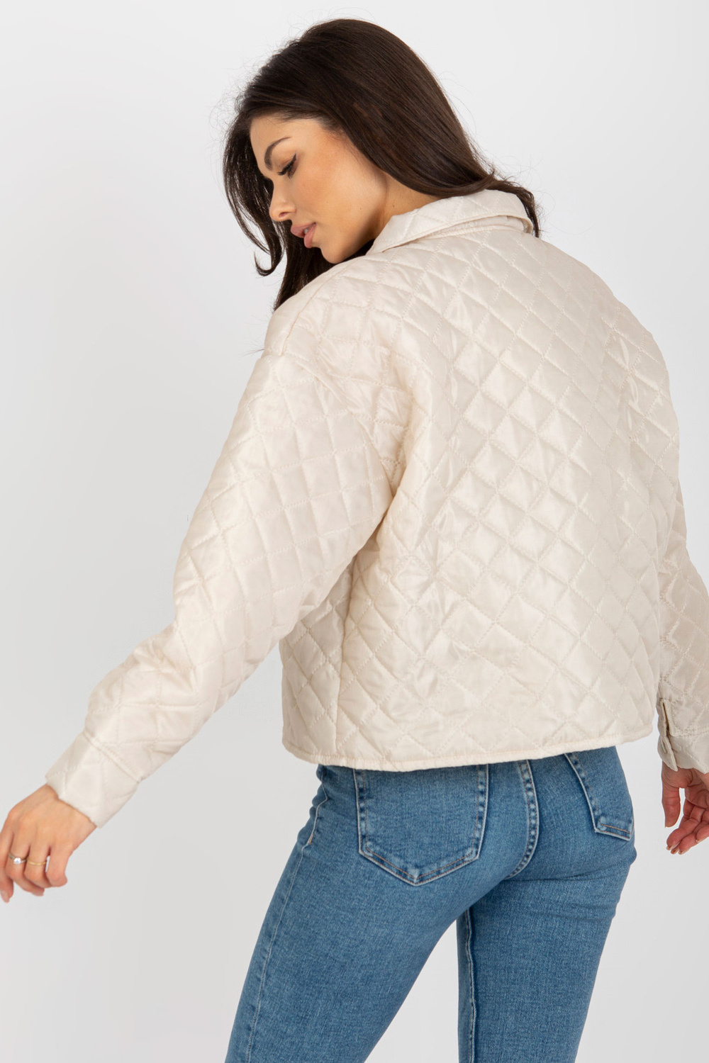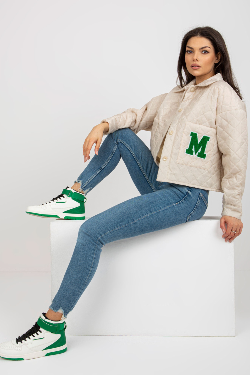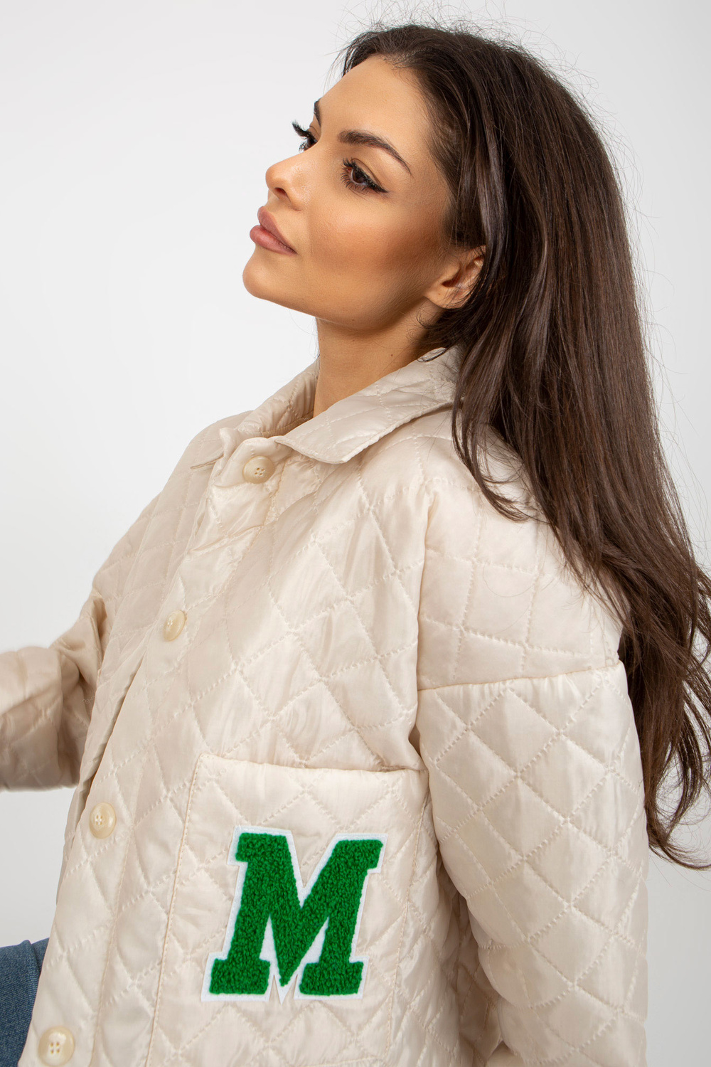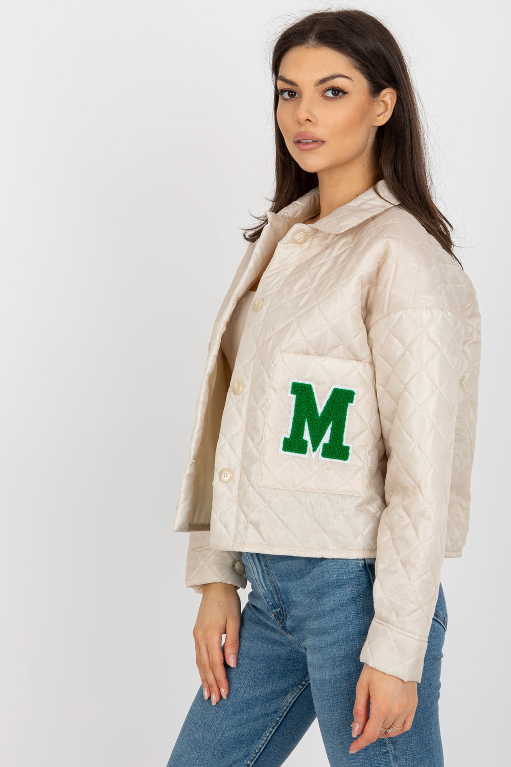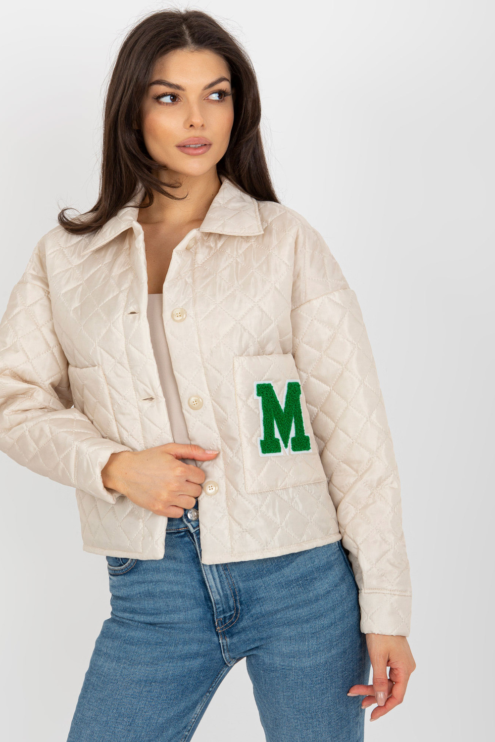 Gaiši bēša pārejas stepēta jaka ar ielāpu.