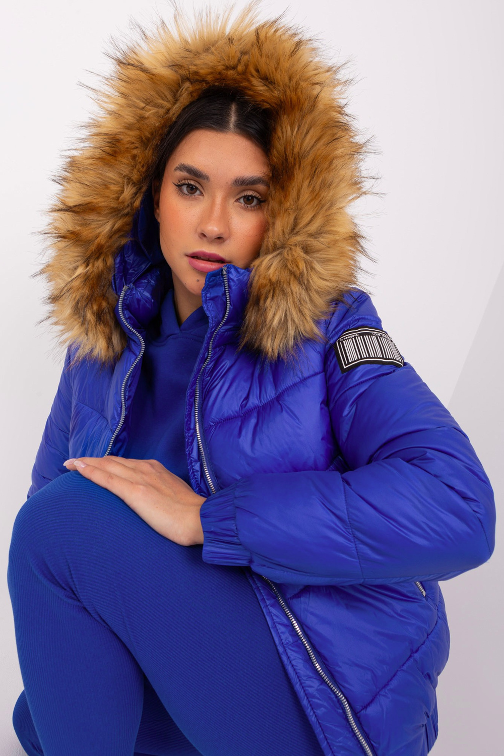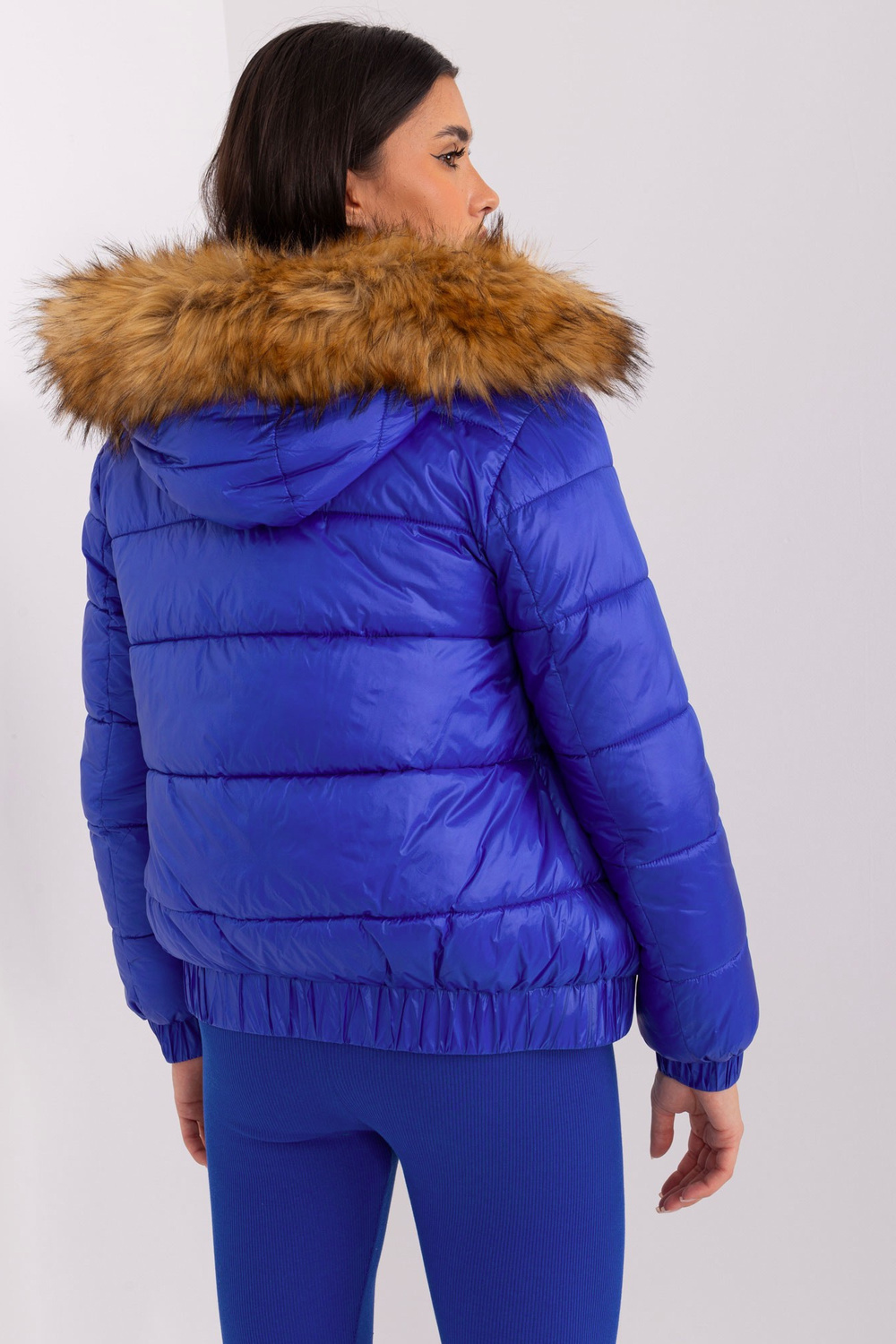 Tumši zila īsa ziemas jaka ar kapuci .