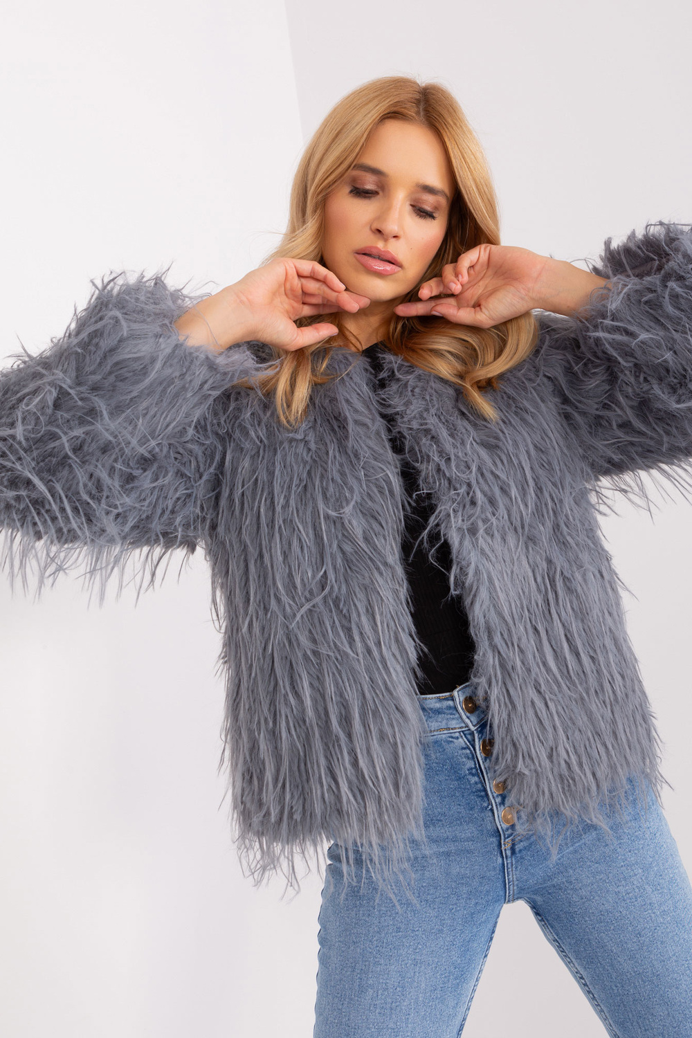 Pelēka kažokādas pārejas jaka ar kabatām .