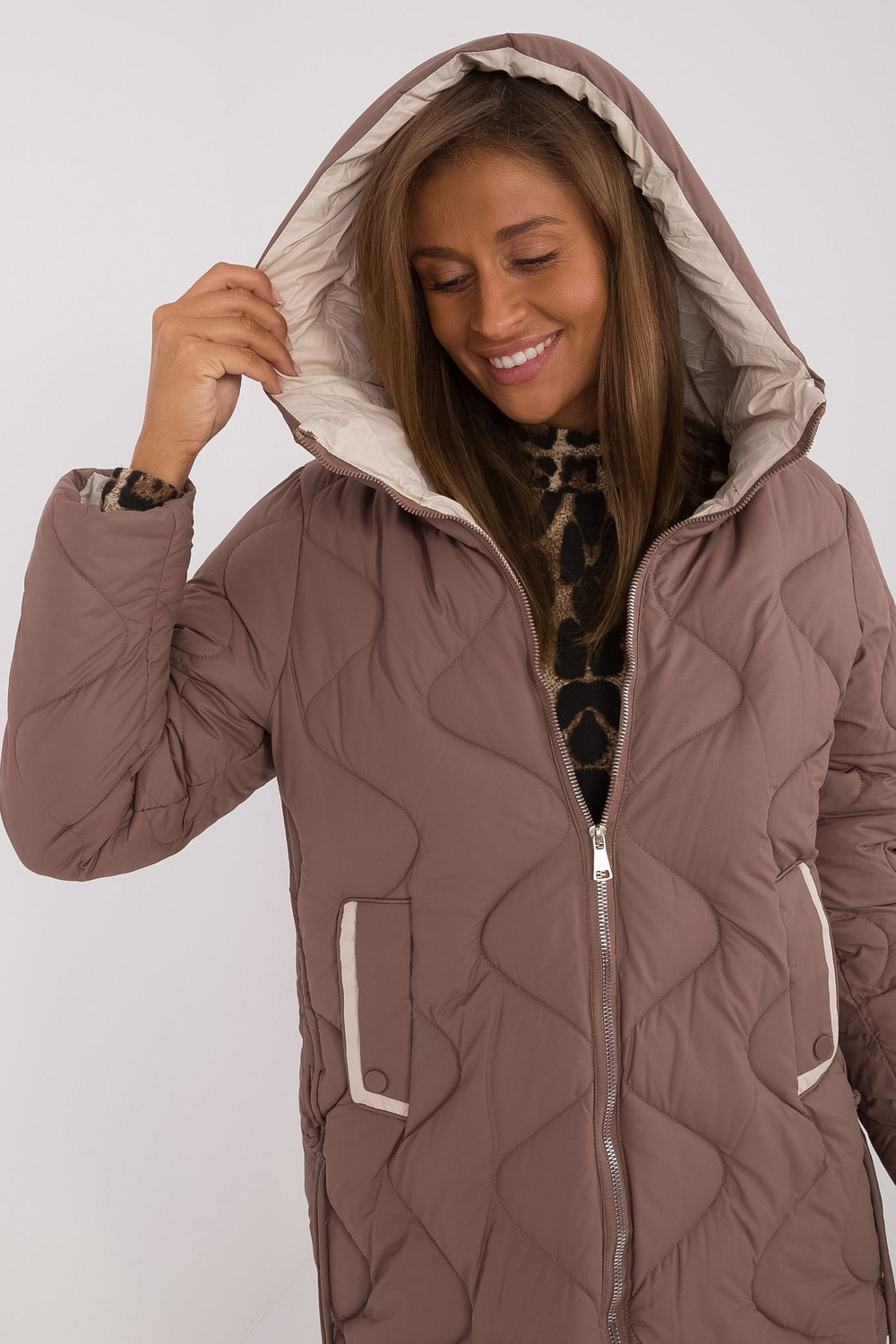 Modele valkā M izmēru. Modeles izmēri: augums 176 cm, krūtis 85 cm, viduklis 64 cm, gurni 92 cm.