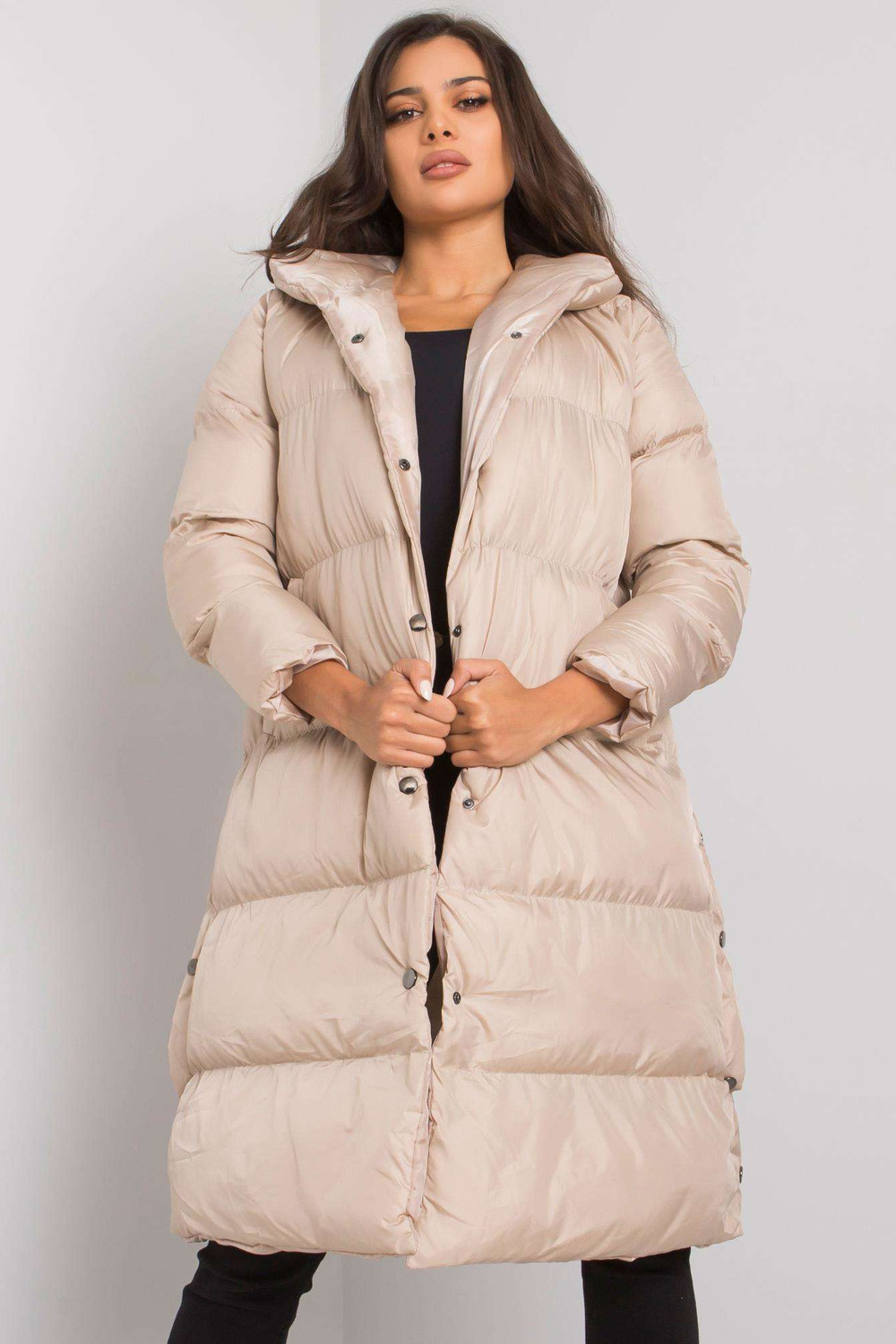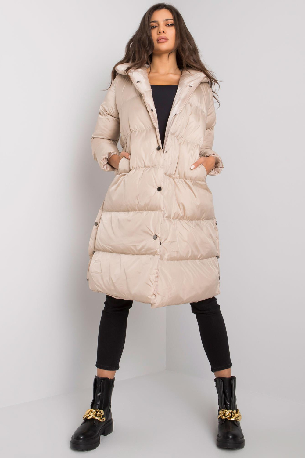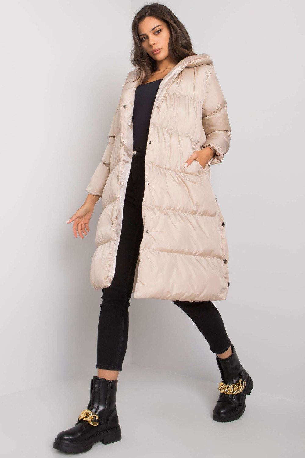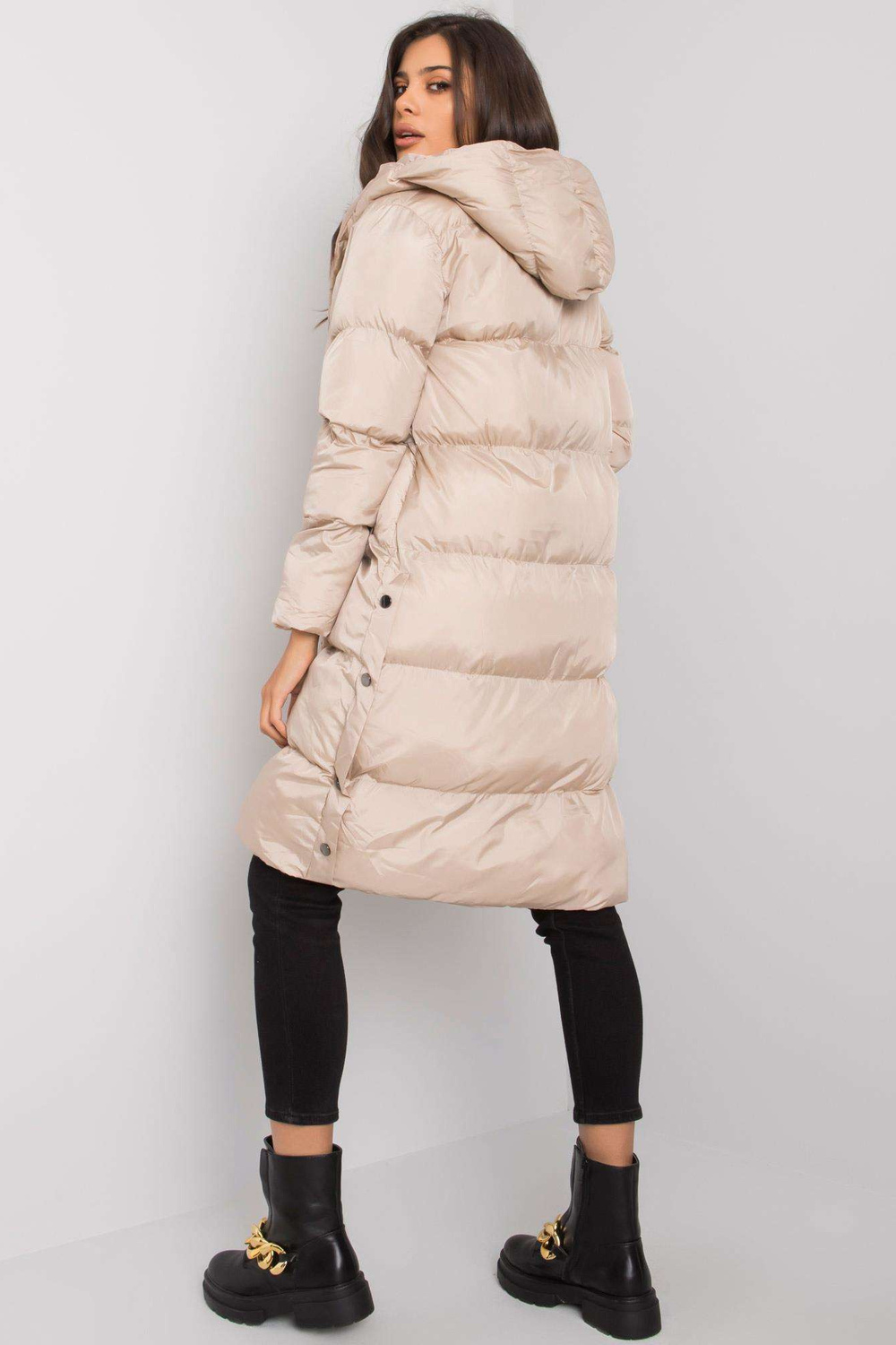 Smilšu krāsas sieviešu jaka ar kapuci.
